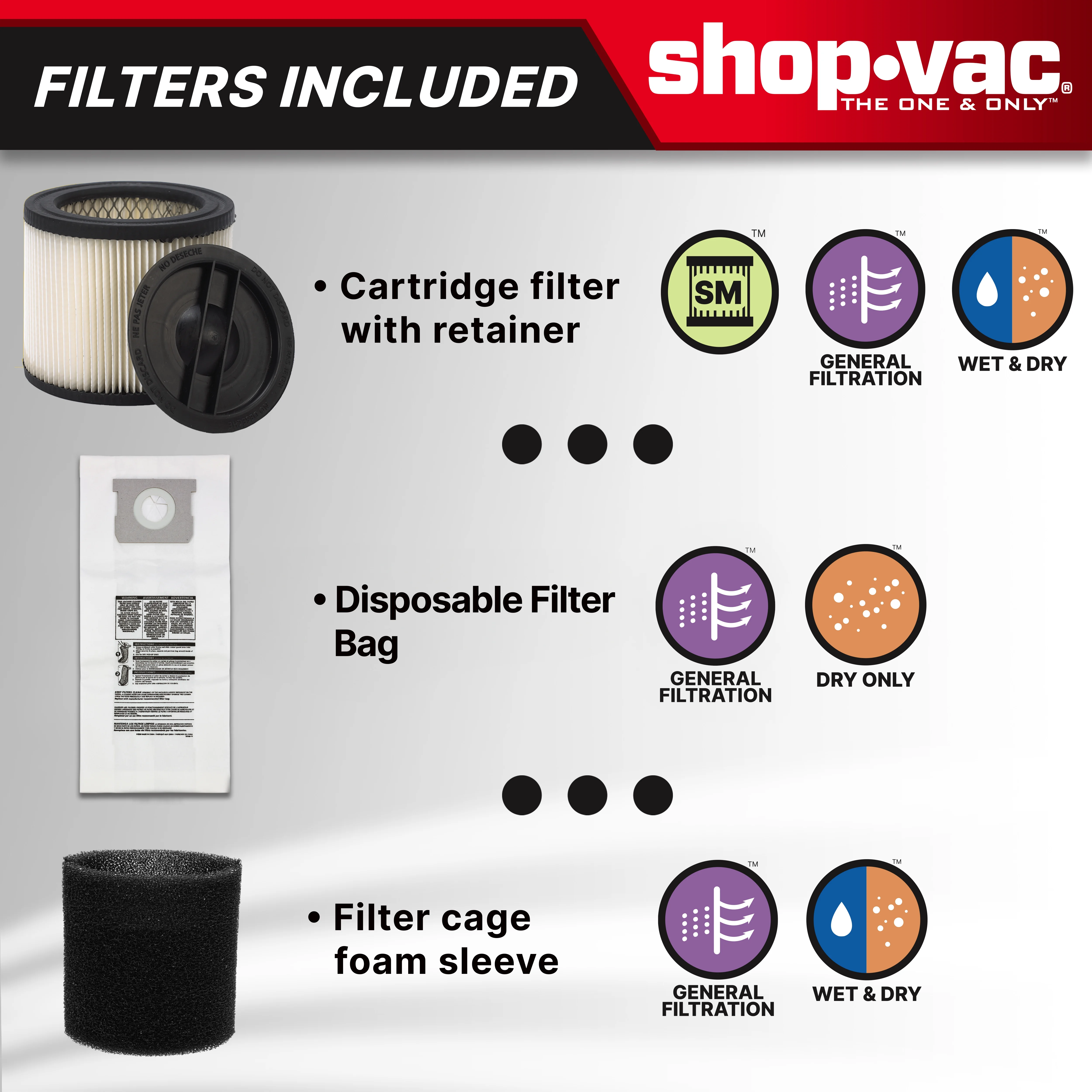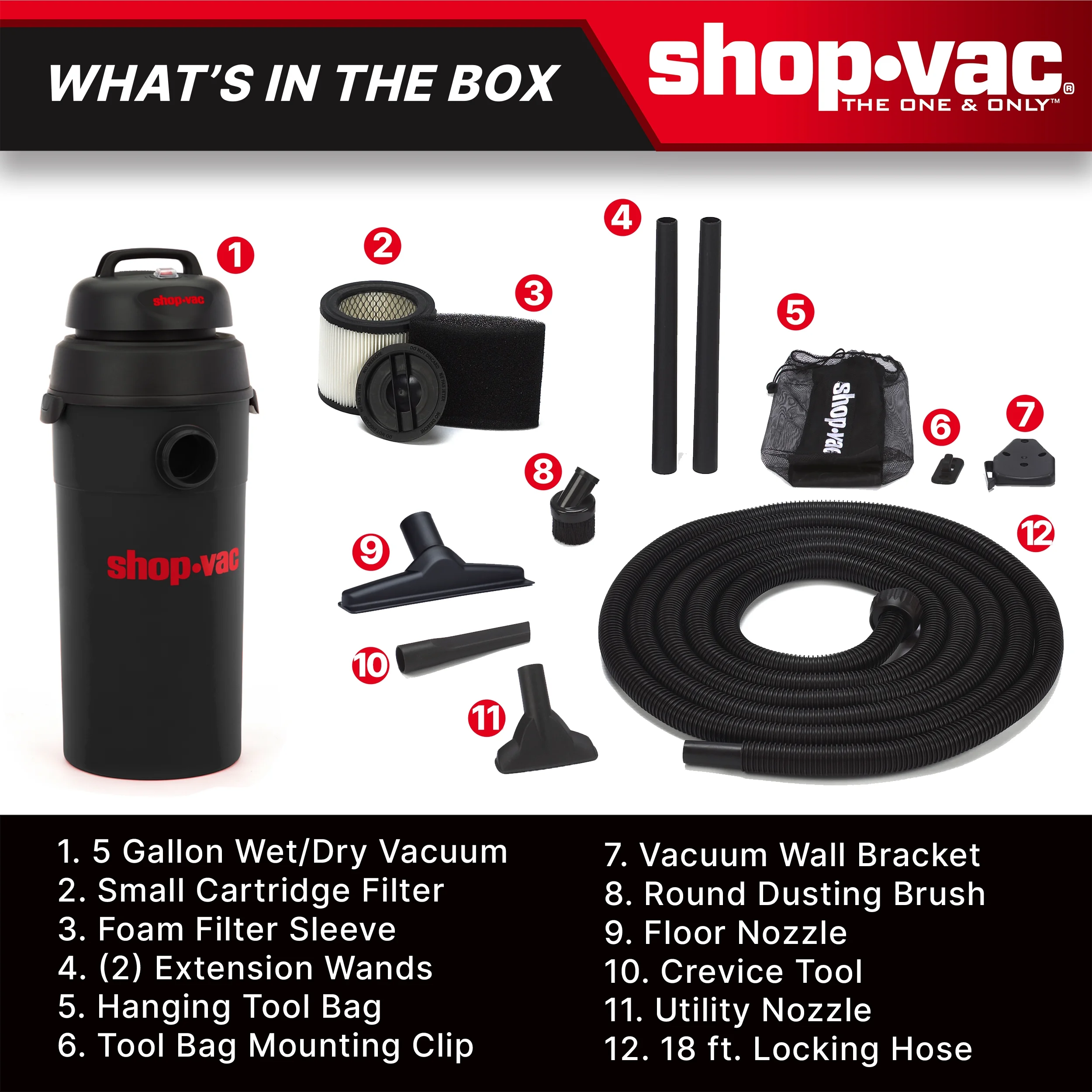 - Includes (3) extension wands, floor nozzle, round brush, gulper nozzle, crevice tool, wall mount, wall mount tool holder and filters: cartridge & foam sleeve