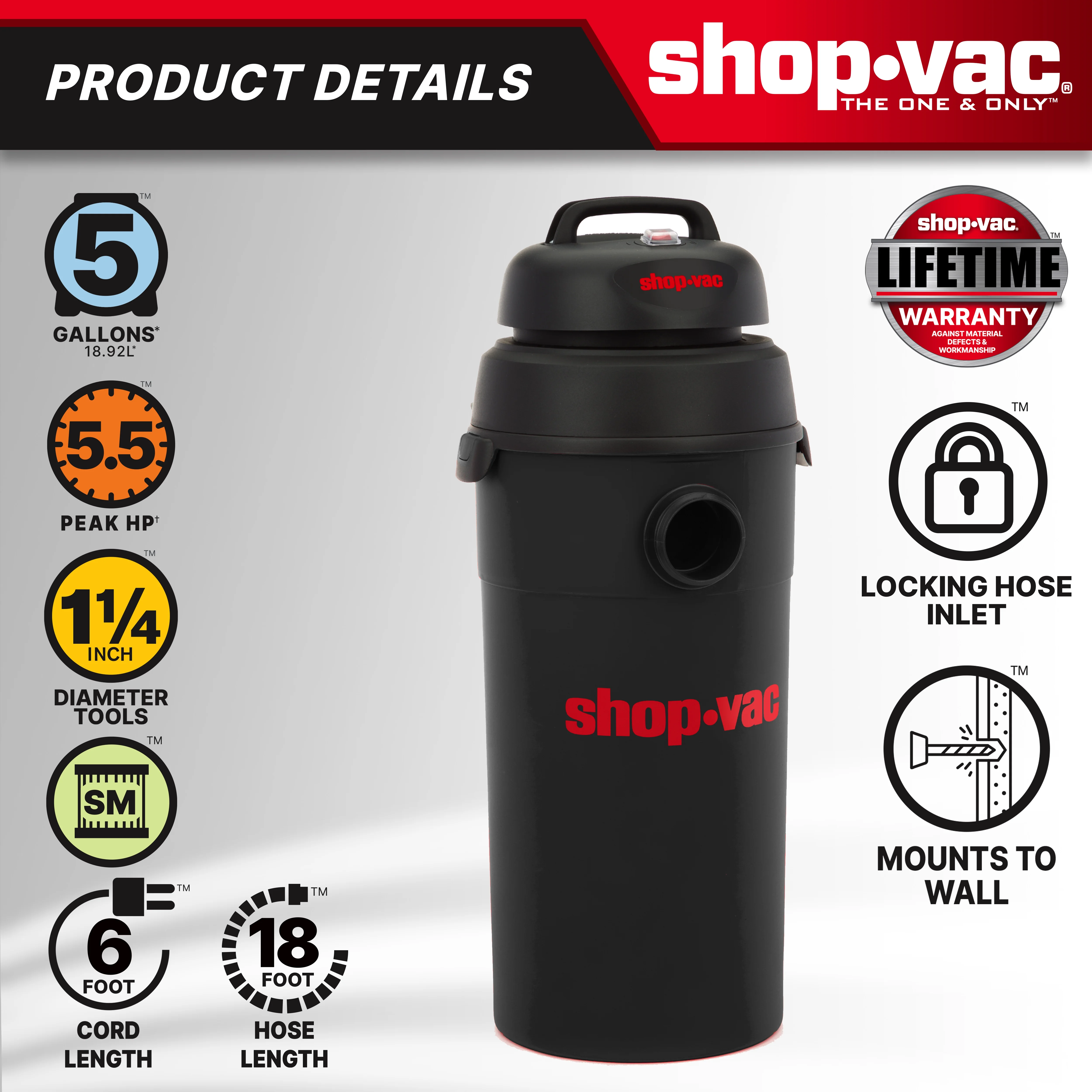 Shop Vac 952-22-36 5 Gallon 5.0 PHP Wall Wet & Dry Vac