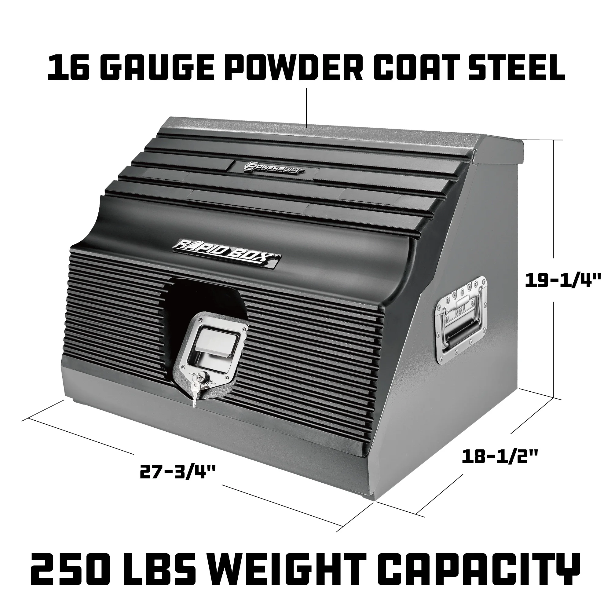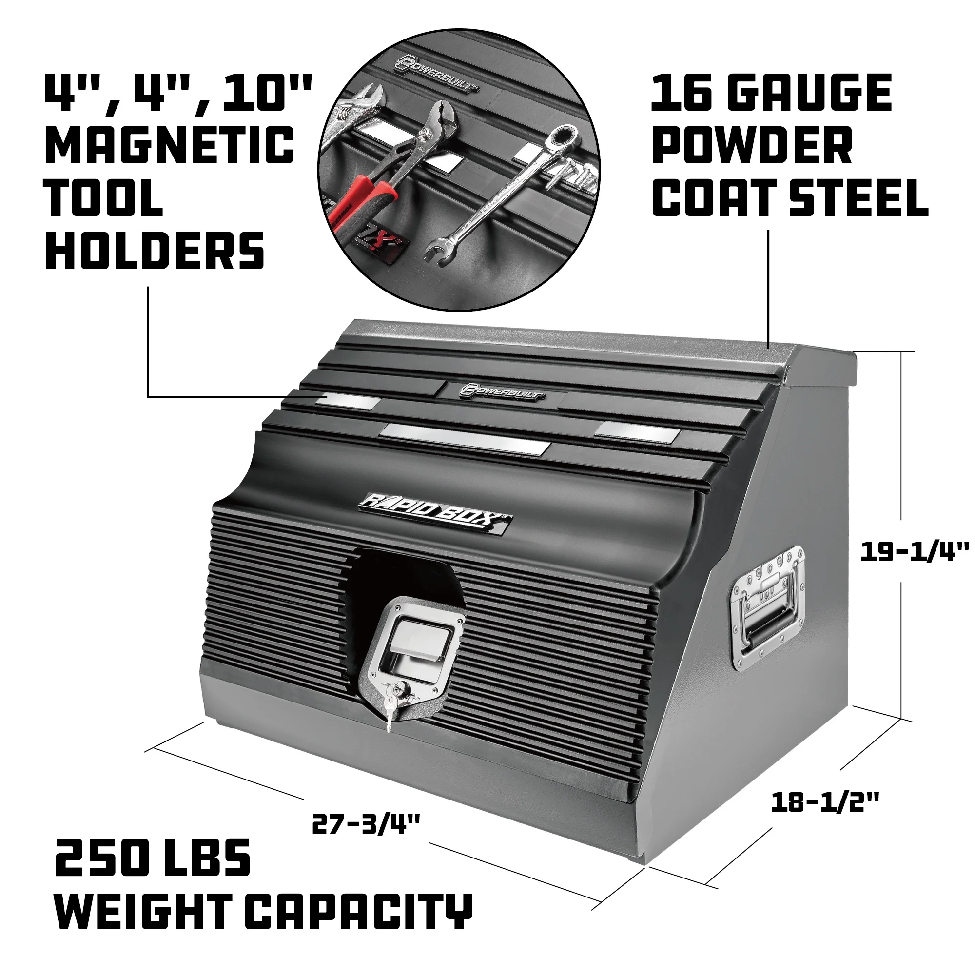 This portable 26-inch slant tool box will stand up to harsh life both on the road and in the shop. With details like fully-welded seams, premium powder-coating, chrome-plated hardware, a heavy-duty lock and a weather-sealed lid, you can confidently leave your tools in the box without worrying about rust or casual theft. With a 250 pound weight capacity and storage for up to 94 sockets, 50 combination wrenches, 9 screwdrivers, 19 ratchets or extensions, extra open storage space for gloves, fluids and other gear, the box also includes a removable socket tray to offer even more versatility and flexibility on the job.SAVE TIME: The front-opening lid and stair-step interior make it easy to identify and grab the tool you need when you need it, and you can use the removable socket tray to bring your tools even closer to the jobsite