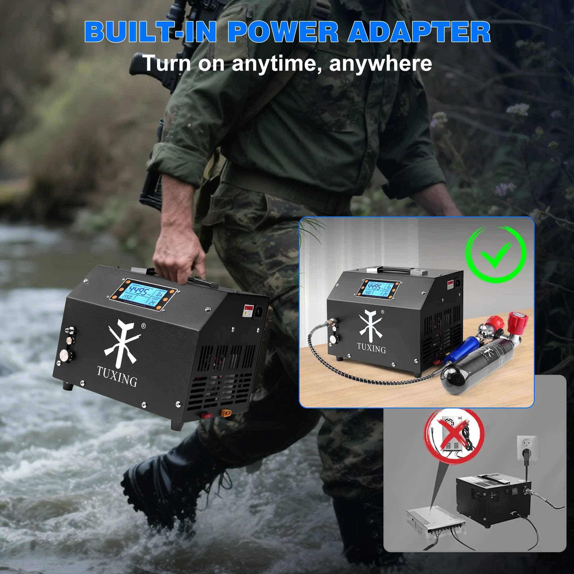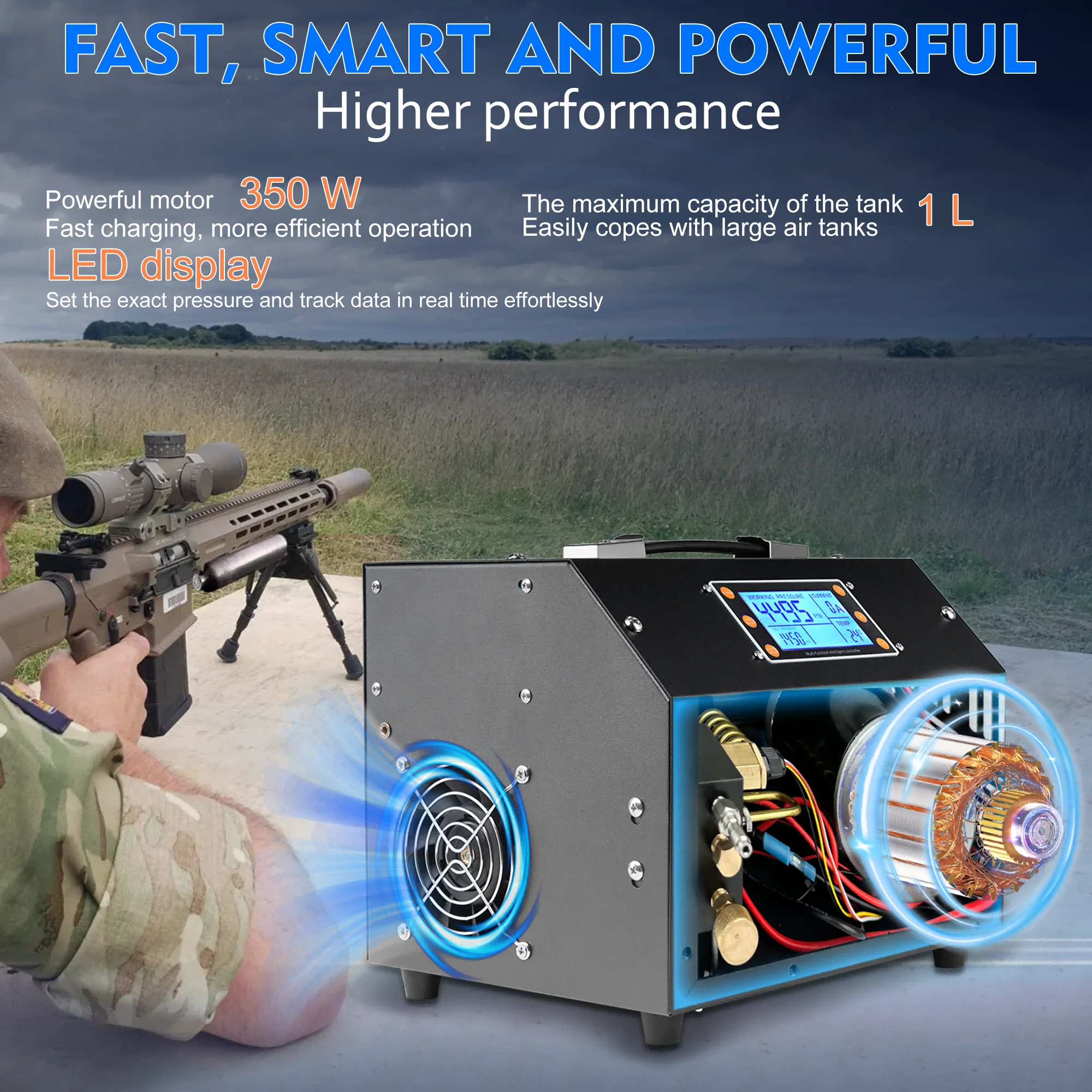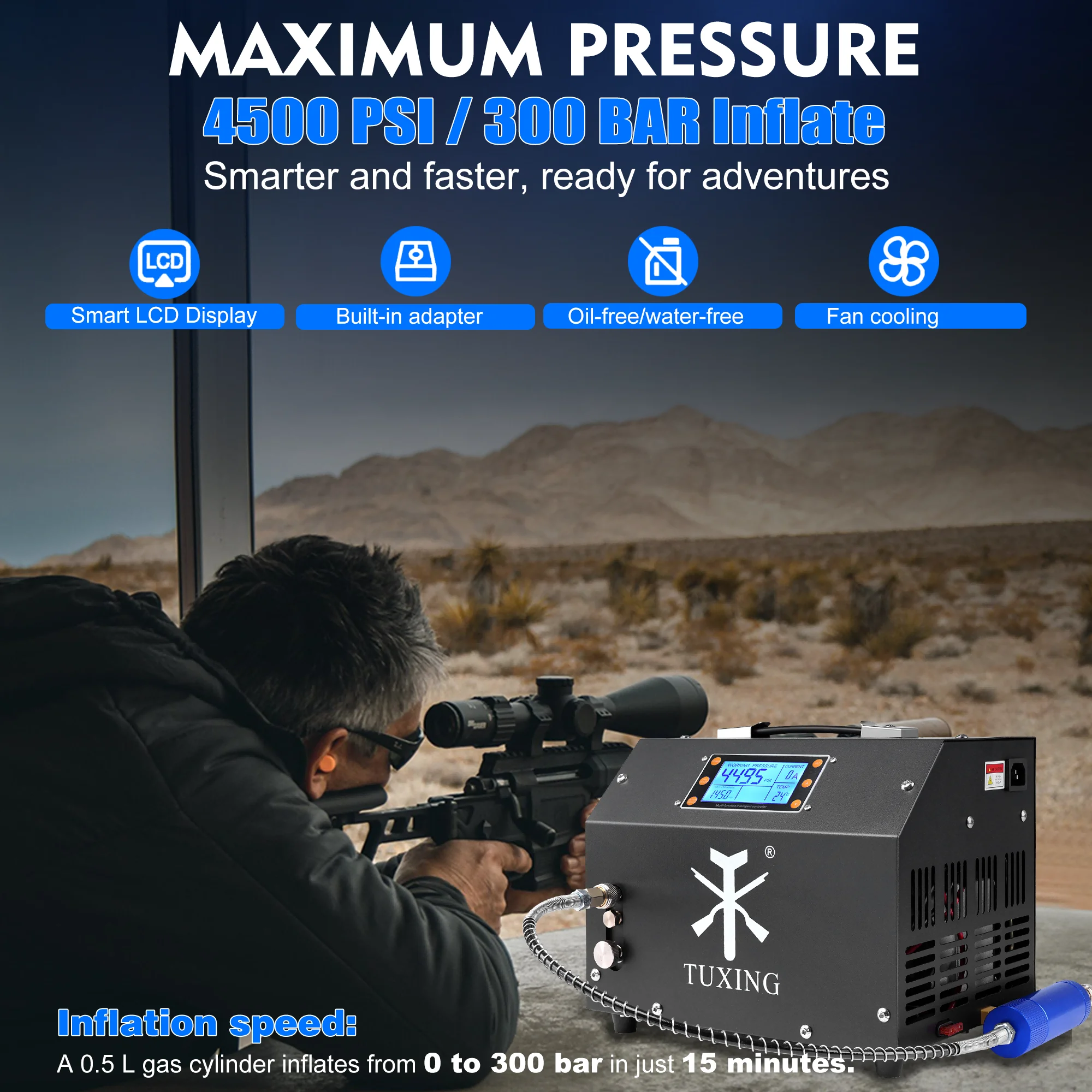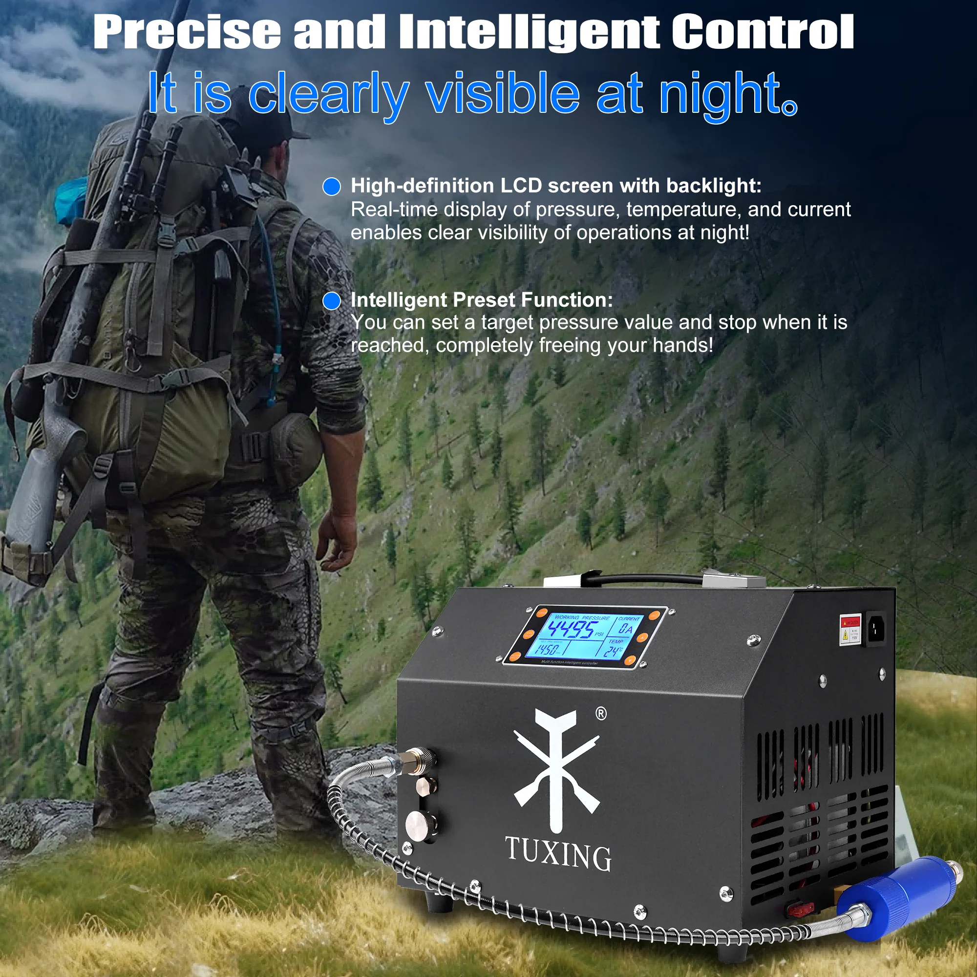 - Clear LCD Display for Night Hunting: High-visibility screen tracks real-time pressure & settings during low-light conditions, perfect for 4500 psi PCP air compressor operation.