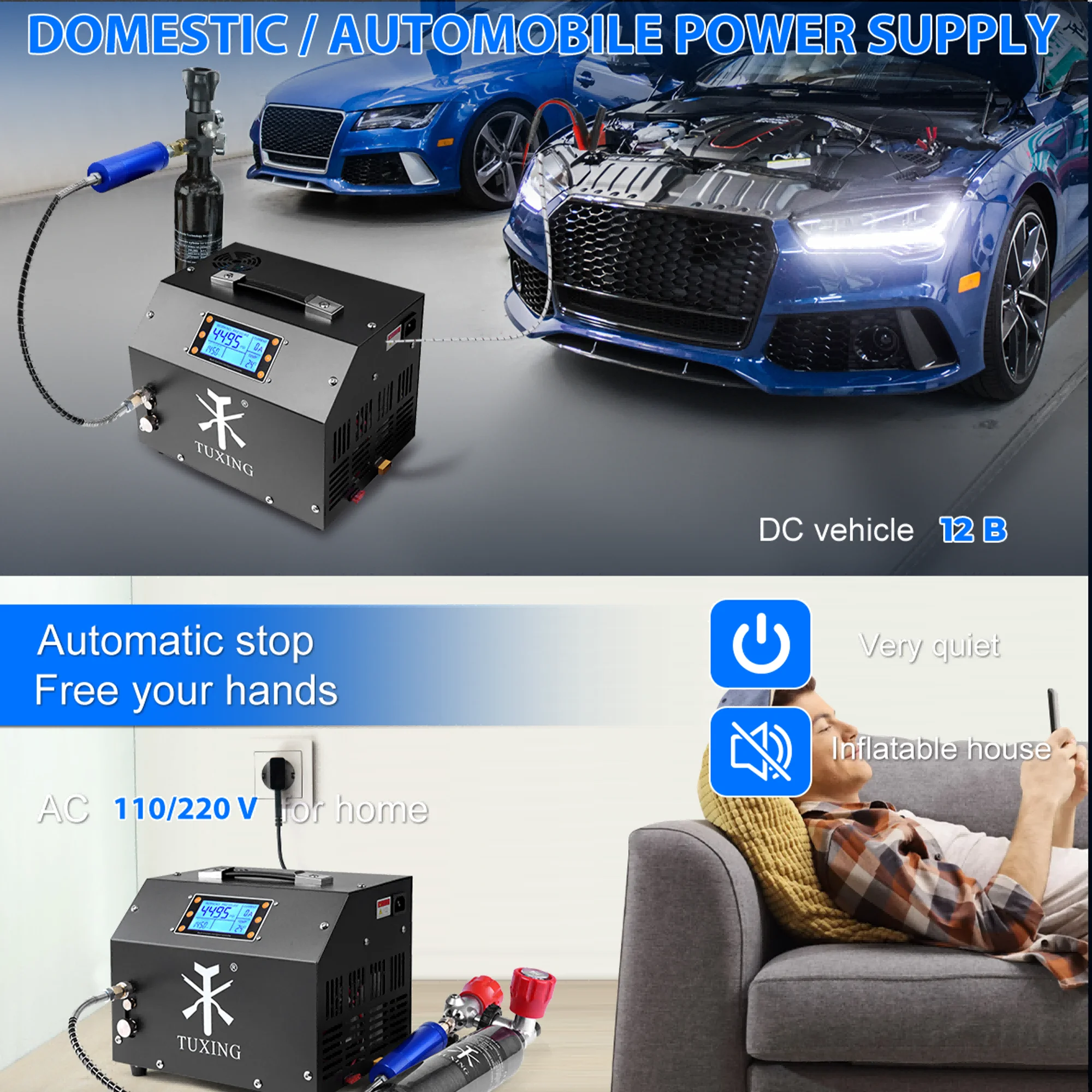 - Fast 15-Min 0-4500PSI Auto-Stop: Inflate 0.5L tanks in minutes. Automatically shuts off at preset pressure to prevent overfilling (max 30MPa/4500psi).