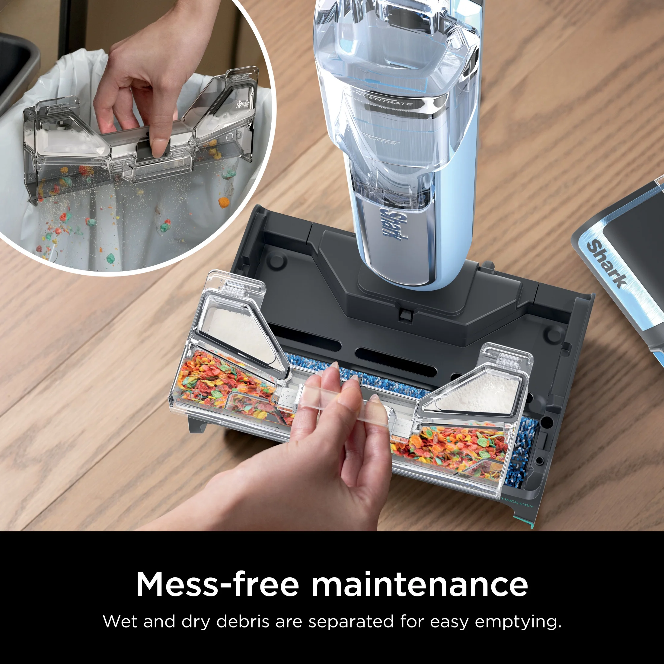 - MESS-FREE MAINTENANCE: Wet and dry debris is separated and trapped in the quick-empty tray that easily detaches and empties in seconds, for easy disposal.