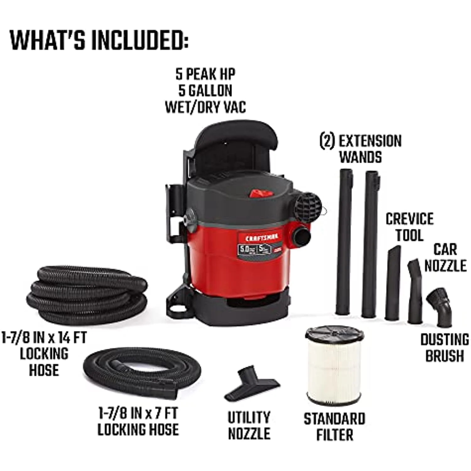 - ACCESSORIES INCLUDED: 2 POS-I-LOCK Hoses (1-7/8 in. x 7 ft. and 1-7/8 in. x 14 ft.) for 21 feet of reach, Utility Nozzle, Crevice Tool, Car Nozzle, Dusting Brush, 2 Extension Wands, and Qwik Lock Filter