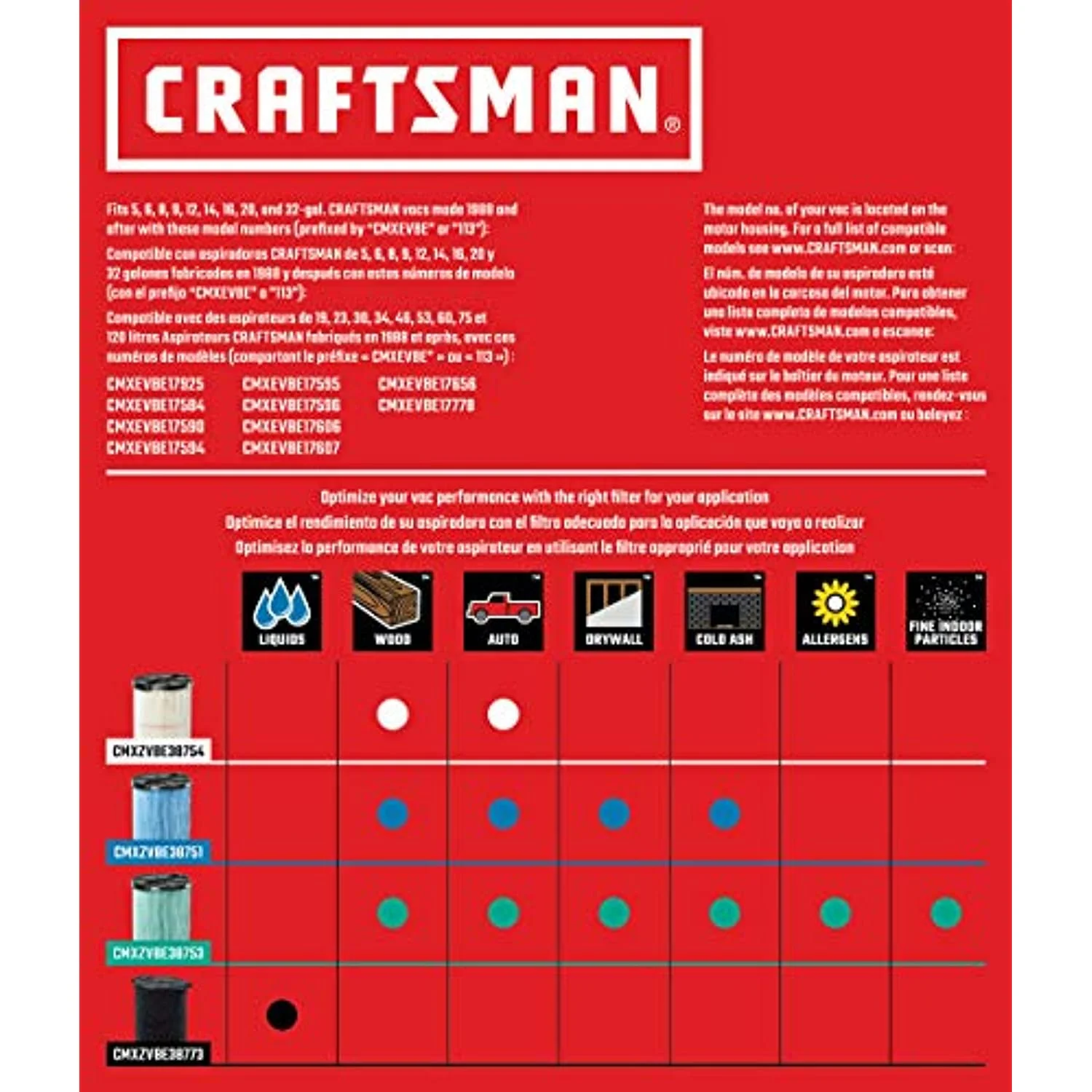 - COMPATIBLE FILTERS: CMXZVBE38751, CMXZVBE38753, CMXZVBE38754, CMXZVBE38773, CMXZVBE38755, CMXZVBE38776, CMXZVBE38777, CMXZVBE38778, and CMXZVBE38779 Genuine CRAFTSMAN Vac Filters