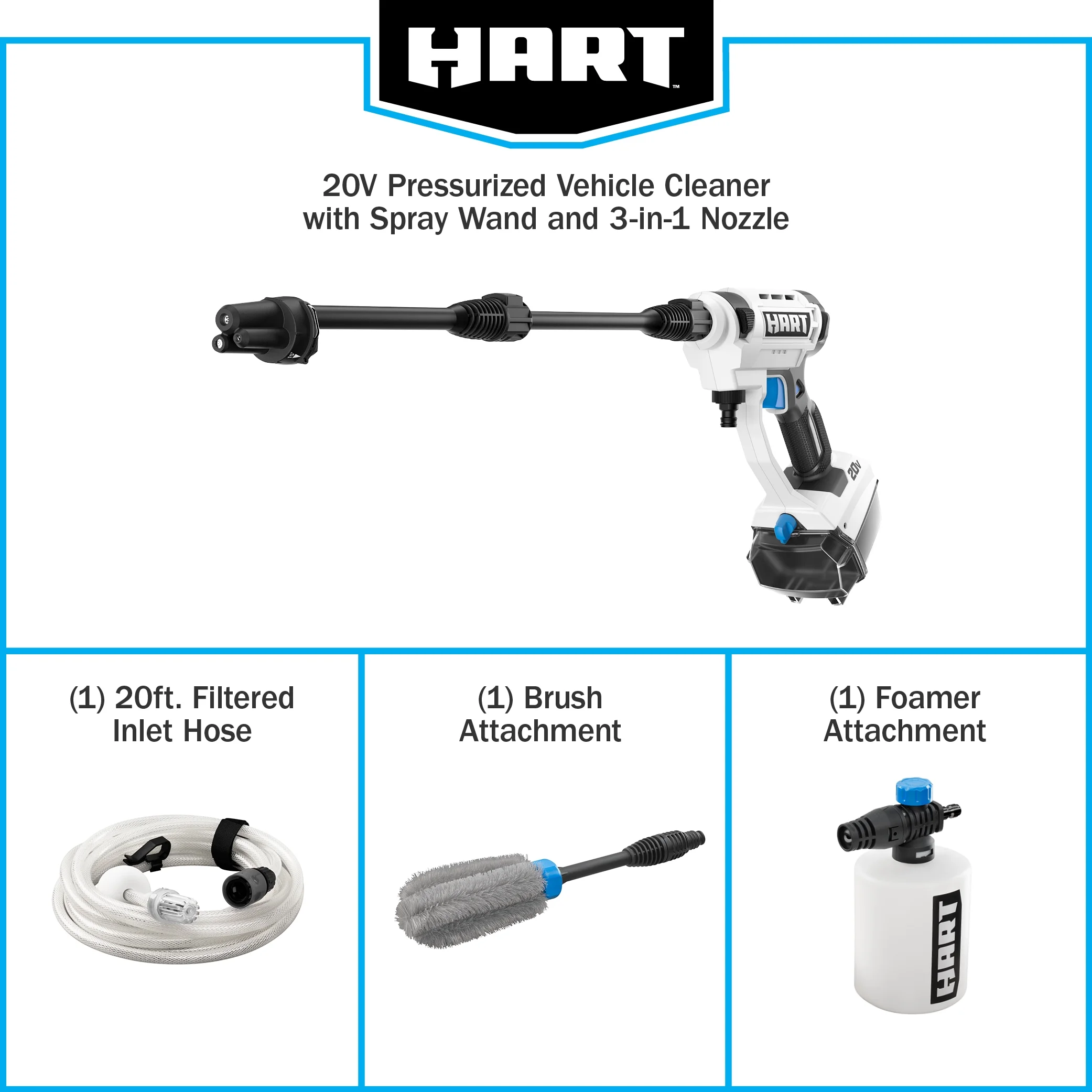 - Includes: Pressurized Vehicle Cleaner, 20 ft. Filtered Inlet Hose, Spray Wand, 3-in-1 Nozzle, Brush Attachment, Foamer Attachment and Operator��s Manual.