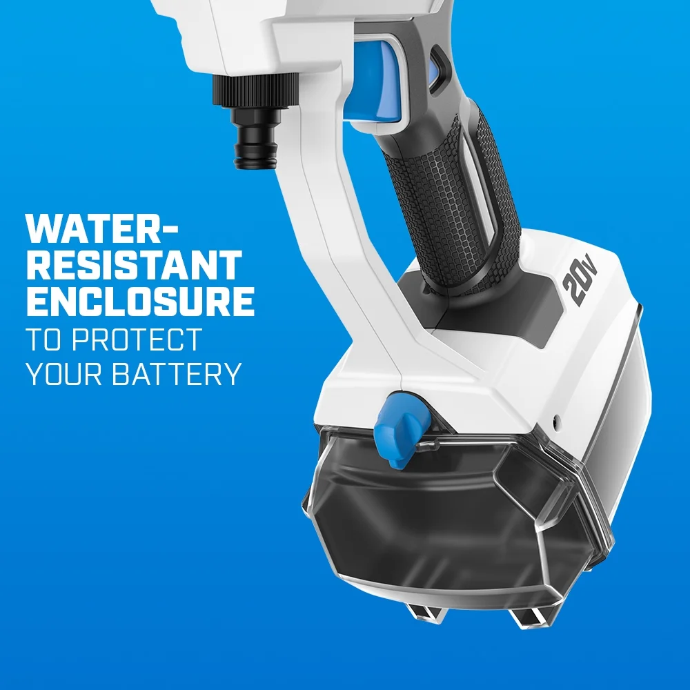 - Battery: 20V Lithium-Ion PSI: 320 GPM: 0.8 Weight: 4 lbs.