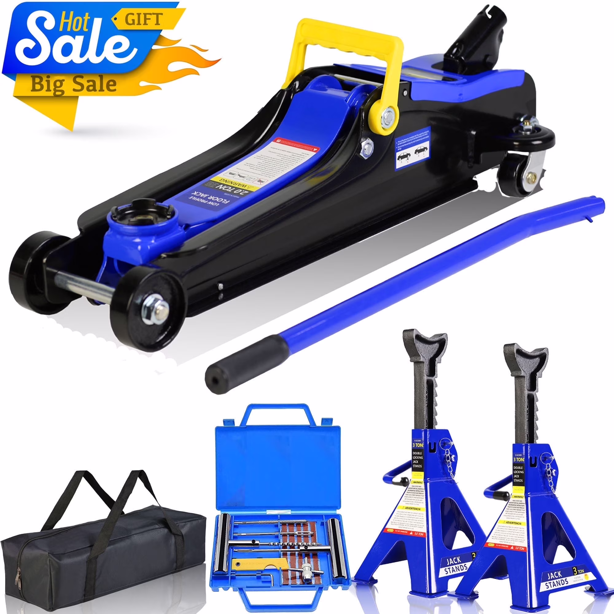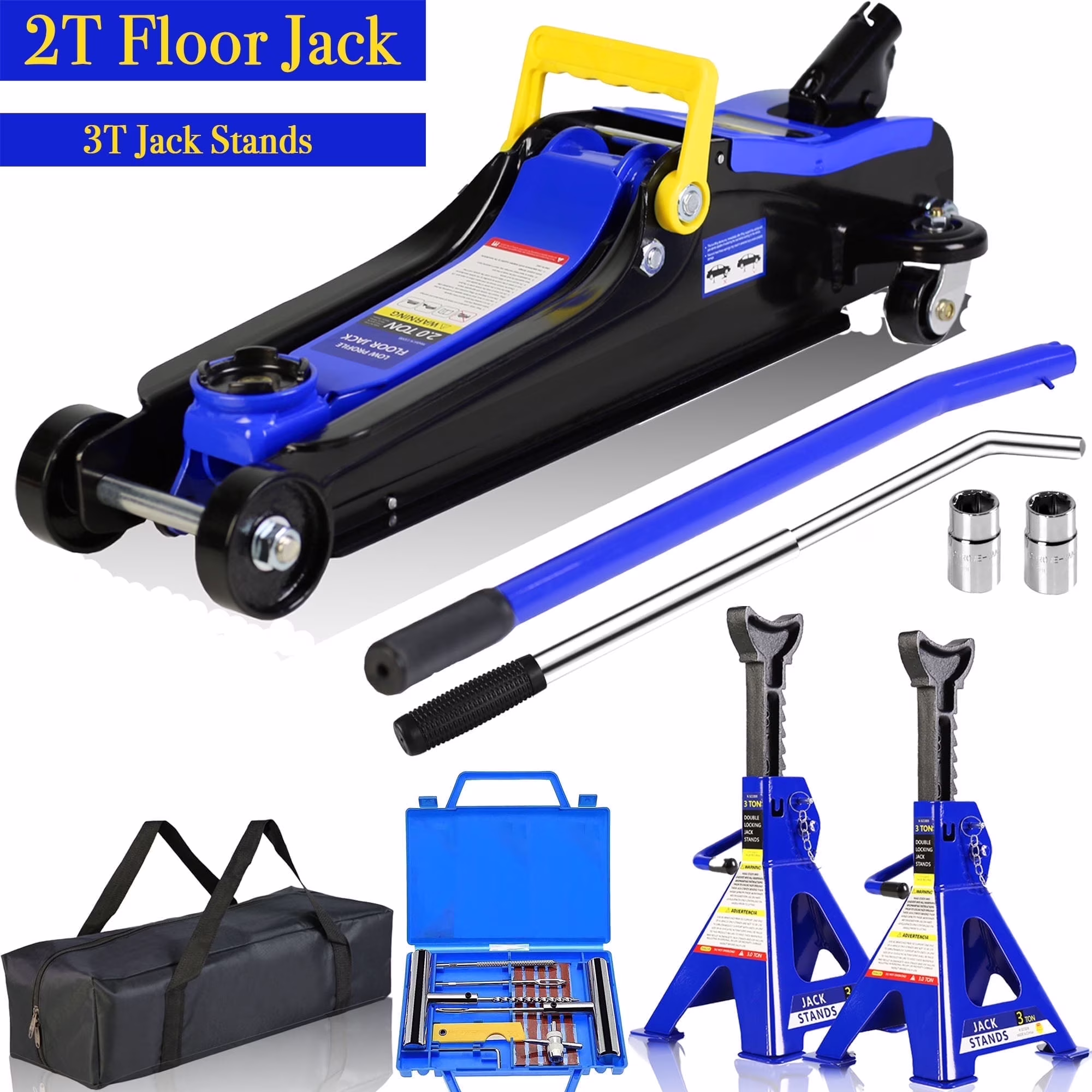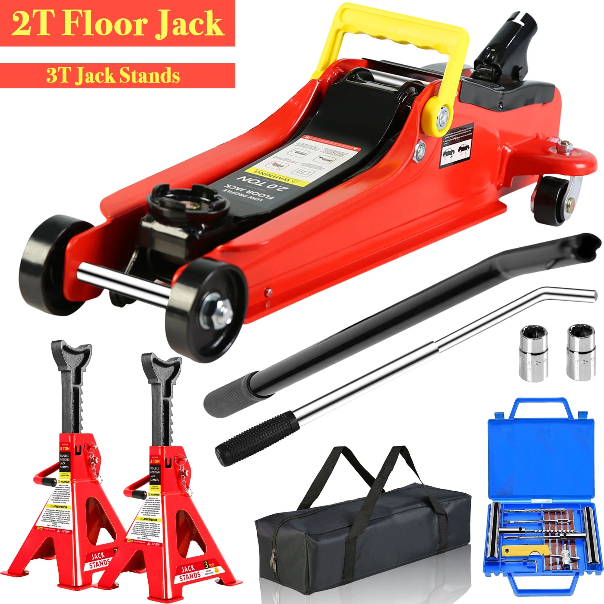 - ??2T FLOOR JACK + 3T JACK STANDS 2-piece + 12PC DELUXE TIRE REPAIR KIT.Hydraulic garage jack is constructed with heavy-duty steel, providing long-term quality and durability for everyday and industrial use.