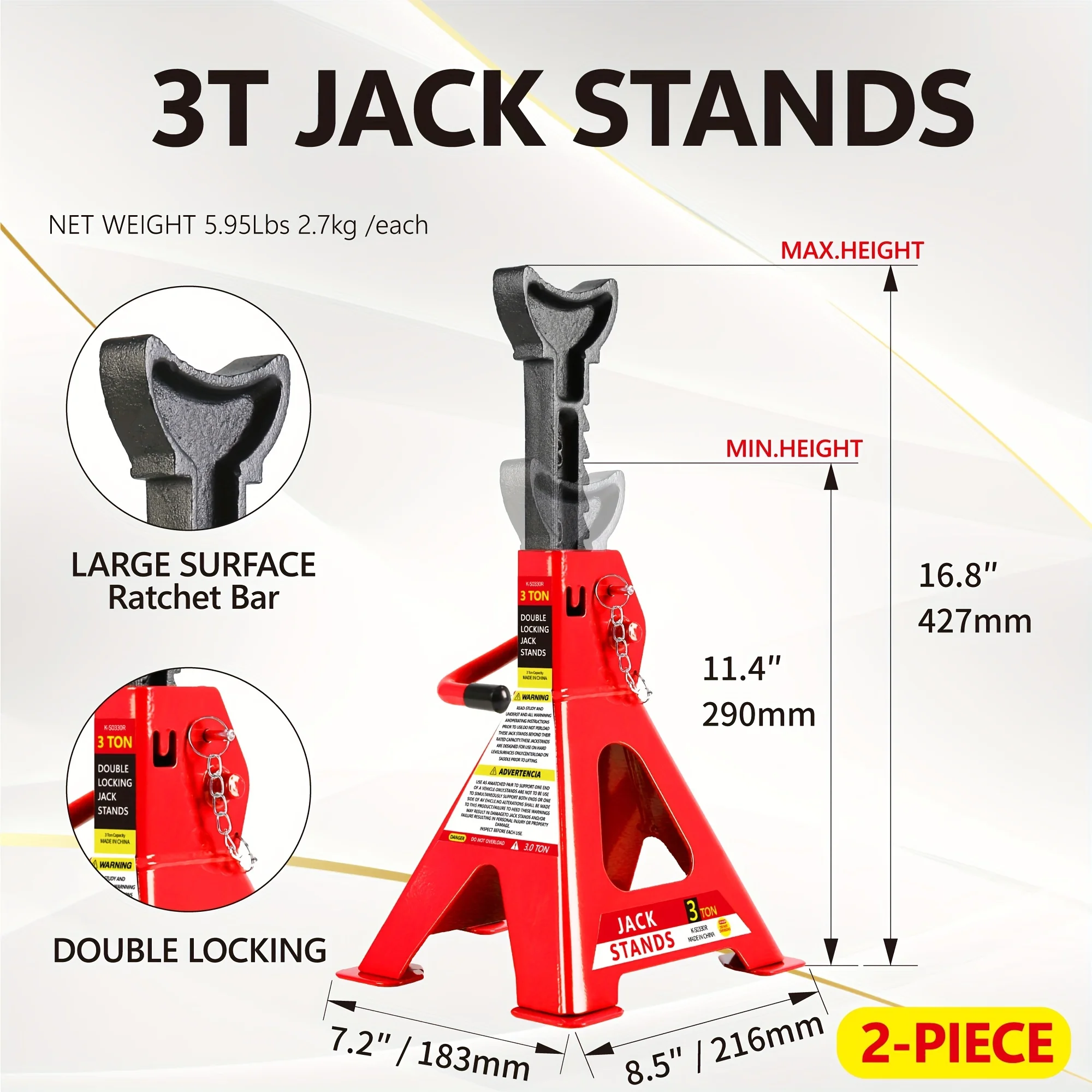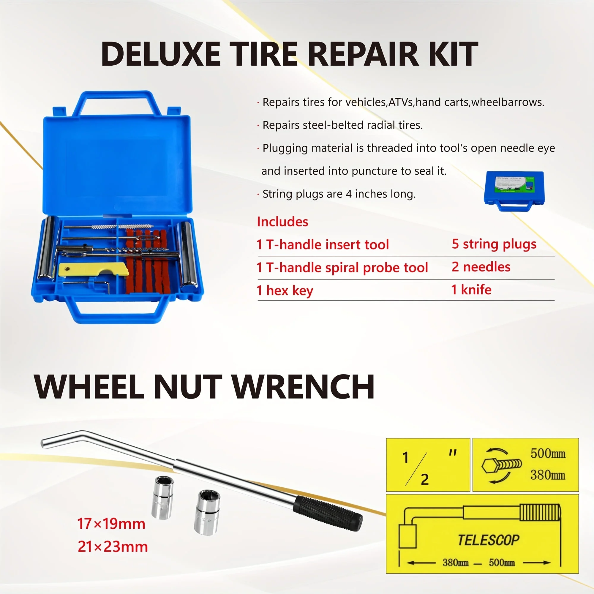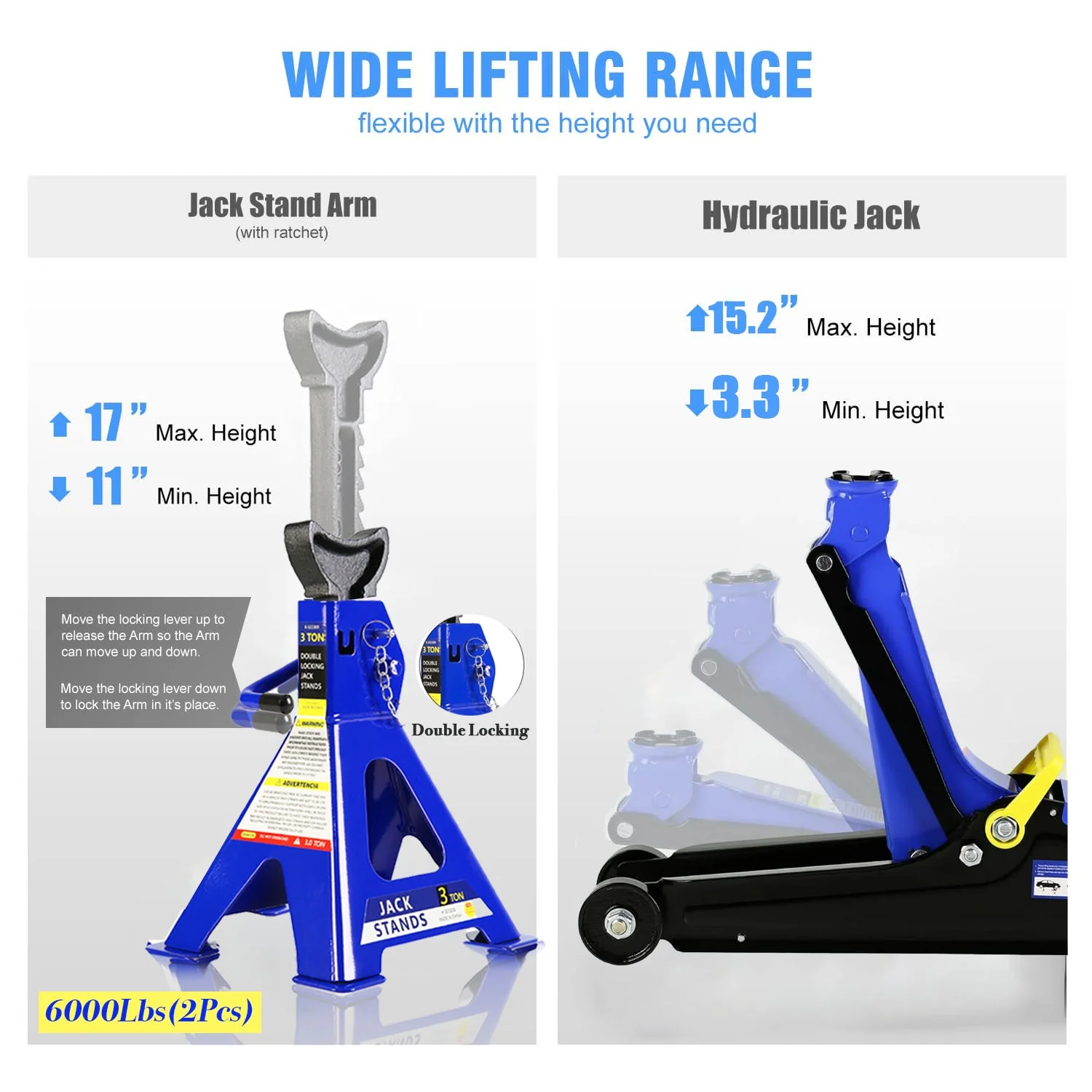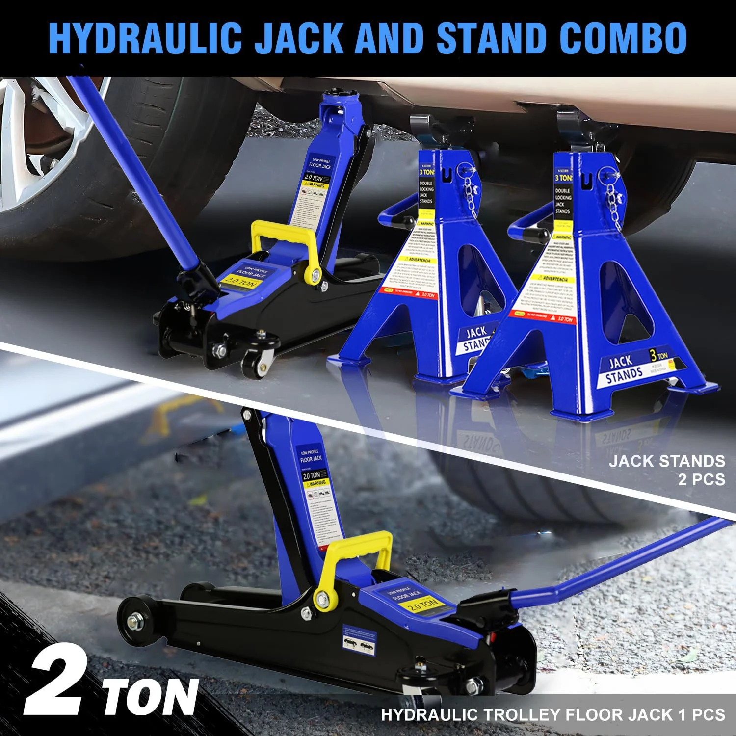 - ??2T FLOOR JACK + 3T JACK STANDS 2-piece + 12PC DELUXE TIRE REPAIR KIT.Hydraulic garage jack is constructed with heavy-duty steel, providing long-term quality and durability for everyday and industrial use.