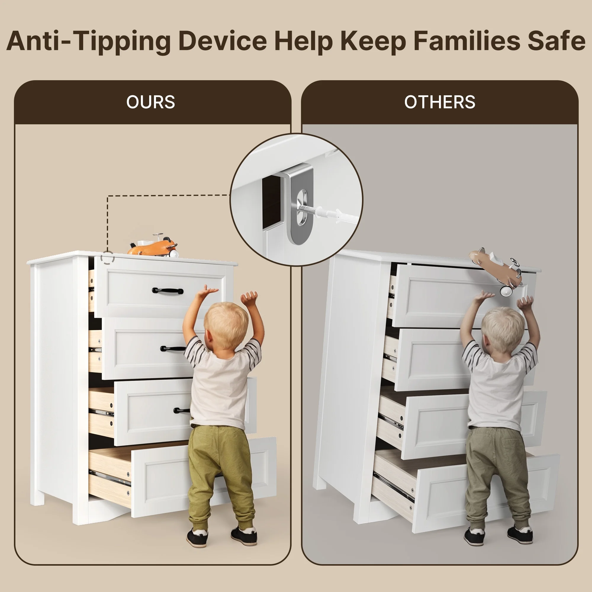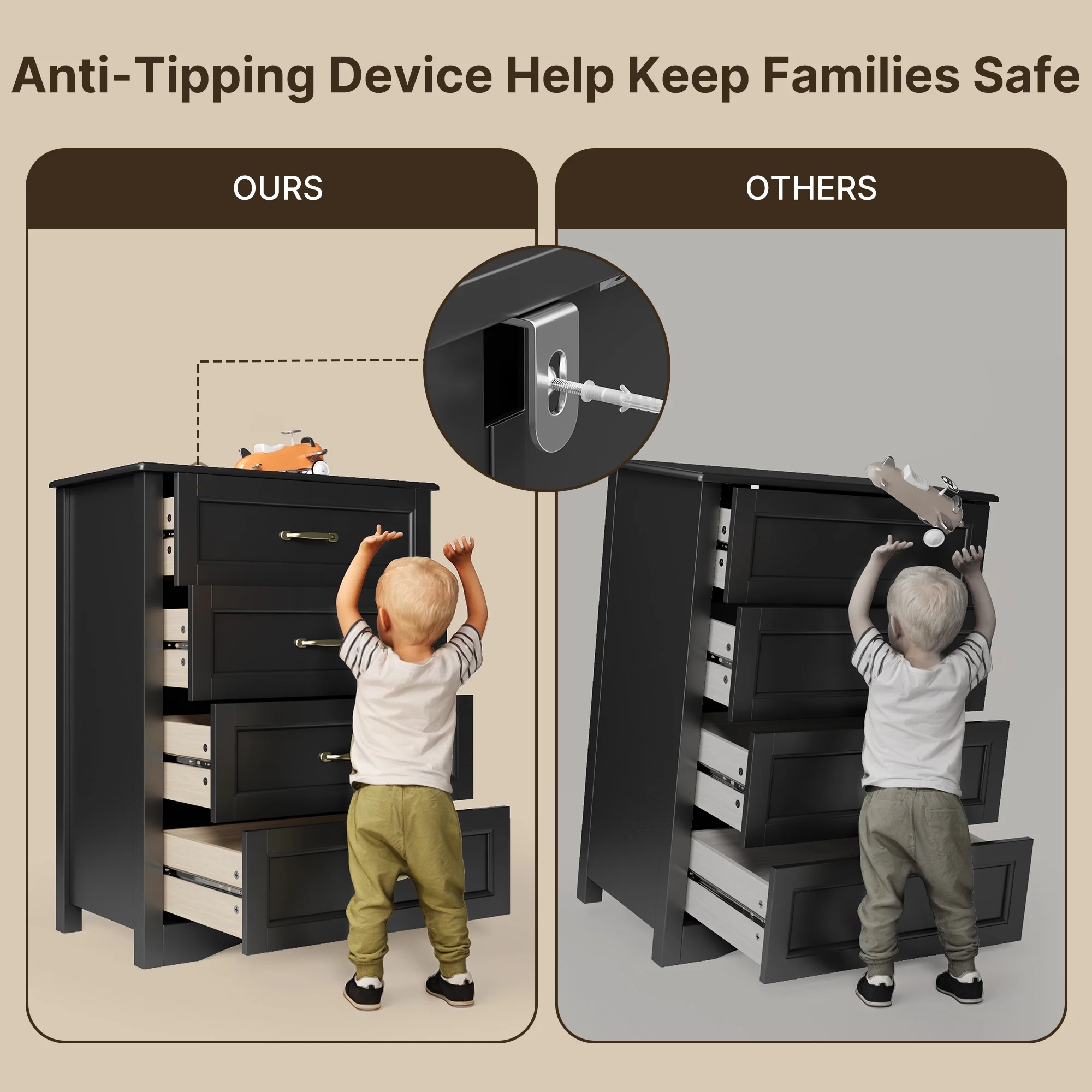 - ASTM F2057 certified tilt-resistant design - Includes wall anchors and rounded corners for protection and safety