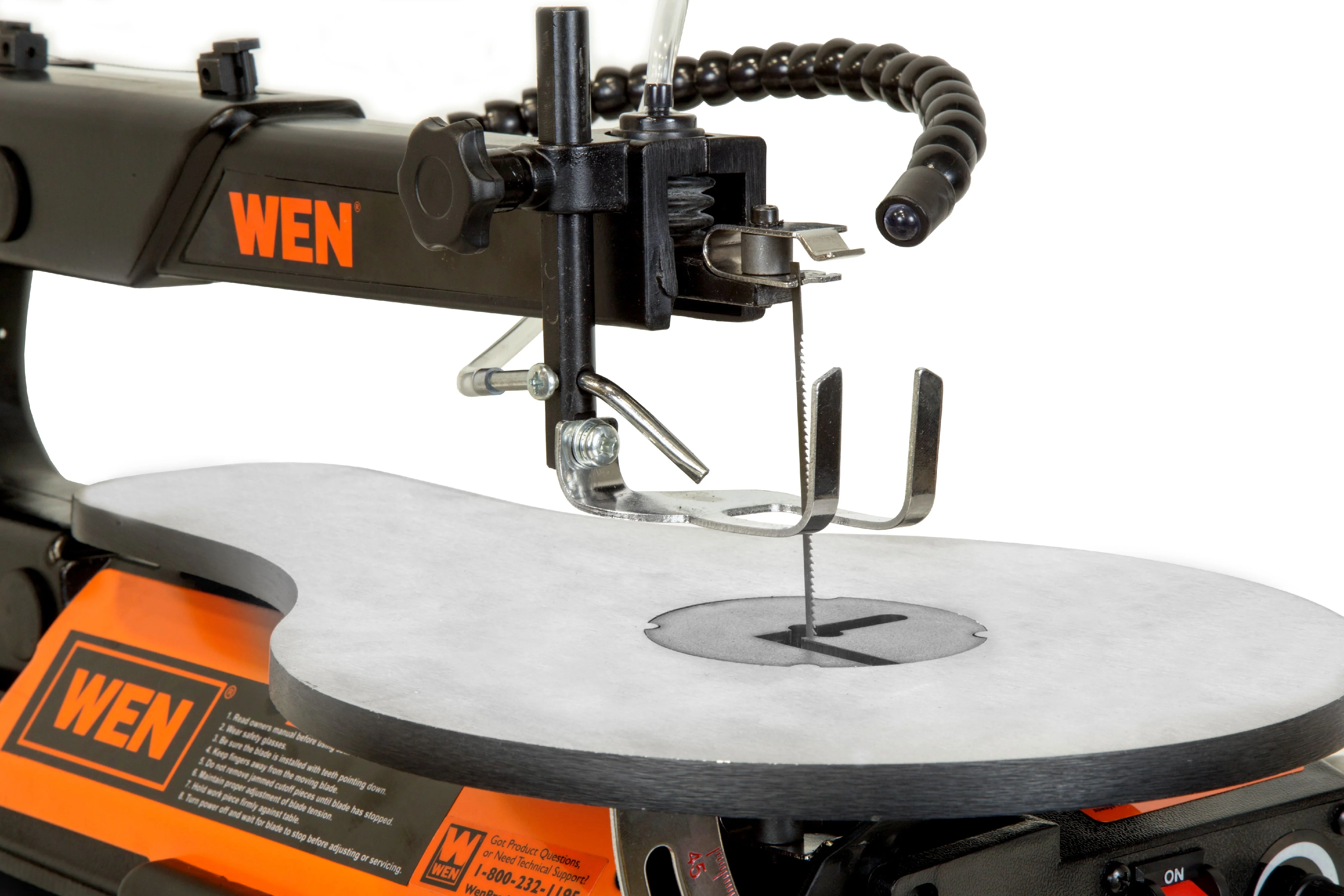 - Features a thumb screw blade adapter for tool-free blade changes, a cast iron base, an air pump, a flex light, a dust port, a foot lock clamp, onboard storage, and three blades