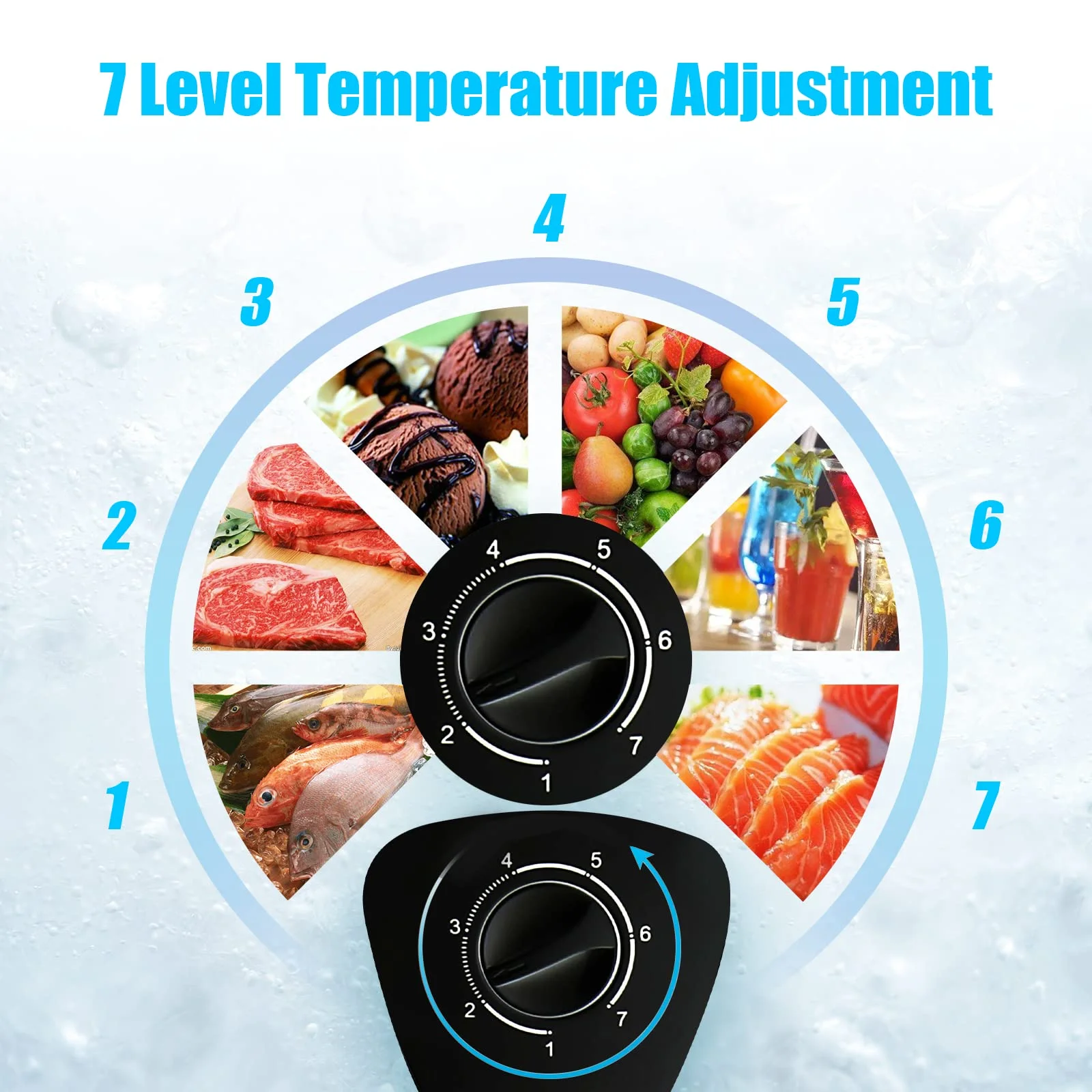 - :With 7 settings,you can choose your preferred coldness.Gear 1 is for defrosting,and Gear 7 is the coldest.Levels 1-2 are for fridge temps (32-50��F) for fruits and drinks.Levels 3-7 are for freezer temps (-11.2 to 32��F) for meat and ice cream.