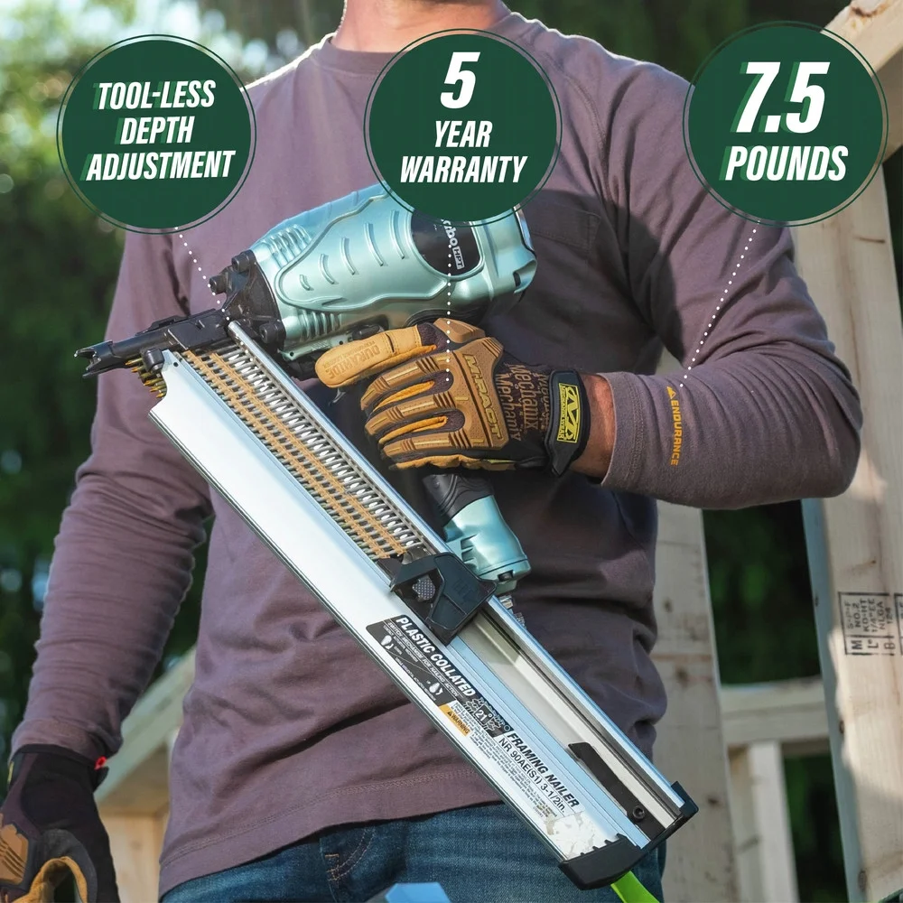 Metabo HPT Framing Nailer, Pro Preferred Brand of Pneumatic Nailers, 21 Degree Magazine, Accepts 2 - Inch to 3 - 1/2 - Inch Plastic Collated Nails, Ideal for Framing, Flooring, & Roof Decking, NR90AES1
