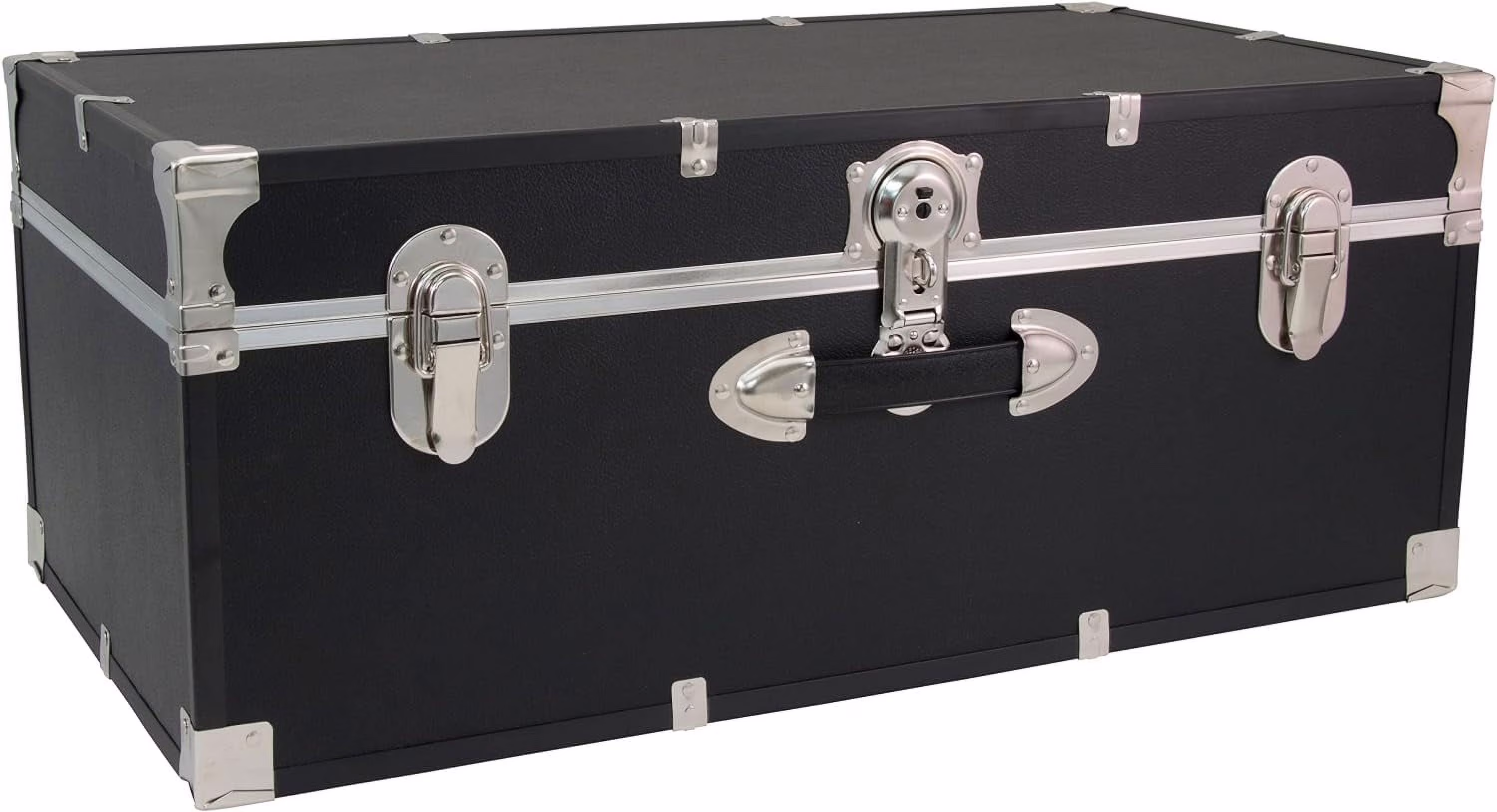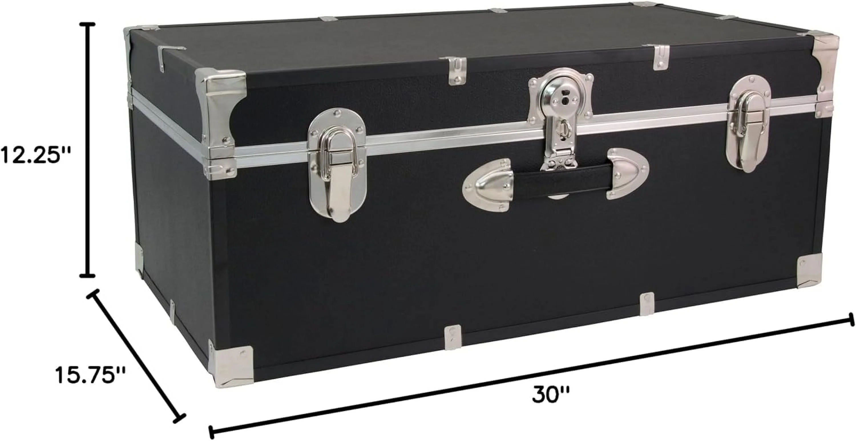 The Seward Essential 30" Trunk is the storage perfect solution. Dorm dwellers can easily store bulky seasonal clothing, textbooks and more in the must-have trunk. This trunk features classic nickel hardware with black binding and nickel corner guards. The dual lock-down latches help keep dust and moisture out. The push-button center has an optional locking feature (includes keys). For additional security, add a padlock. The trunk also has one front handle for easy moving.