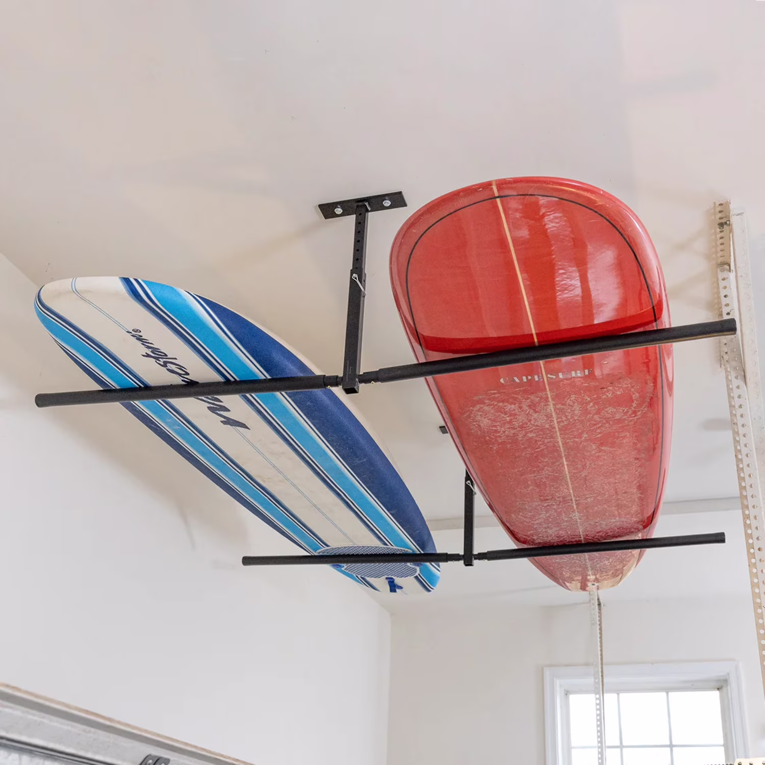 Ceiling storage rack for multiple surfboards or SUPs.Double Sup and Surf Adjustable Steel Ceiling Rack, Hi-port 2, Max 150 lbs
