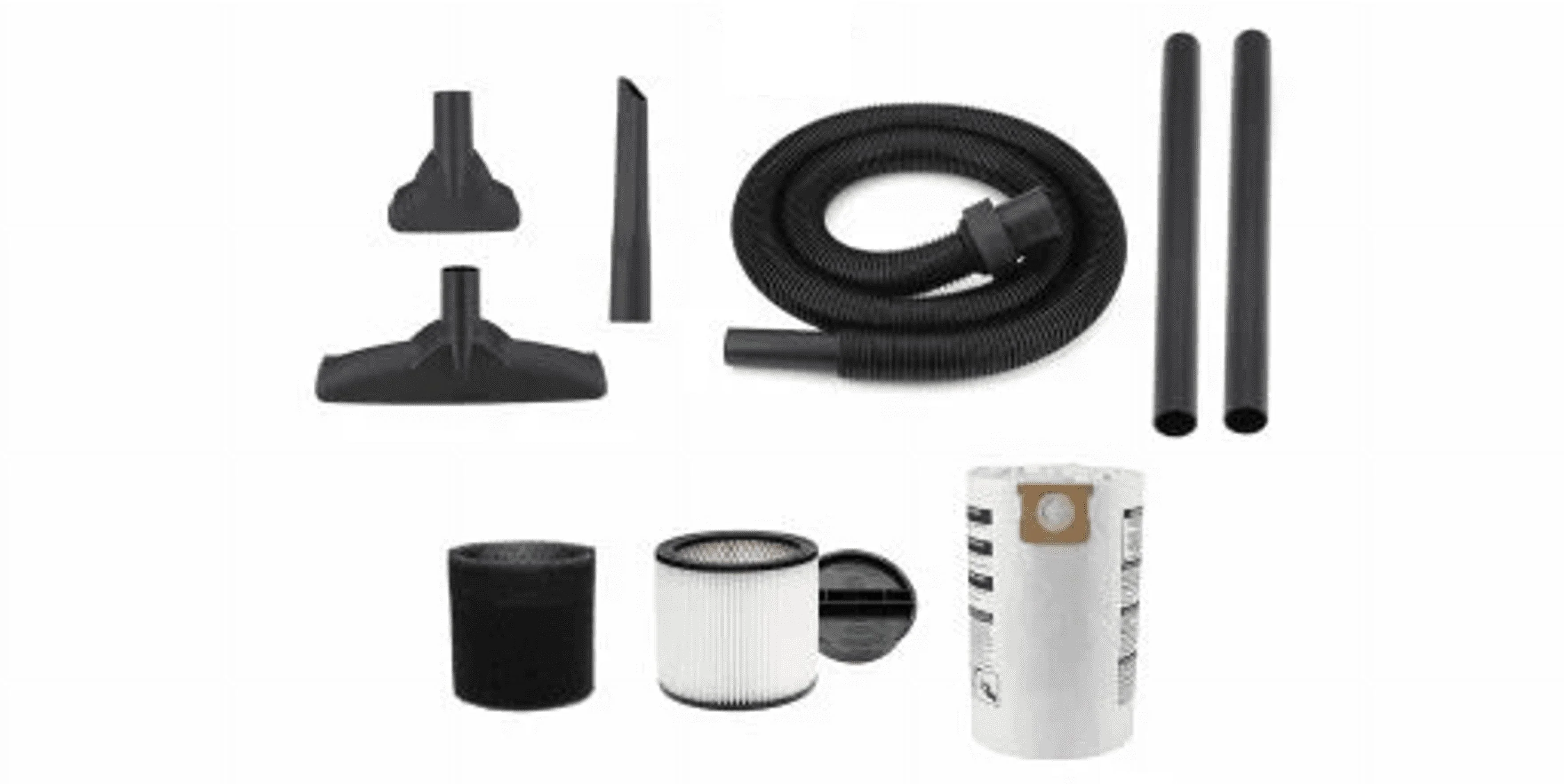 - Includes two 1.5-inch diameter extension wands, 12-inch Wet/Dry nozzle, cartridge filter, foam sleeve, and 10-14 gallon disposable filter bag