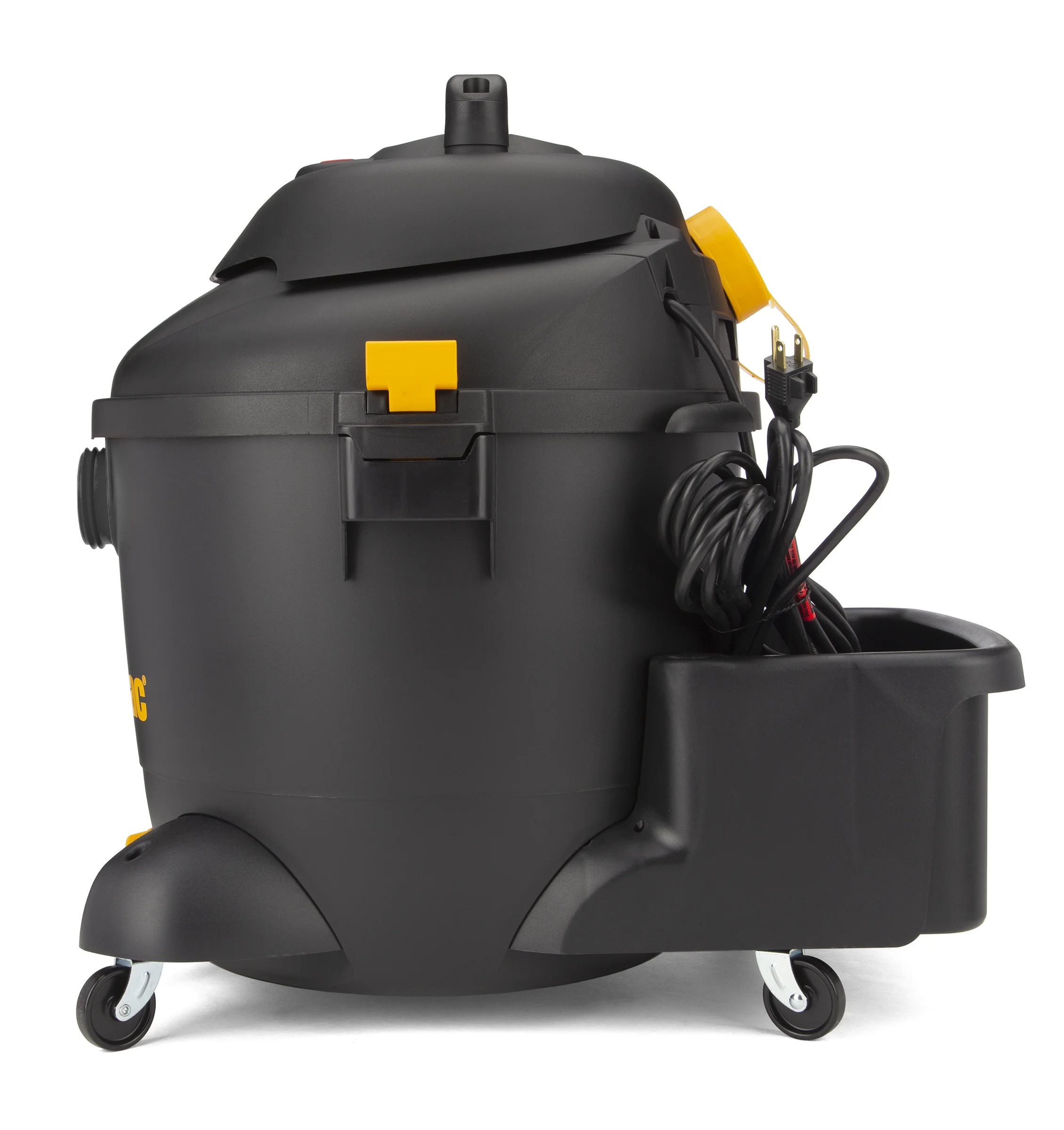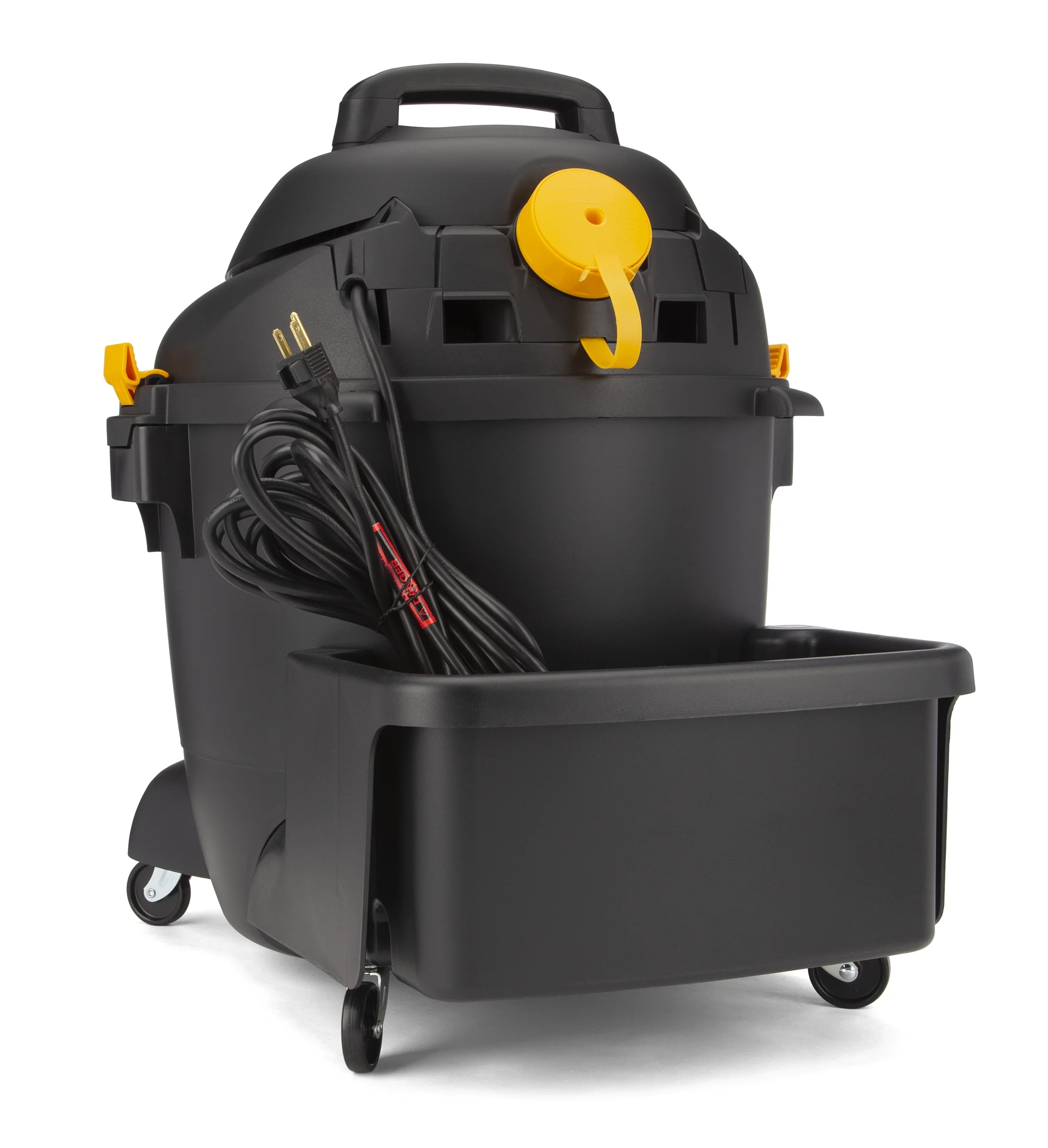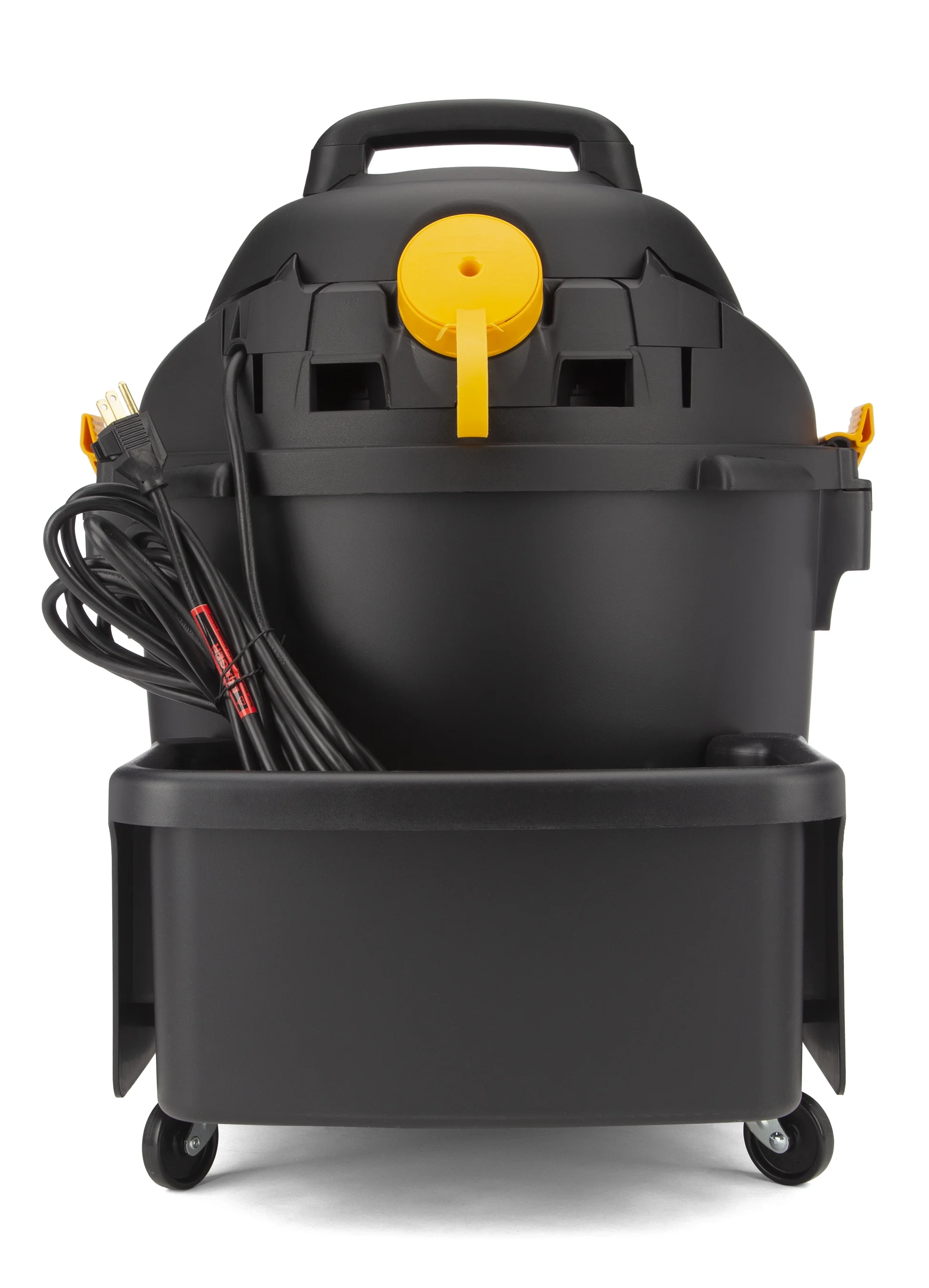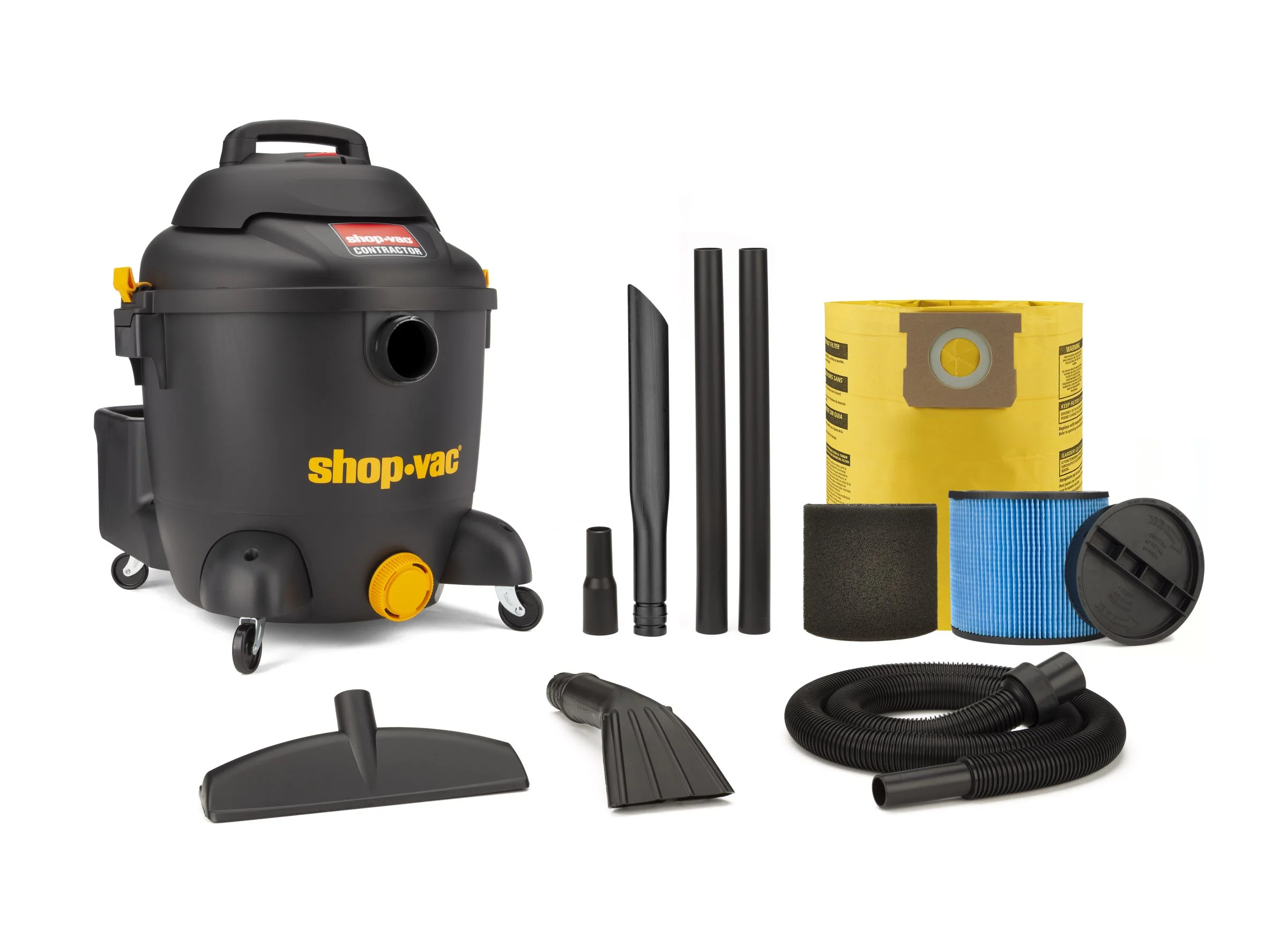 The Shop-Vac 10 Gallon 4.5 Peak HP Contractor Series Wet Dry Vacuum works great for job site cleanup, workshops, garages, basements anywhere you need high strength. This vacuum features a drain plug that allows you to easily drain the tank when it is loaded down with liquid. Also included is a rear blower port that can easily be used by attaching the included hose to the rear port to clear dirt, debris, leaves and more from your shop floor, hard to reach places. Equipped with a 20-foot cord and 12-foot hose for a total of 32-feet of cleaning reach. Included with this vacuum is a 12-foot by 1.5-inch diameter lock-on hose, two 1.5-inch diameter extension wands, a 14-inch wet/dry floor nozzle,a 16-inch crevice tool, a claw utility nozzle, conversion unit adaptor,and on-board accessory storage. Filters Included: Ultra-Web Cartridge Filter, Foam Sleeve, and the 10-14 Gallon High Efficiency Disposable Filter Bag. This 10 gallon vacuum is the perfect fit for all of your heavy duty cleanup tasks, get yours today!