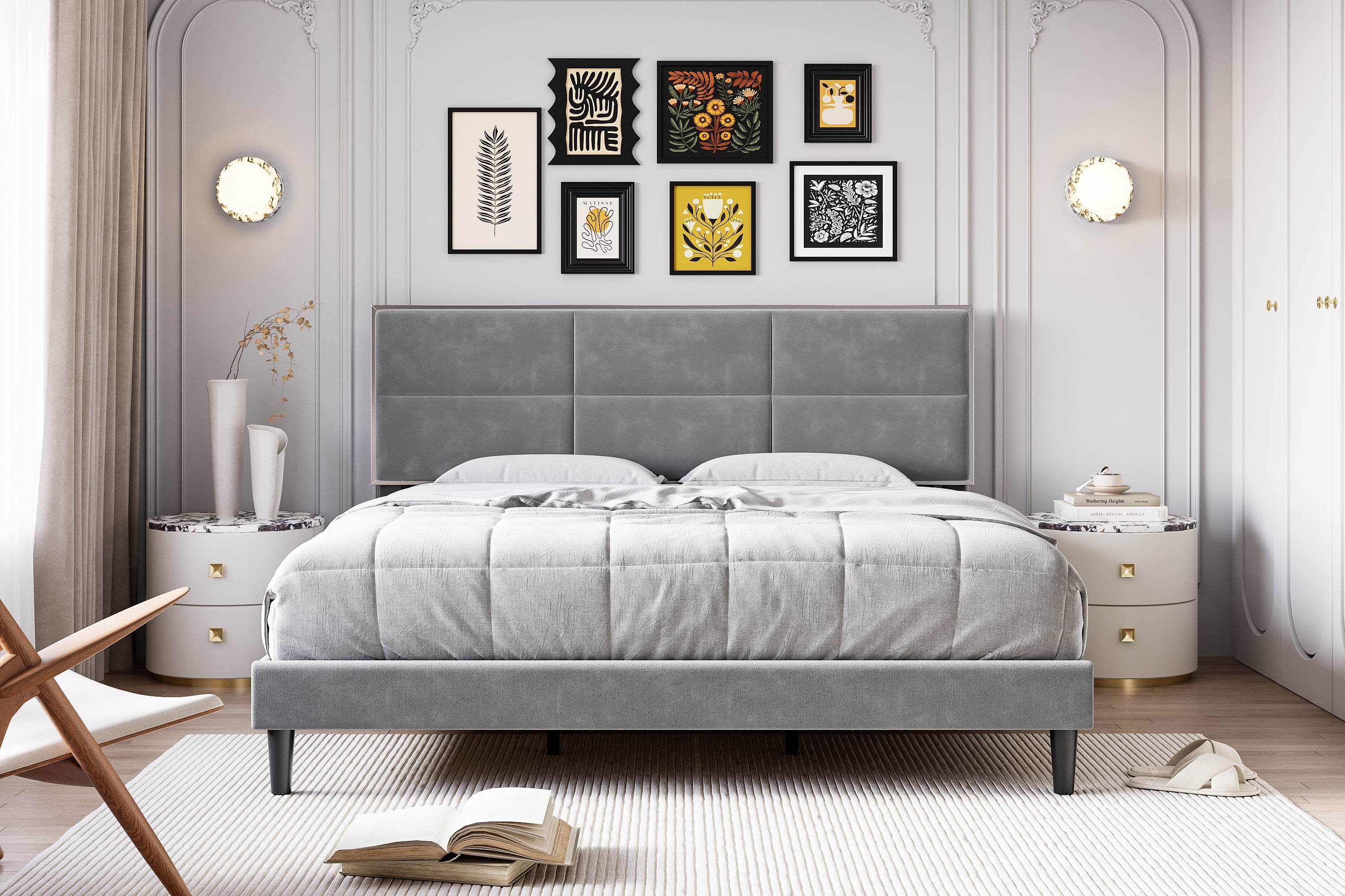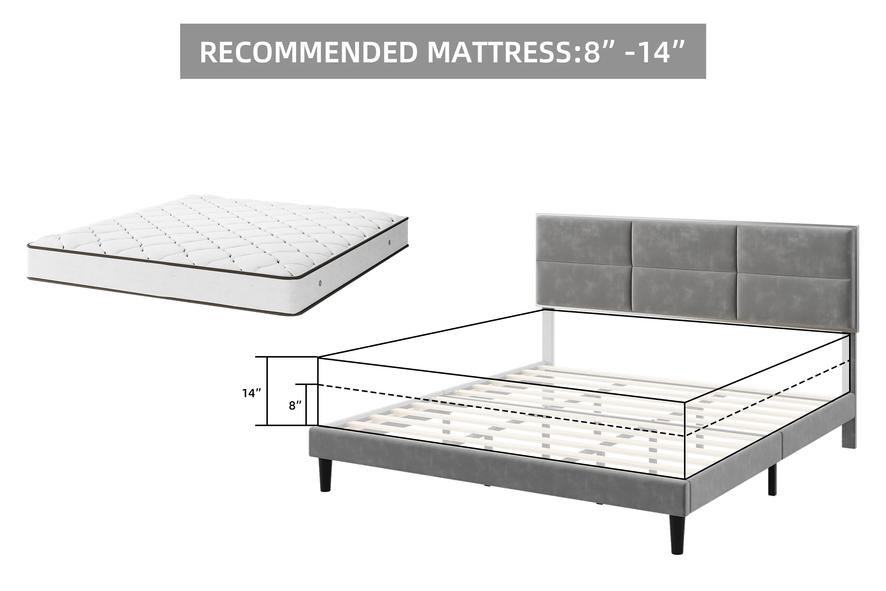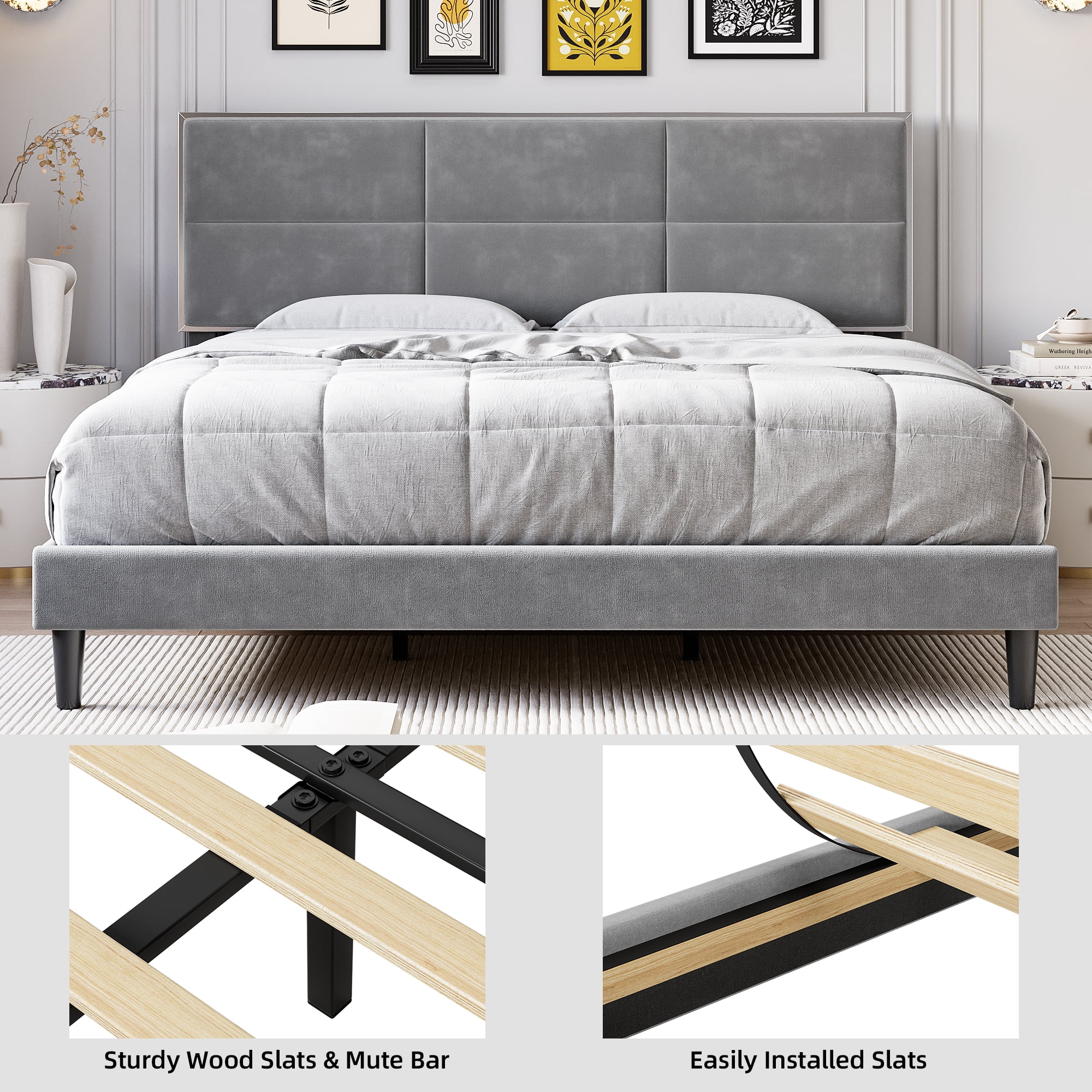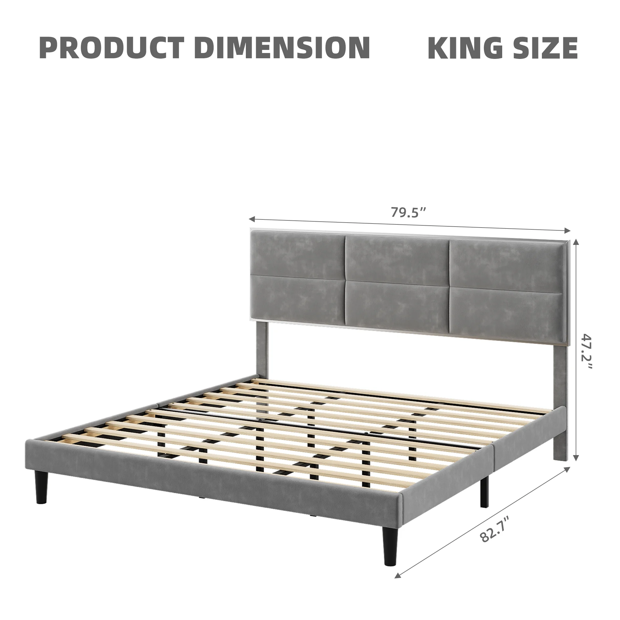 Homhougo King Size Bed Frame Upholstered Platform, Bed Frame with Square Velvet Headboard, Wooden Slats Support, Non - Slip and Noise - Free, No Box Spring Needed, Easy Assembly(Light Gray)