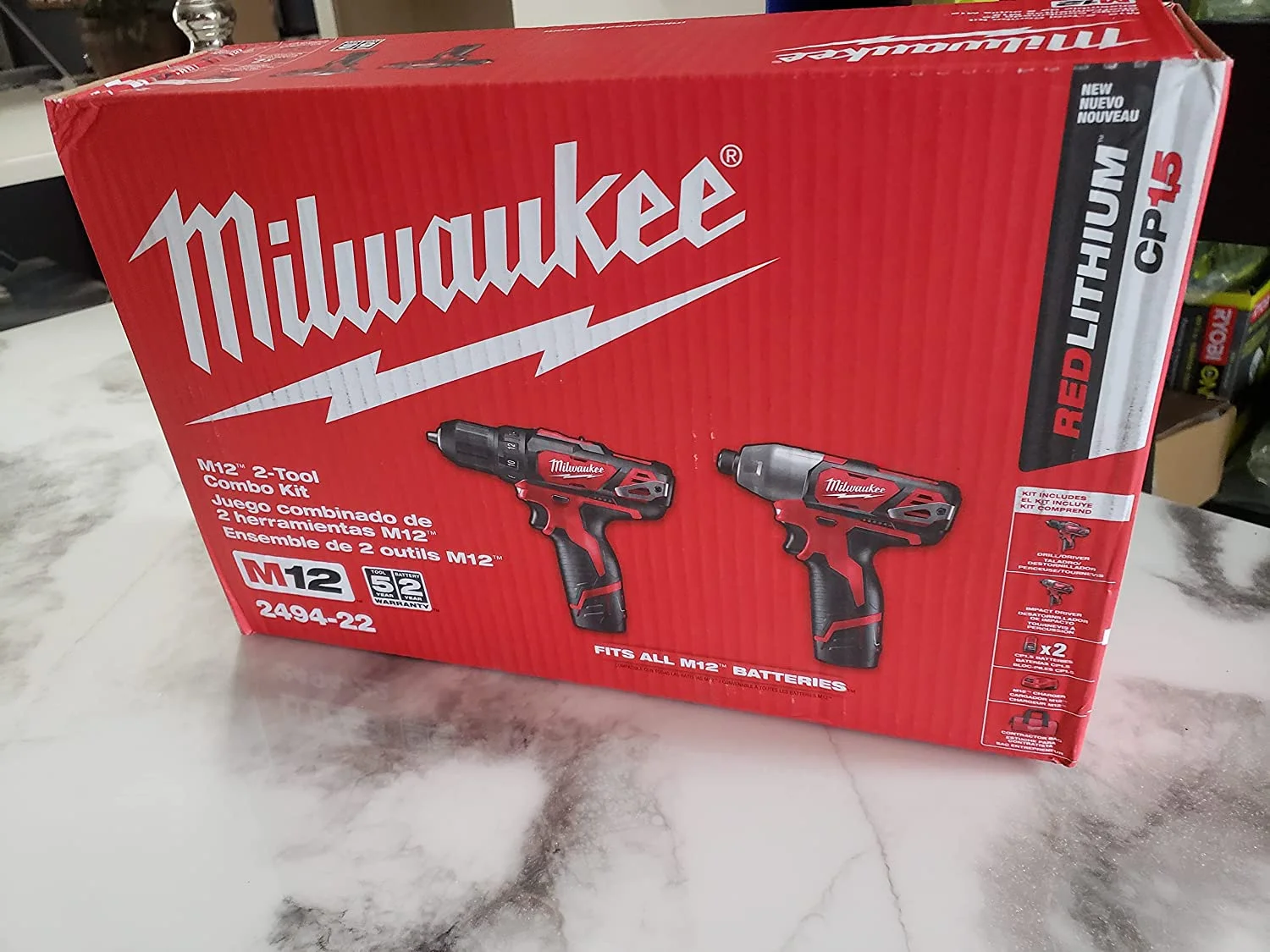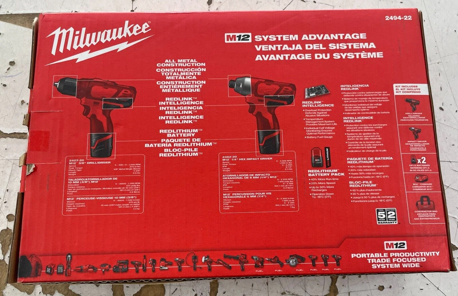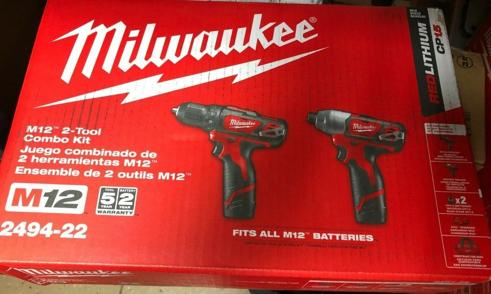 The 2494-22 M12 Cordless Lithium-Ion 2-Tool Combo Kit includes the 3/8 in. Drill Driver and the 1/4 in. Hex Impact Driver.The innovative M12 cordless Lithium-Ion system is designed to deliver the power and torque required for professional applications, in a size that reaches the tightest and toughest places.Powered by REDLITHIUM, the M12 cordless Lithium-Ion system offers unmatched power, speed and tool belt portability.Comes with a free M12 12-Volt Lithium-Ion 2.0 Ah Compact Battery (48-11-2420).Includes:2410-20 M12 3/8 in. drill driver, 2450-20 M12 1/4 in. hex impact driver, (2) 48-11-2401 M12 REDLITHIUM batteries, 48-59-2401 M12 30-minute charger, contractor bag, (1) 48-11-2420 M12 12-Volt lithium-ion 2.0 Ah compact batteryMetal Ratcheting Chuck for maximum durabilityNew ergonomic handle design for increased comfortOn-board battery fuel gauge displays remaining run time