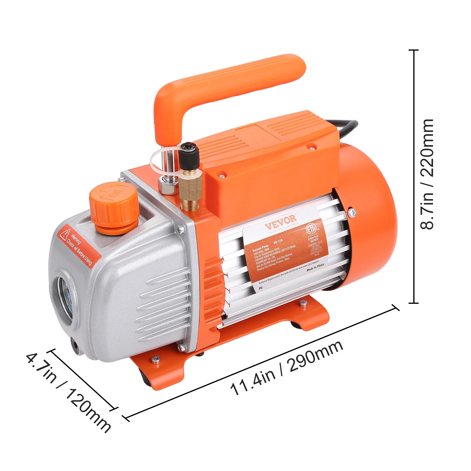 - Heavy Duty Vacuum Pump: Single-stage pump is designed for higher and more stable ultimate vacuum. It maintains the air conditioning system by effectively moving moisture before refilling it with refrigerant. Free Air Displacement: 4 CFM, Ultimate Vacuum: 40 microns, Intake Fitting: 1/4"SAE male and 1/2"ACME male, Speed: 1720PRM, Voltage/Frequency: 120V/60 Hz, Power: 180W, Oil Capacity: 200 ml.