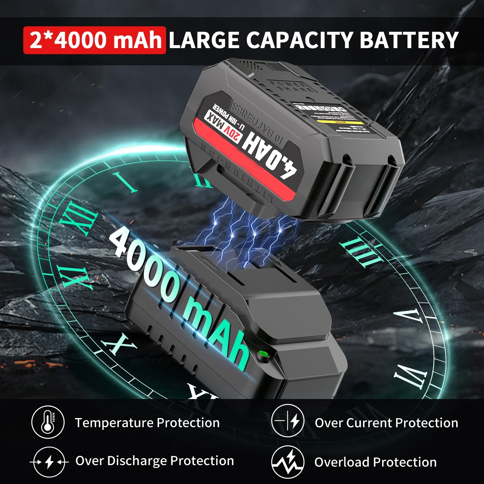 - The package includes 2 rechargeable 20V 4.0 Ah lithium-ion batteries, providing a longer usage time for this electric impact drill. The power indicator reminds you of the remaining battery power, and the included fast charger can fully charge the battery in just 1.5H.