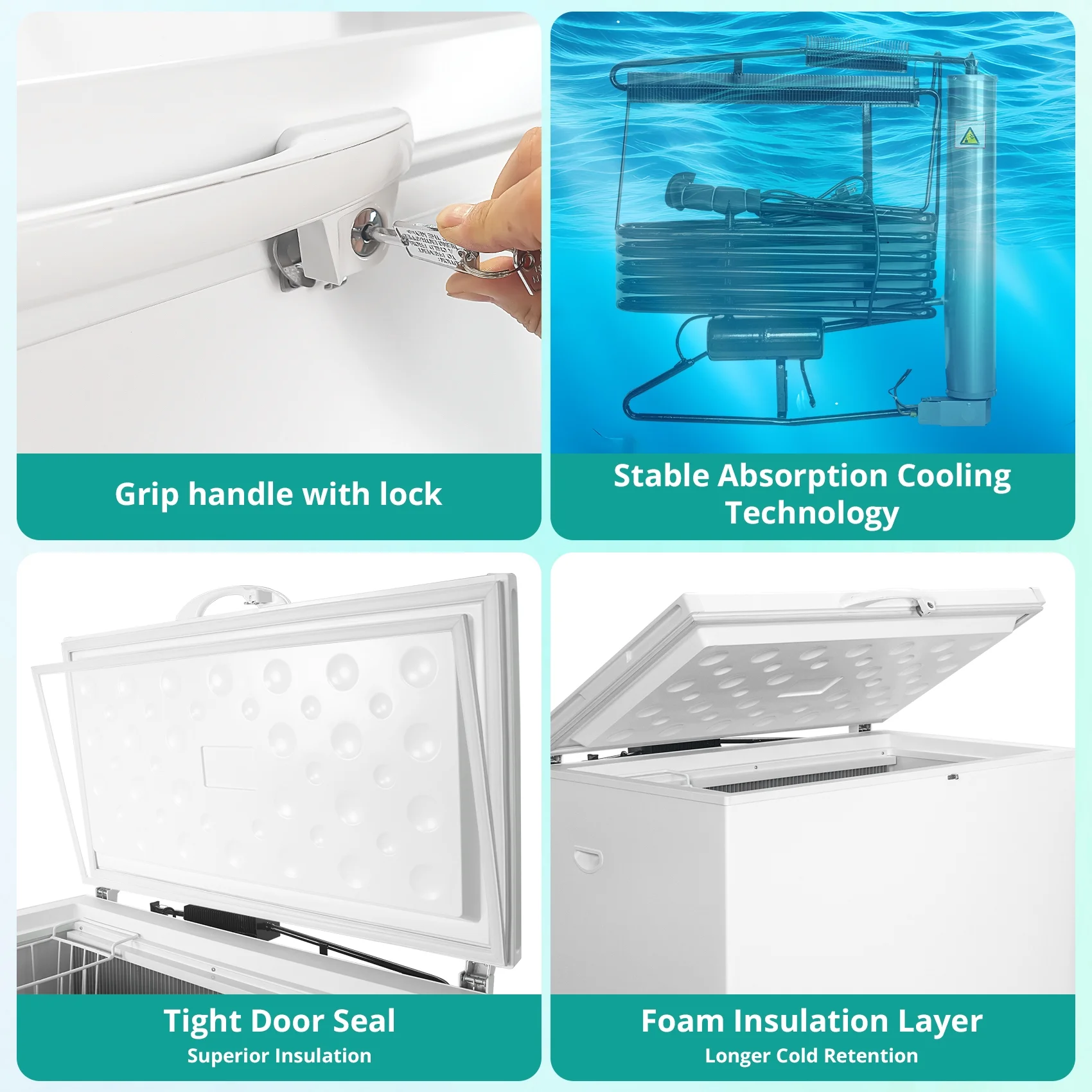��Quiet Cooling System�� Utilizing an absorption cooling technology, this RV chest freezer operates almost silently, ensuring you enjoy a peaceful environment while producing no pollution, protecting the health of you and your family