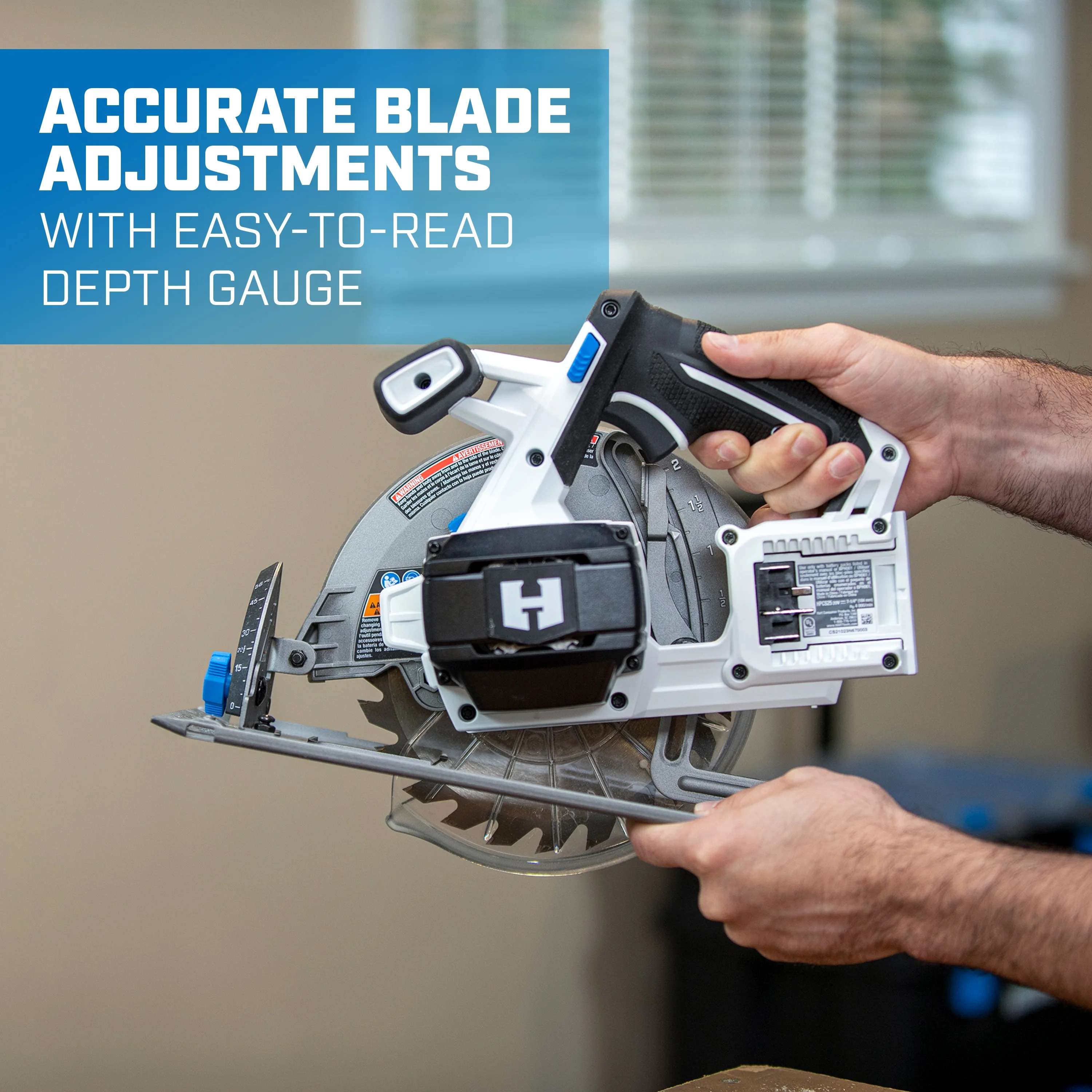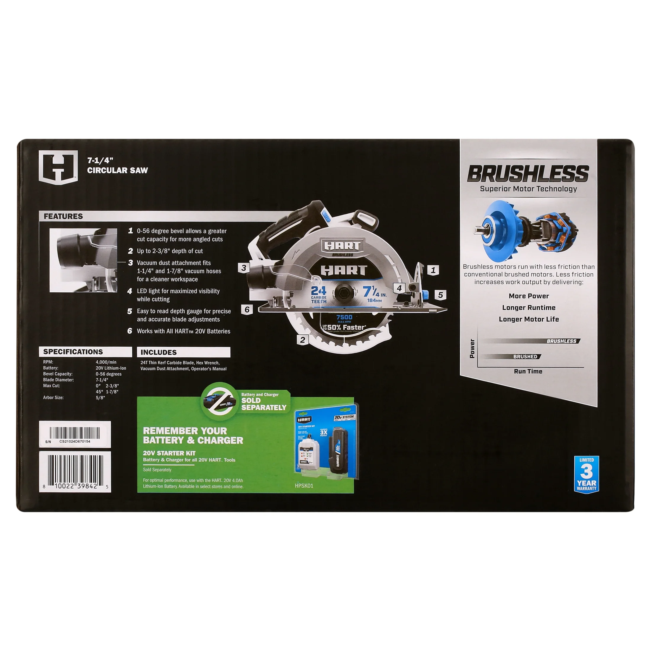- Includes: (1) 20V Brushless 7-1/4" Circular Saw, (1) 24T Thin Kerf Carbide Blade, (1) Hex Wrench, (1) Vacuum Dust Attachment, and (1) Operator's Manual.
