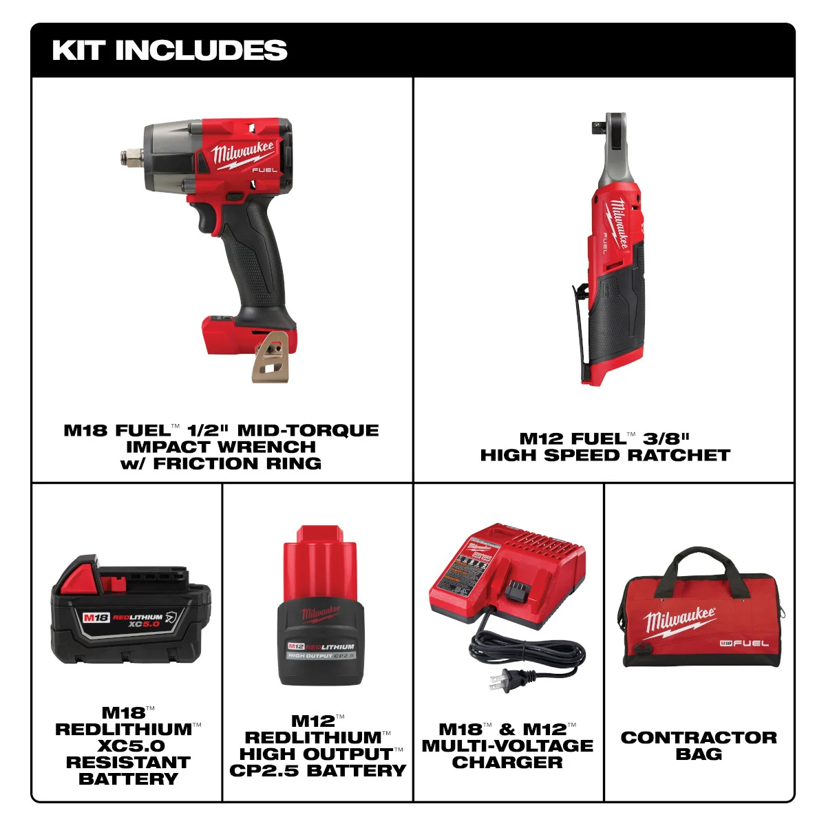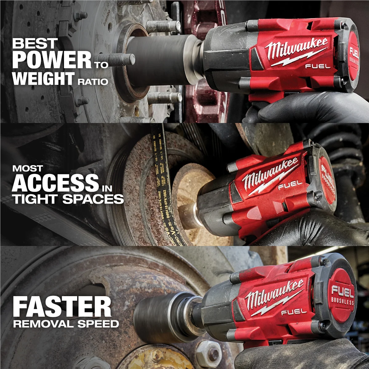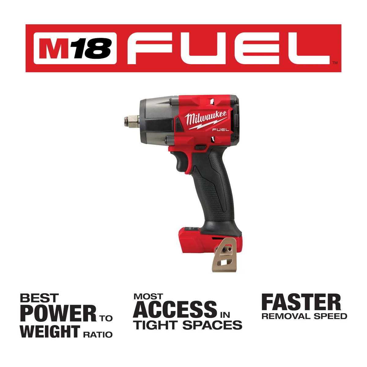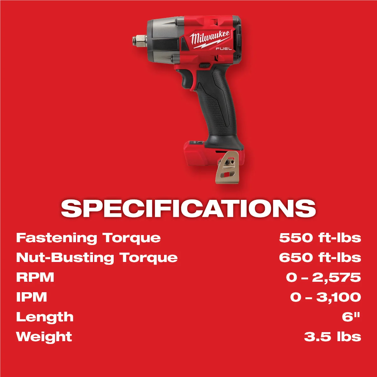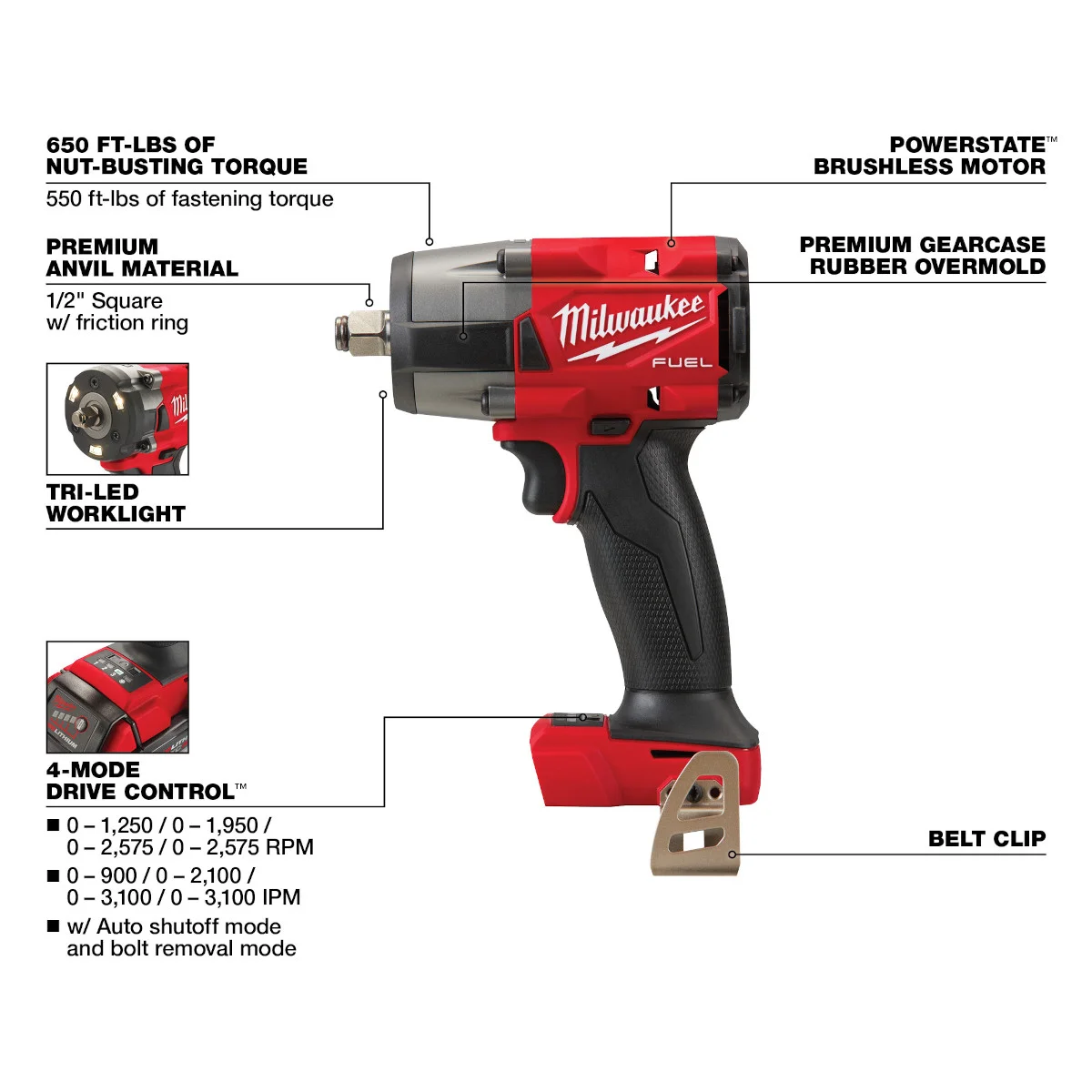 - M18 FUEL? 1/2" Mid-Torque Impact Wrench w/ Friction Ring provides 650 ft-lbs of nut-busting torque and only weighs 5.1 lbs with a 5.0Ah battery