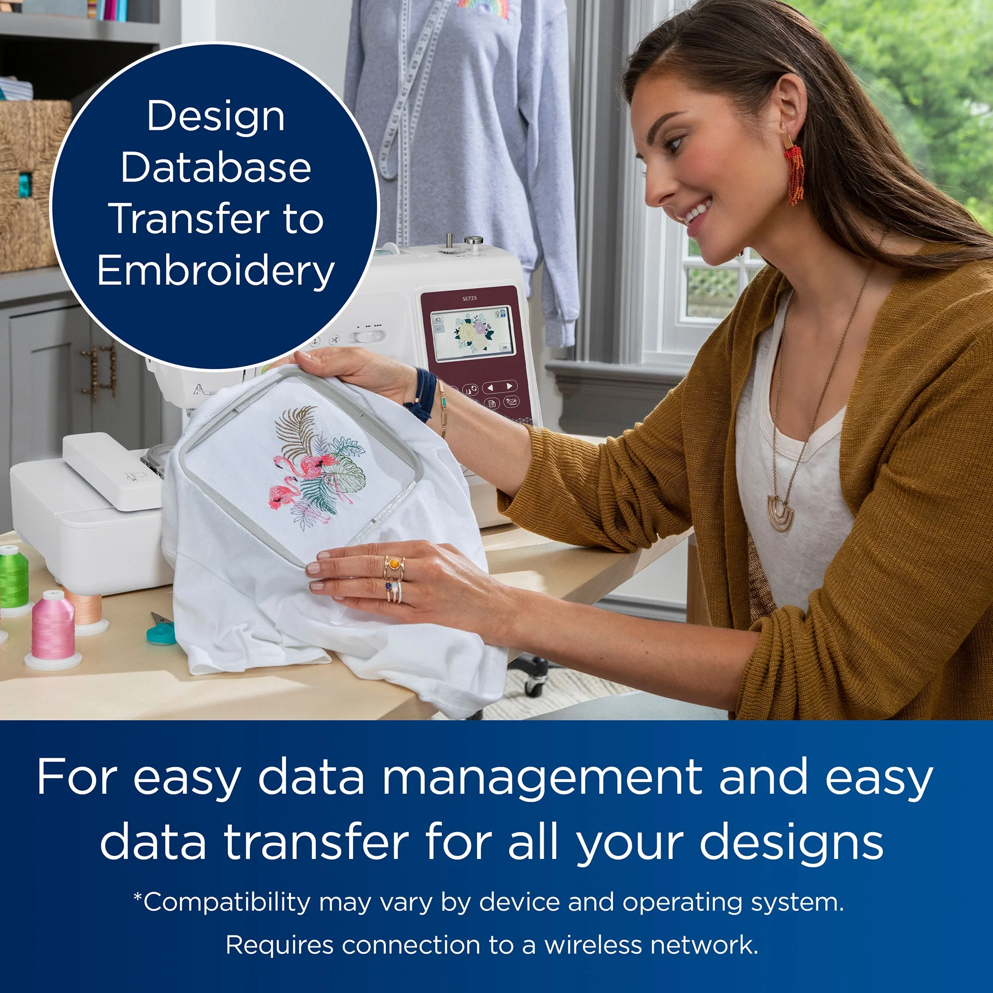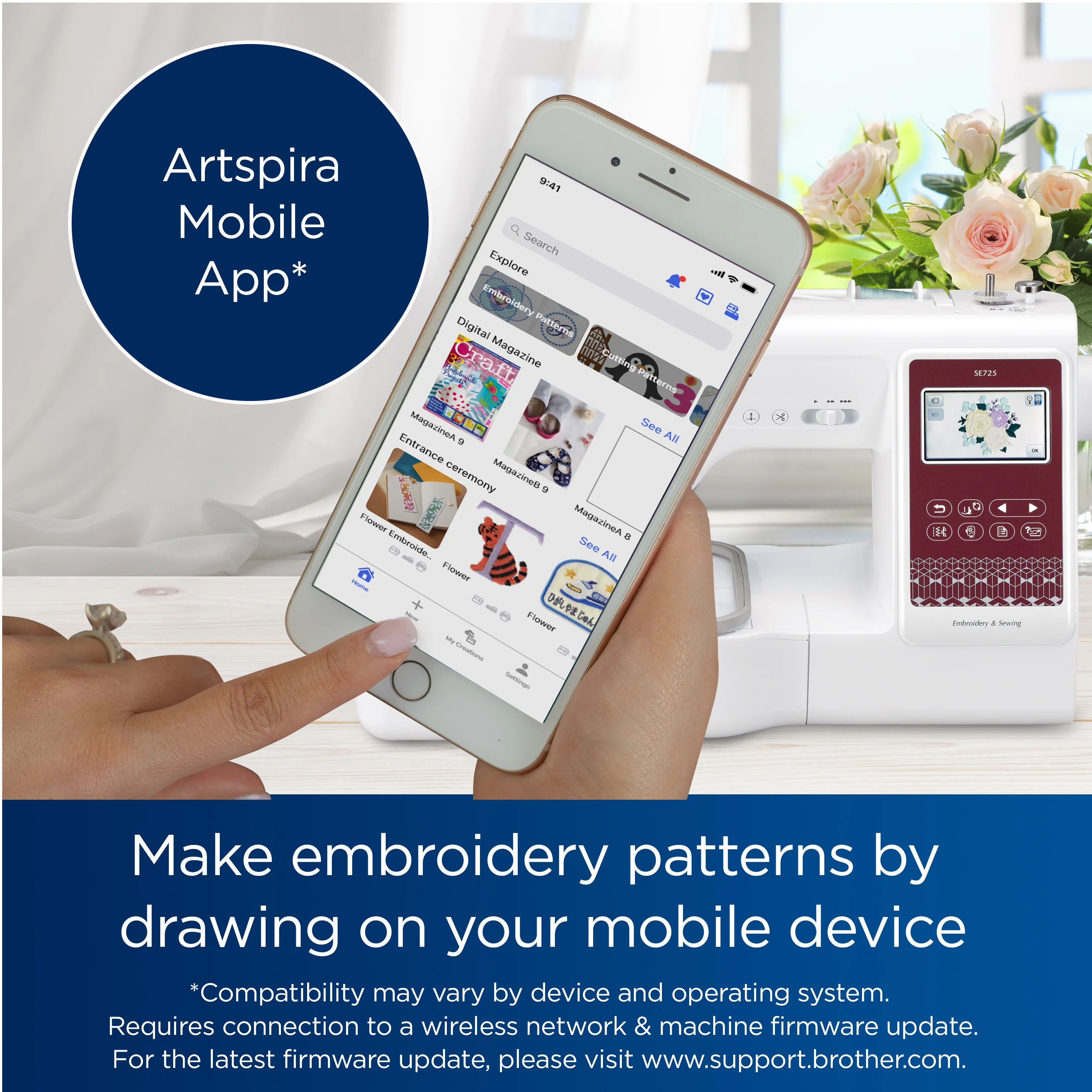 - Artspira App: With the Artspira App, you can design your next project on your mobile device. Draw your own embroidery patterns, access a variety of downloadable designs and cutting patterns, and wirelessly transfer them to your SE725 Walmart Exclusive sewing and embroidery machine for a seamless, on-the-go creative experience.