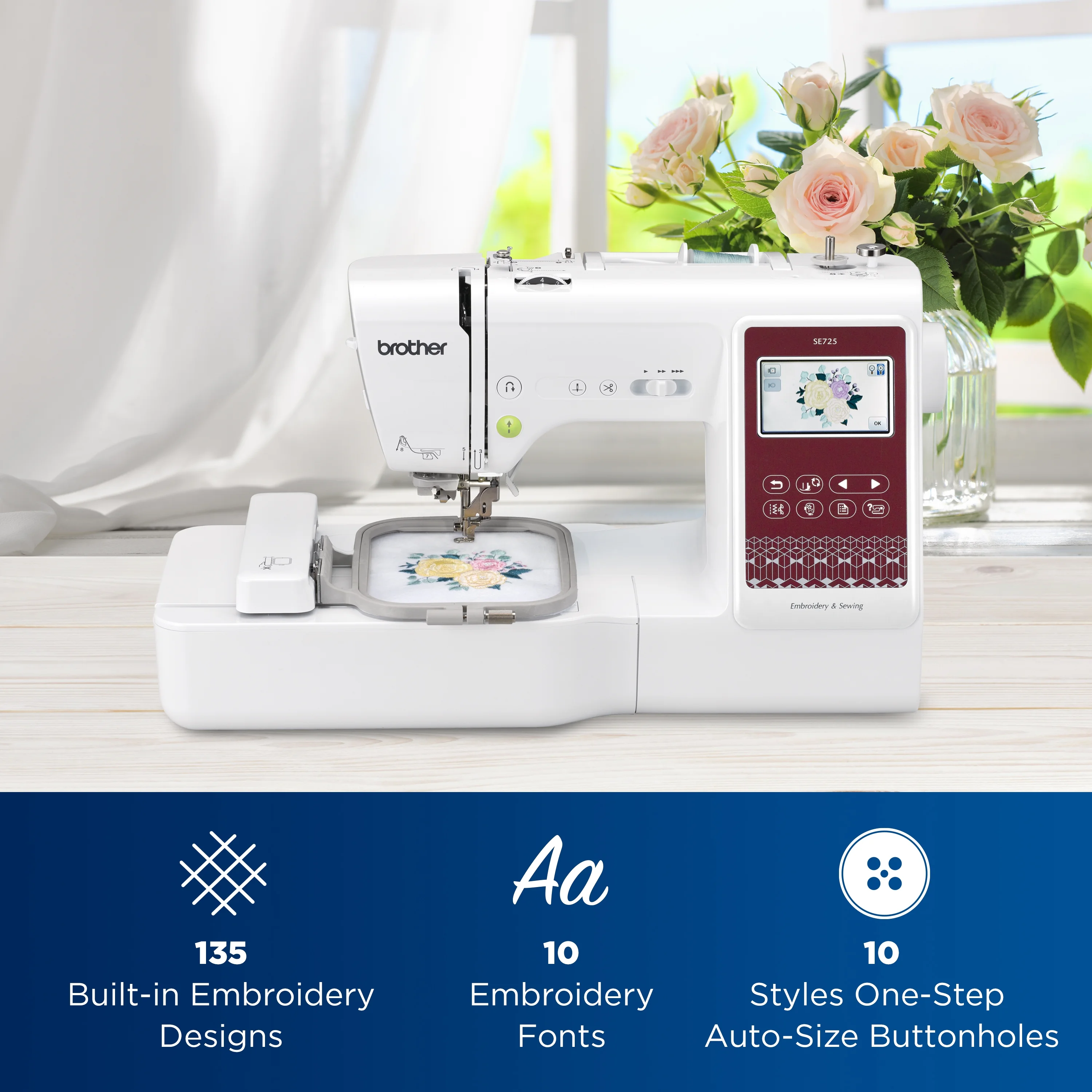 - Savvy Sewing: The SE725 Walmart Exclusive comes with 135 built-in embroidery designs, 10 built-in embroidery fonts, 103 built-in sewing stitches and 10 one-step auto-size buttonholes to handle all your sewing needs. The Advanced Needle Threading System makes threading easy and quick, reducing setup time so you can focus on your projects.