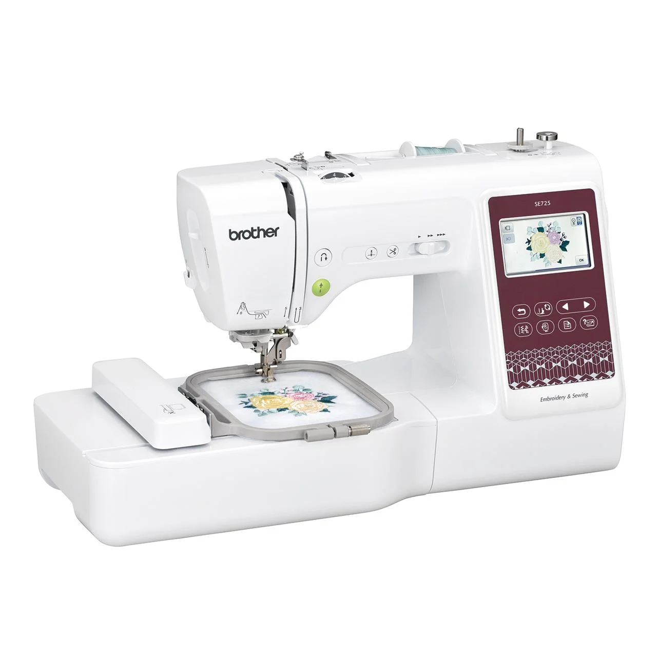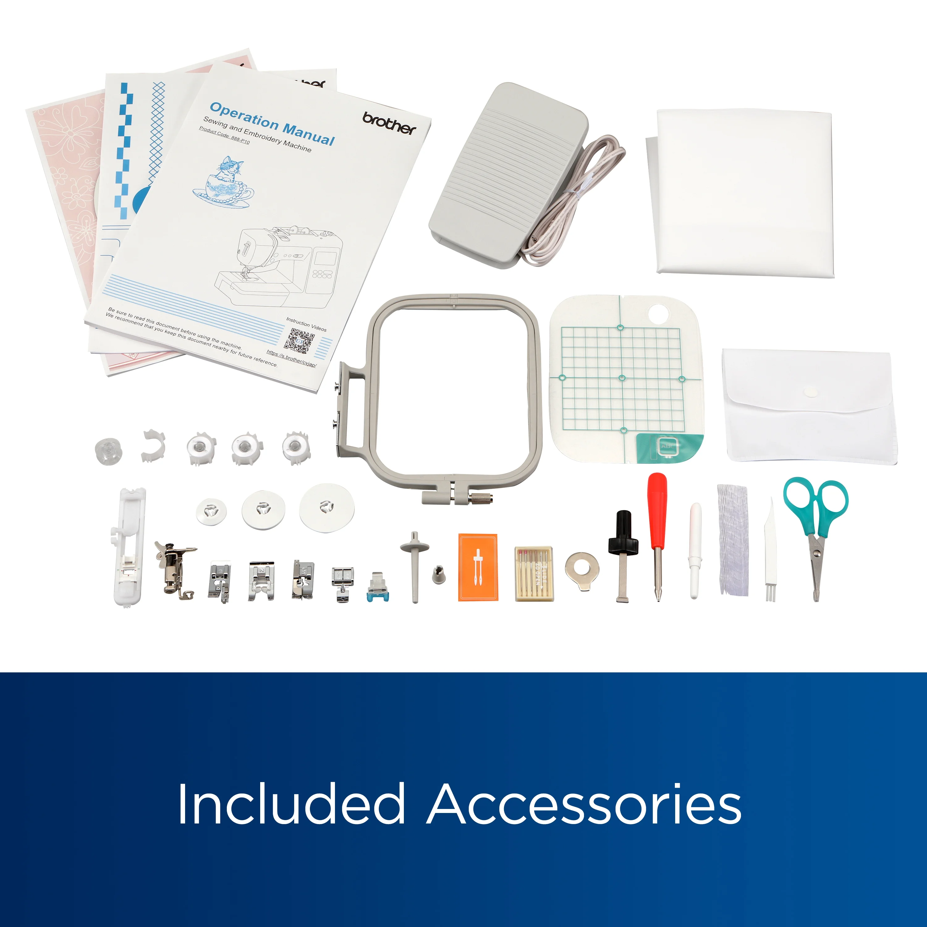 - Included Accessories: The SE725 includes a variety of helpful accessories to get you started: Embroidery Frame Set (medium) 10 cm (H) x 10 cm (W) (4�� x 4��); Bobbins (2), Pre-wound Bobbins (3); Extra Spool Pin, Spool Net; Foot Controller, Zigzag Foot, Monogramming Foot, Overcasting Foot, Zipper Foot, Blind Stitch Foot, Buttonhole Foot, Button Fitting Foot; Seam Ripper, Scissors, Cleaning Brush, Eyelet Punch, Screwdriver; Spool Caps (S, M, L), Thread Spool Insert, Needle Set, Twin Needle, Embroidery Foot; Bobbin Case, Accessory Bag, Dust Cover, Operation Manual, Quick Reference Guide, Embroidery Design Guide
