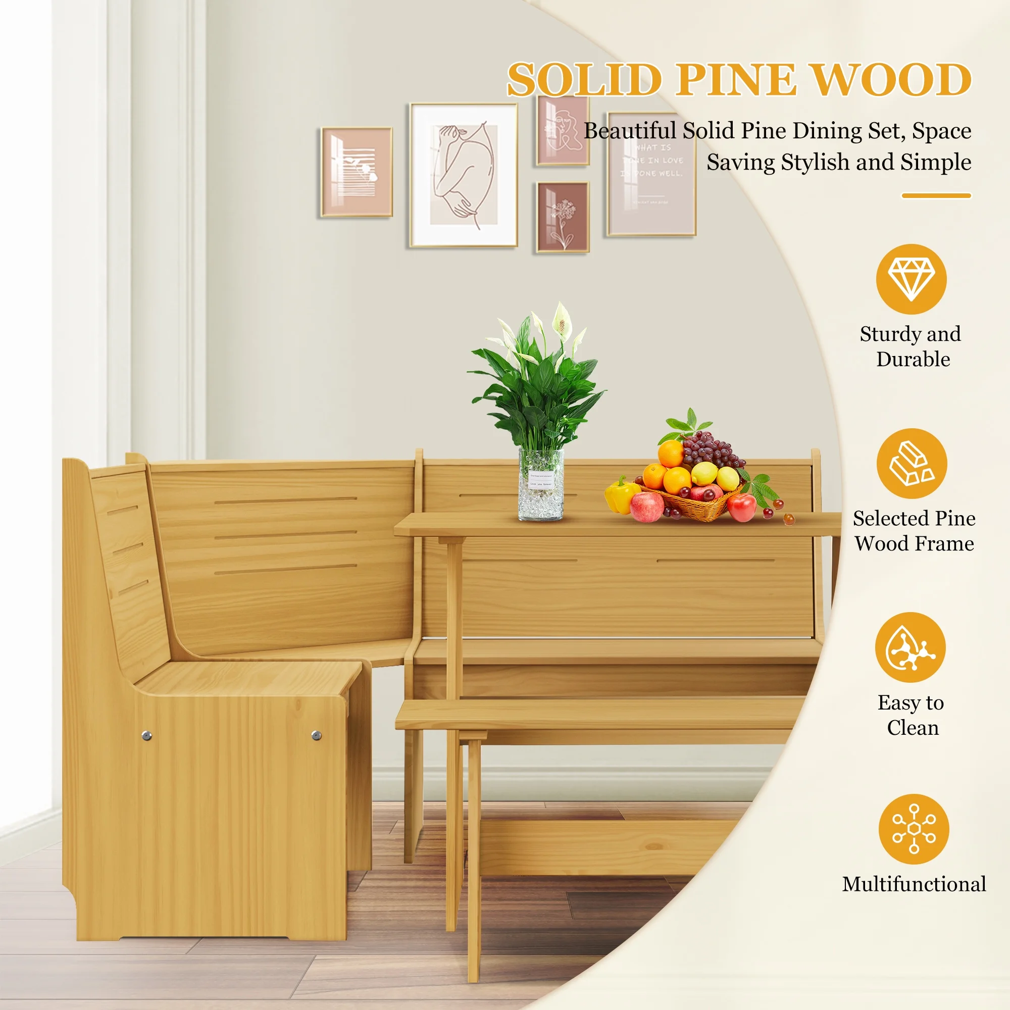 - ��Durable and Sturdy Design�� Constructed from high-quality pine wood, this L-Shape Compact Dining Set is built to withstand daily use, offering exceptional durability and stability. The solid wood structure ensures it won��t warp or wear down over time, even with frequent use. Reinforced with screws between the table legs, this design provides robust support for the entire set, with a weight capacity of up to 500 pounds.