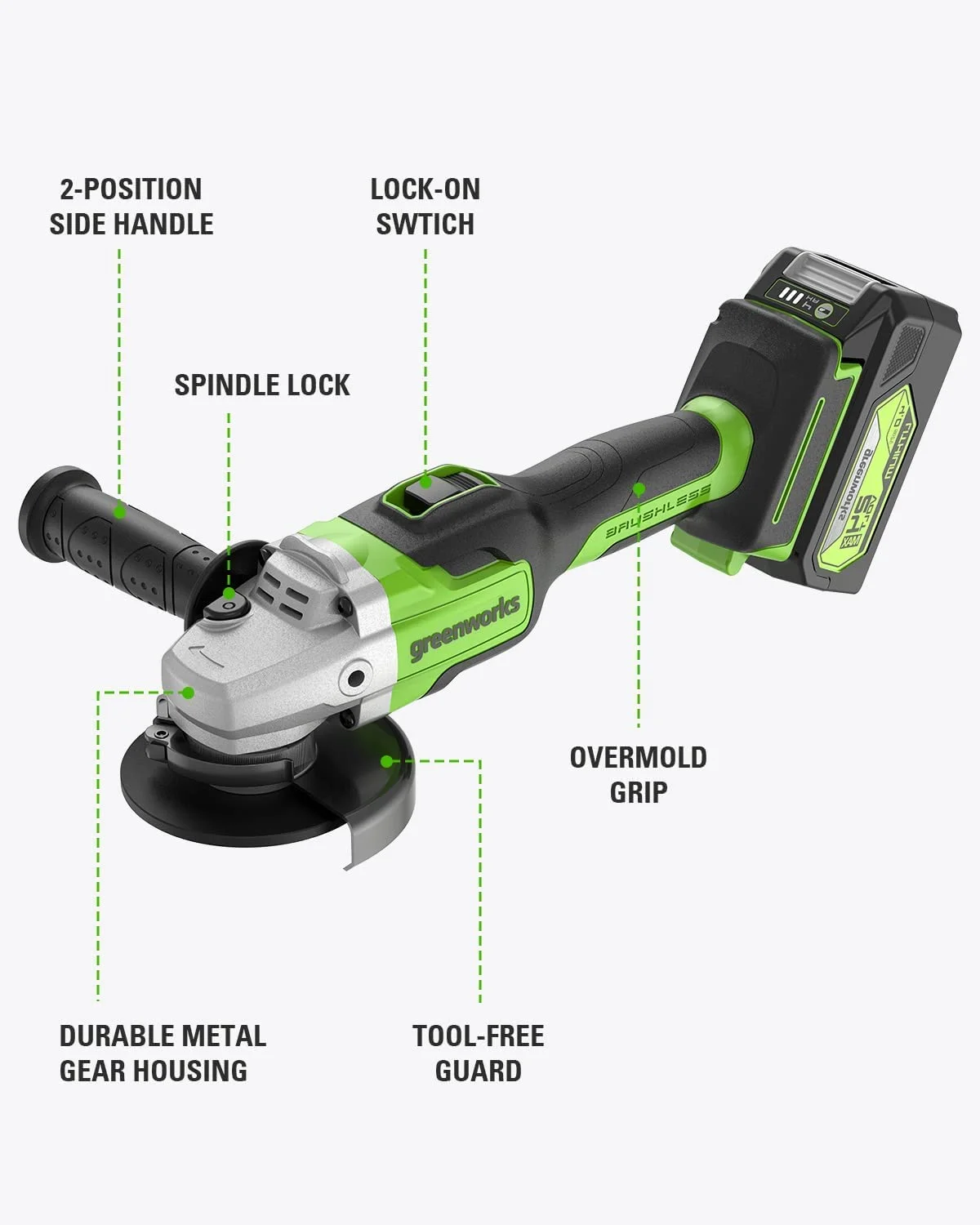 - What's Included - Brushless 4-1/2" Angle Grinder, 4Ah Battery & Charger, Side Handle, Blade Guard, Cutting Blade, Grinding Wheel, and Spanner Wrench