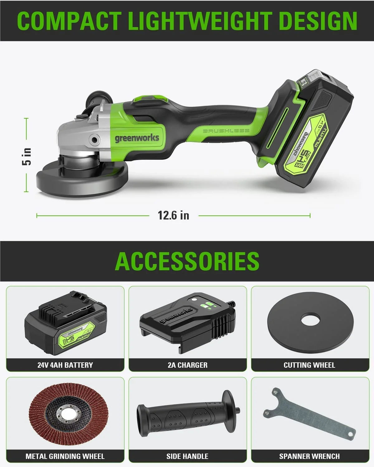 - New Greenworks 24V 4.5" Cordless Battery Angle Grinder:
