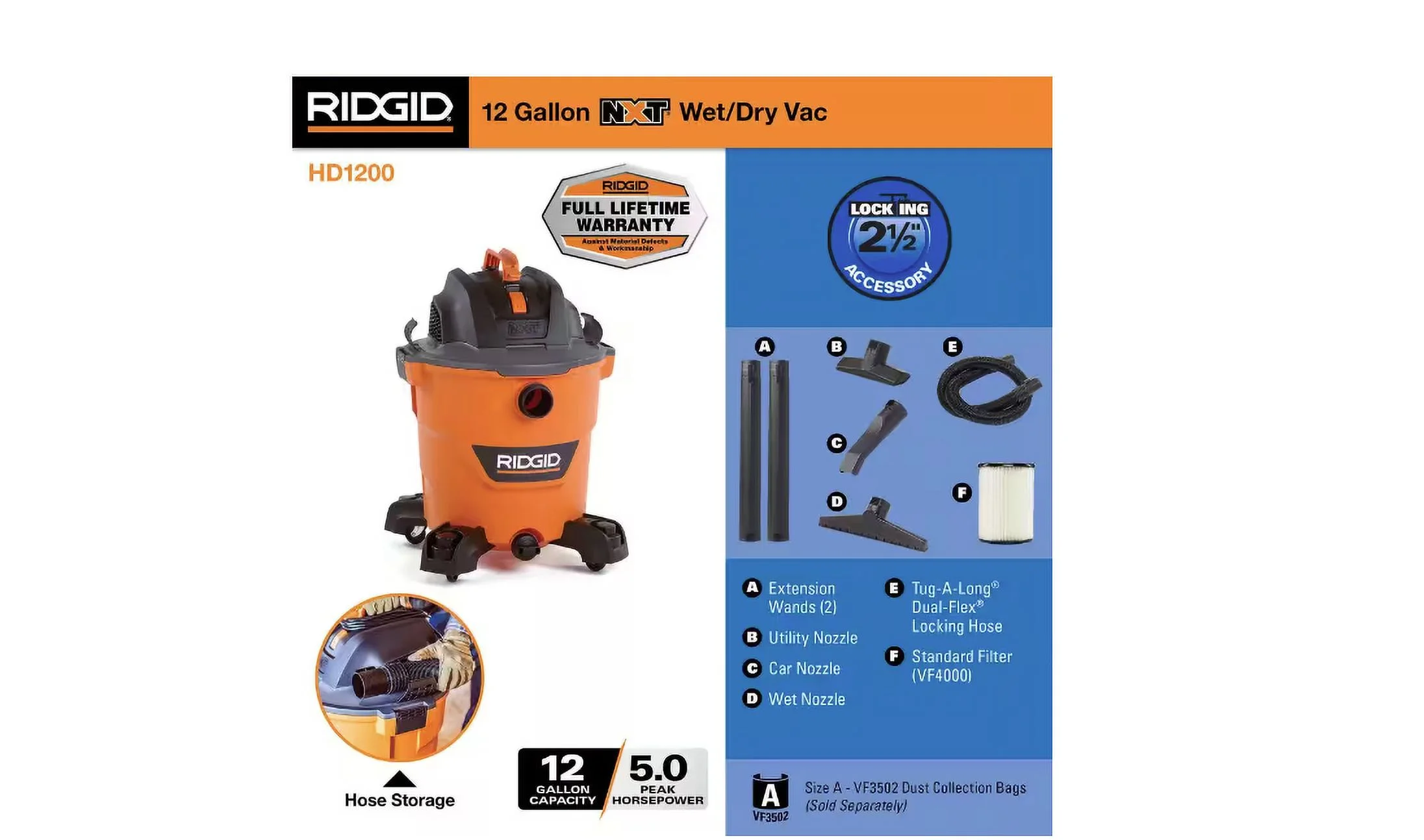 - Pair the RIDGID 12 Gallon NXT wet/dry vac with a dust collection bag (VF3502 Size A; sold separately) for quick and easy disposal and to keep the drum clean and mess contained
