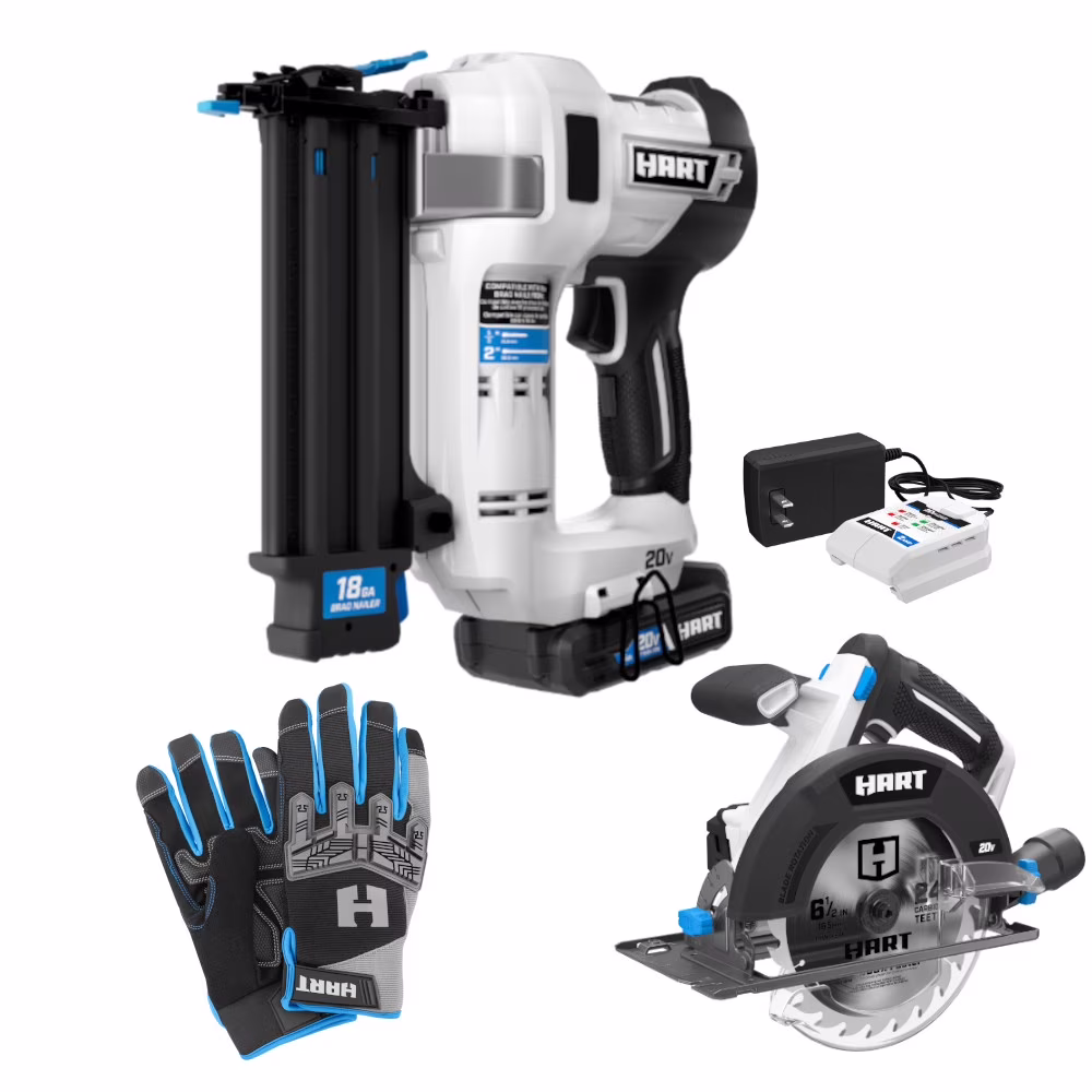 This kit includes the HART 20V 18G Brad Nailer Kit w/HART 20V 1.5Ah Battery and Fast Charger. Also included is the HART 20V 6-1/2" Circular Saw and Impact Gloves.