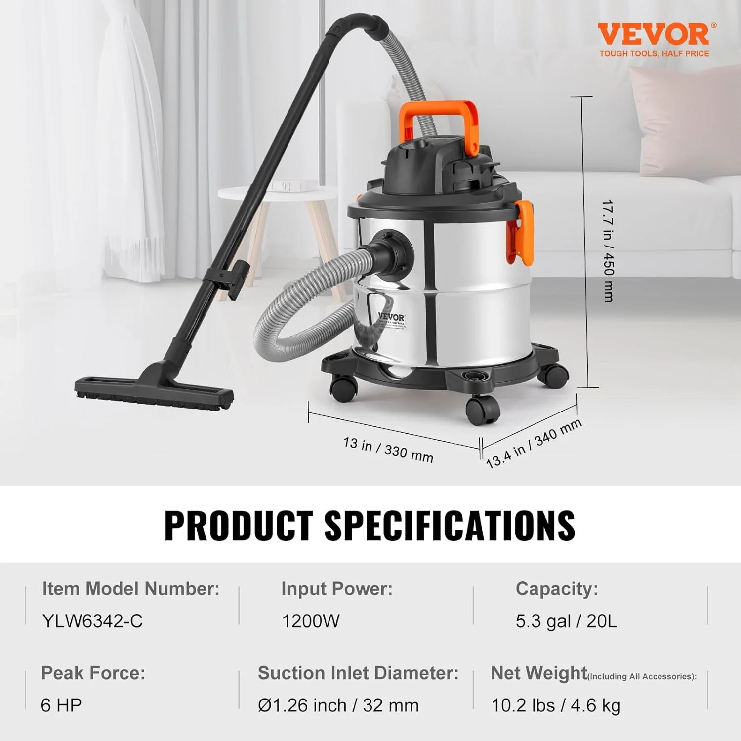 - 60CFM High Suction Power: Achieve unprecedented cleaning speed with our stainless steel vacuum cleaner boasting 60CFM suction and 6HP peak horsepower. It handles dust, debris, pet hair, and even indoor liquid spills effortlessly.