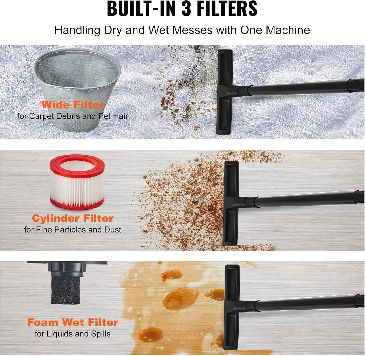- Efficient Filters: Equipped with three types of filters designed for specific cleaning needs, from floors and carpets to fine dust and liquid messes, this vacuum cleaner has you covered.