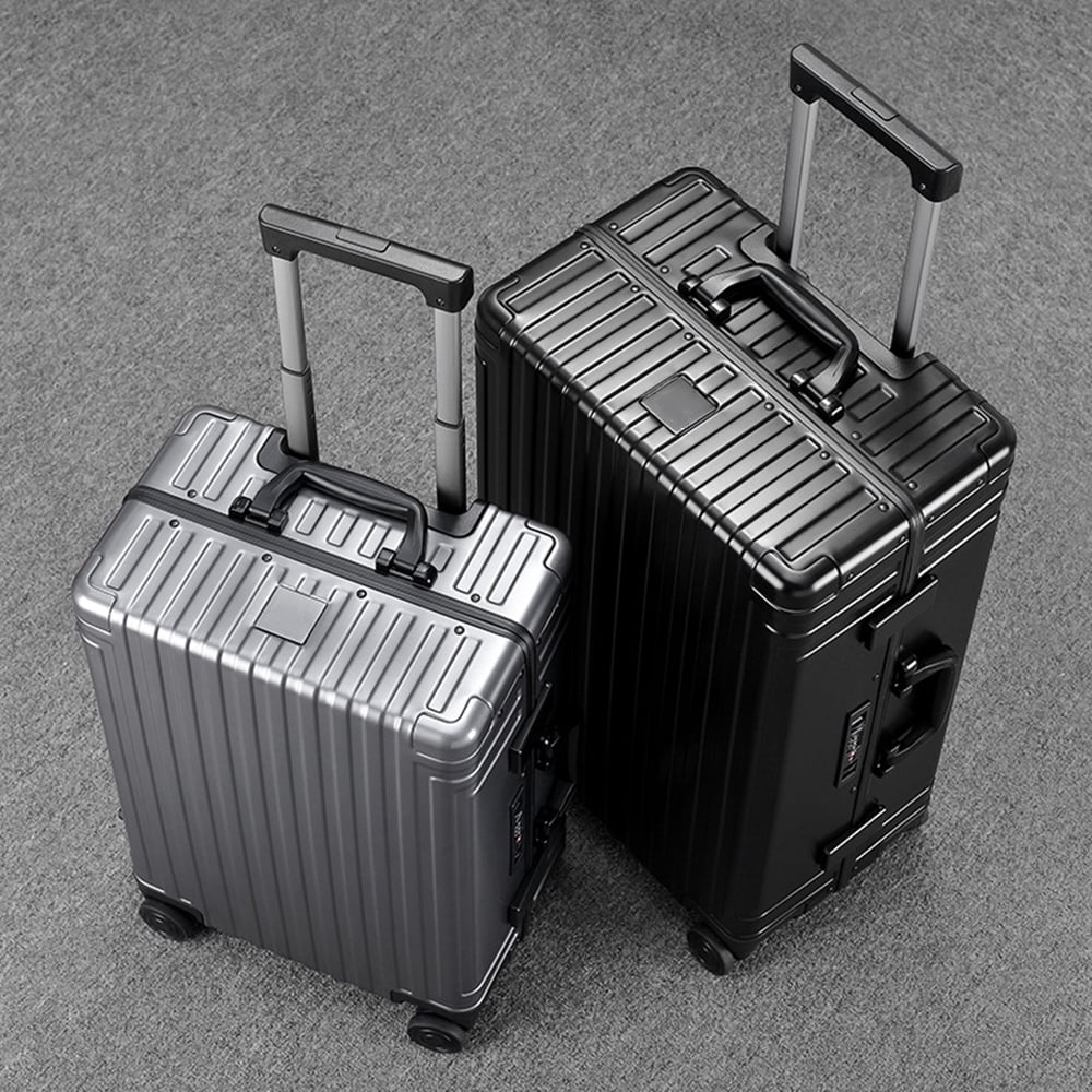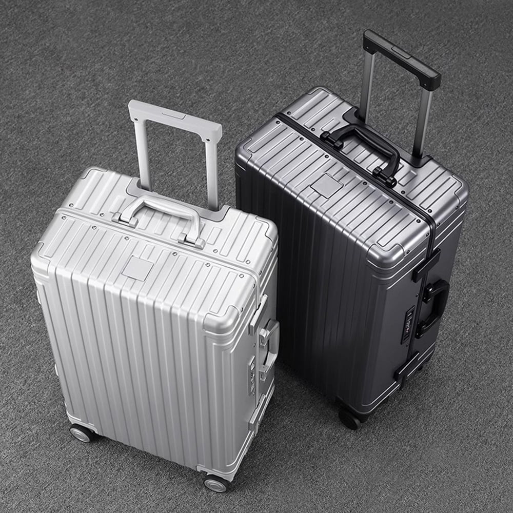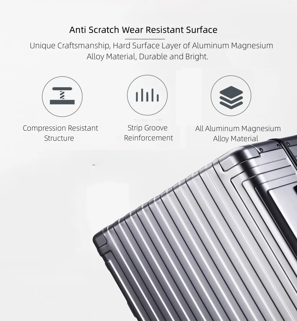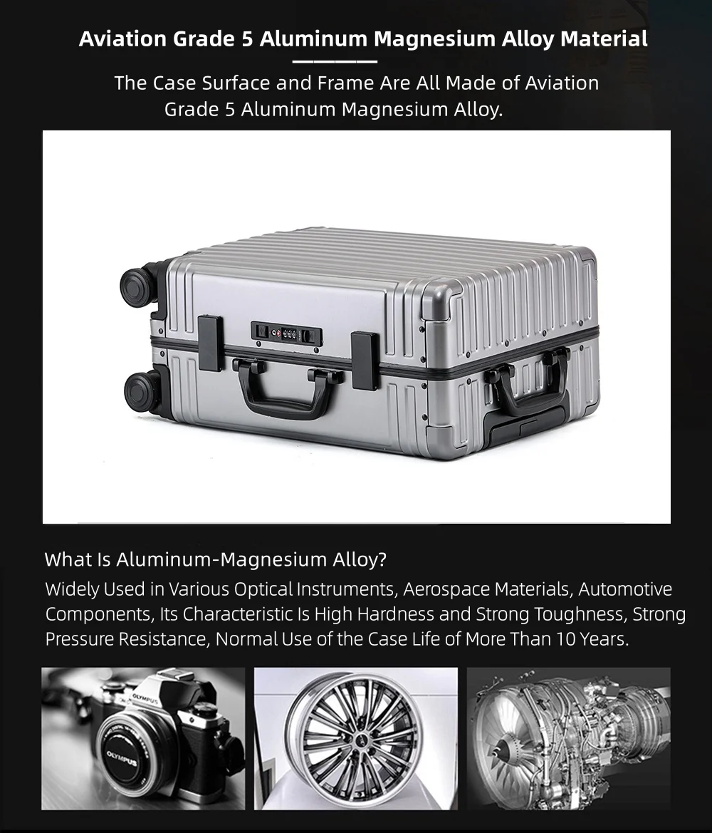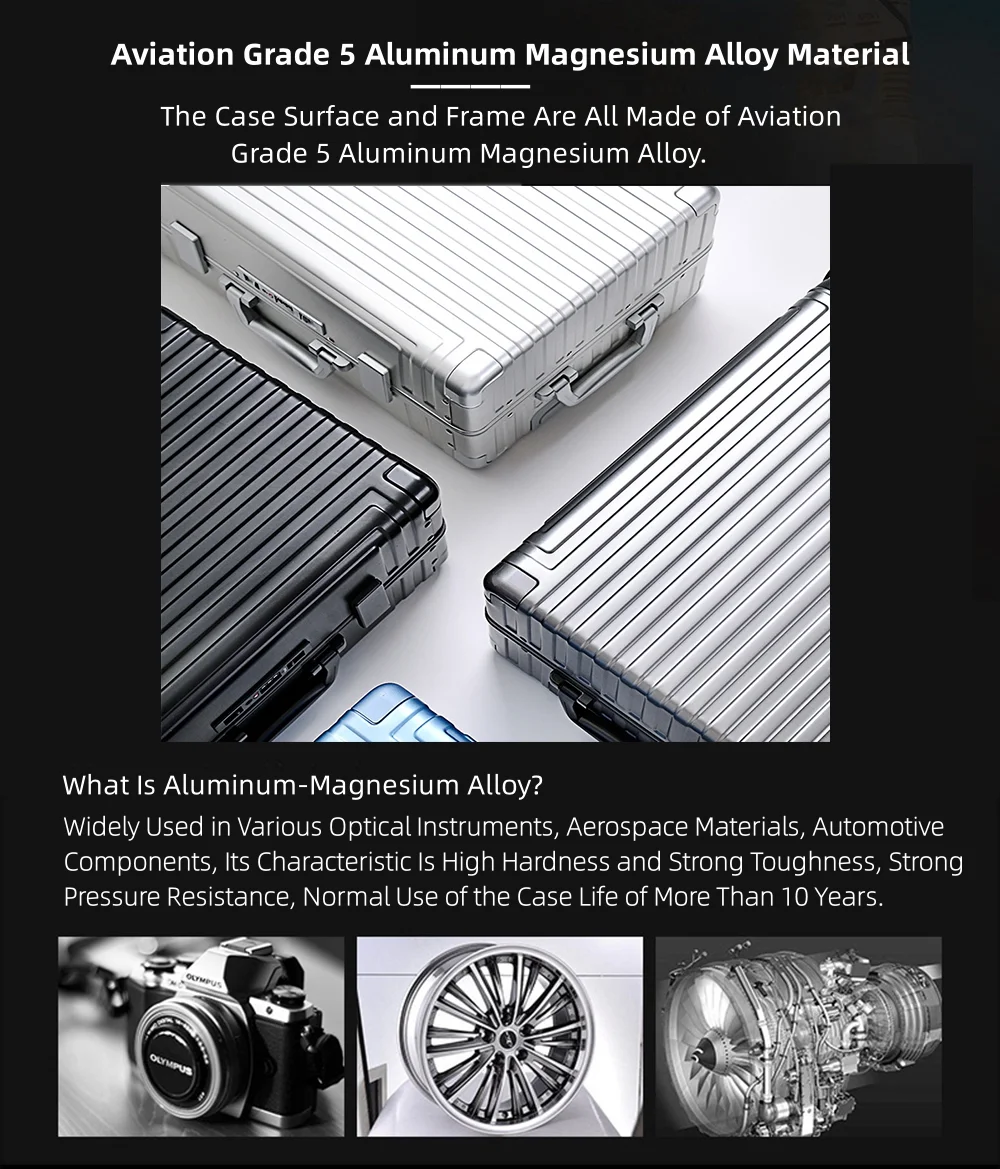 - Fashion All Aluminum Magnesium Alloy Hardside Carry on Luggage: The surface and frame of the Luggage are made of aviation grade 5 aluminum-magnesium alloy material, which is lighter, stronger and has better compressive strength. Aluminum magnesium alloy bumper corner to prevent impact. The luxury of the all aluminum suitcase with scratch resistant and beautiful shiny appearance is overwhelming.