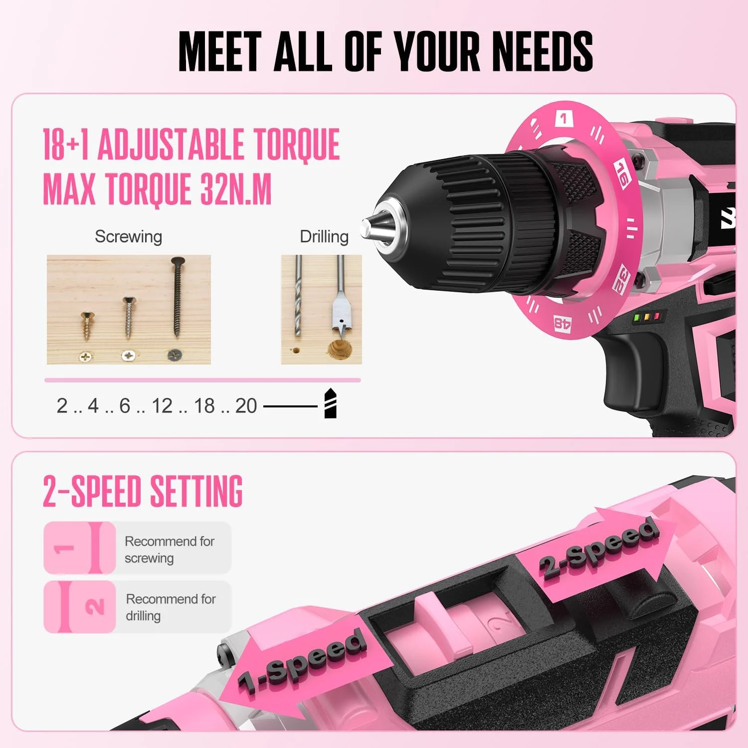 - ��20V CORDLESS PINK POWER DRILL ��Our electric drill driver supports 2-speed settings and 64+1 torque adjustments with a max torque of 32N.m, providing you with precise control. With LED light and variable speed trigger, and the 3/8" keyless chuck allows for quick accessory changes. Powered by a 20V 1500mAh battery and weighing just 2.6 lbs, lighter and stronger.