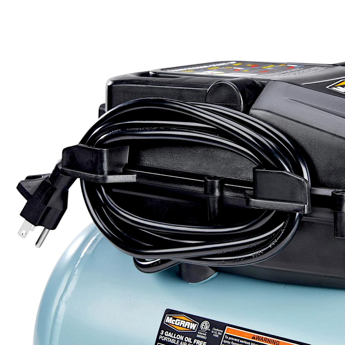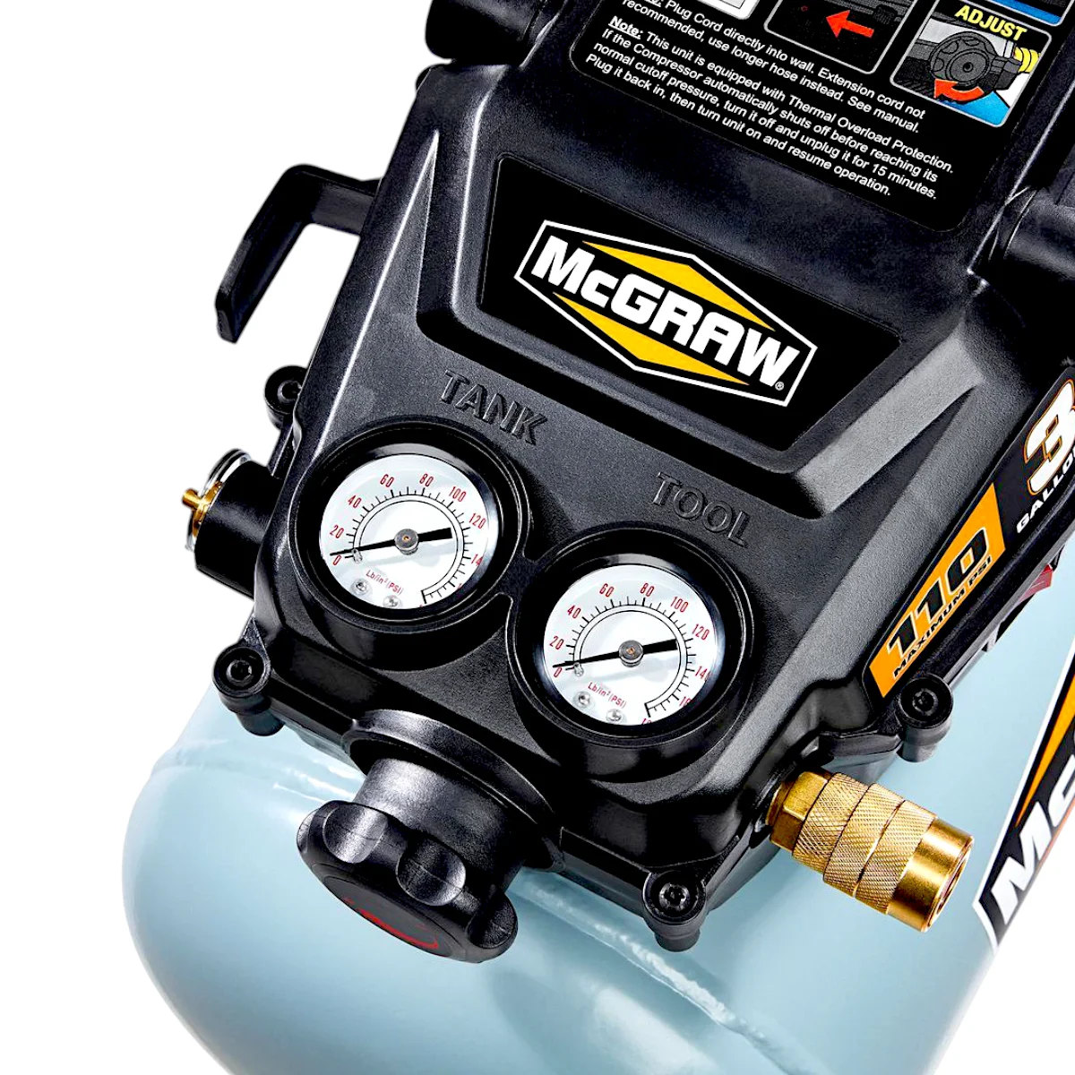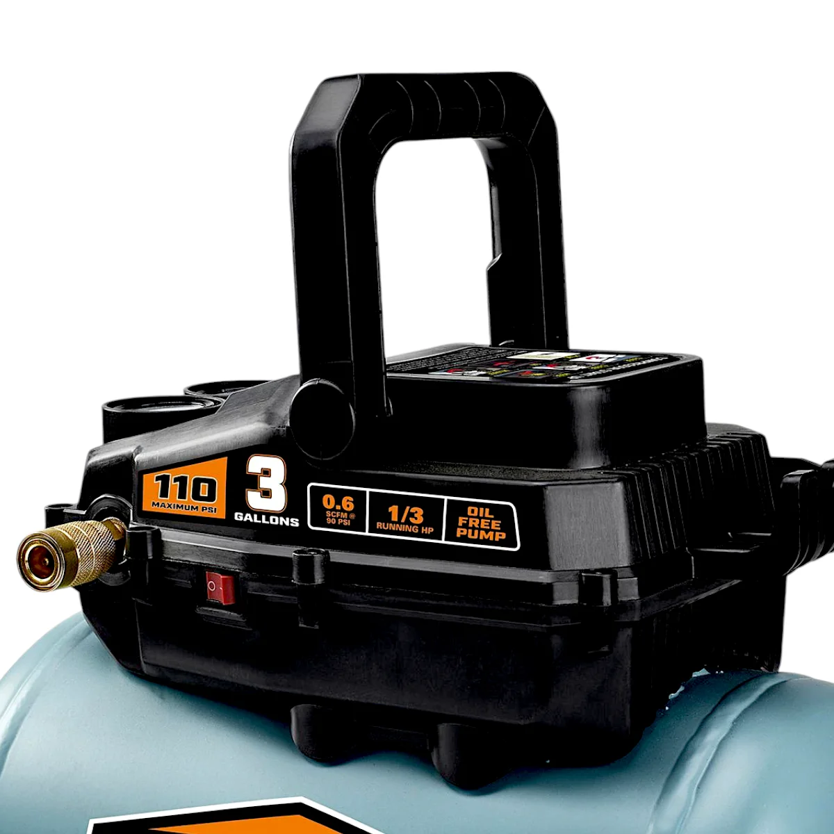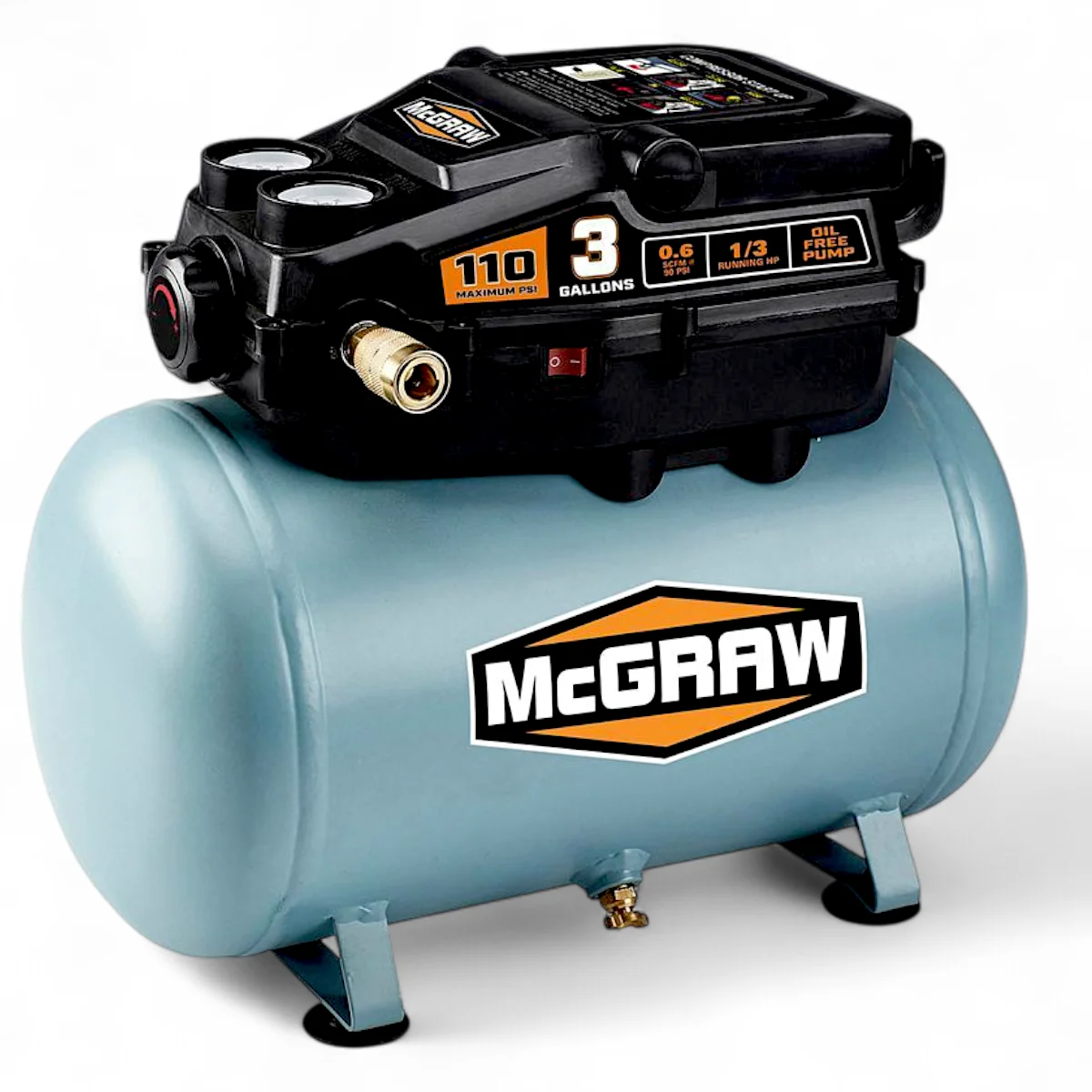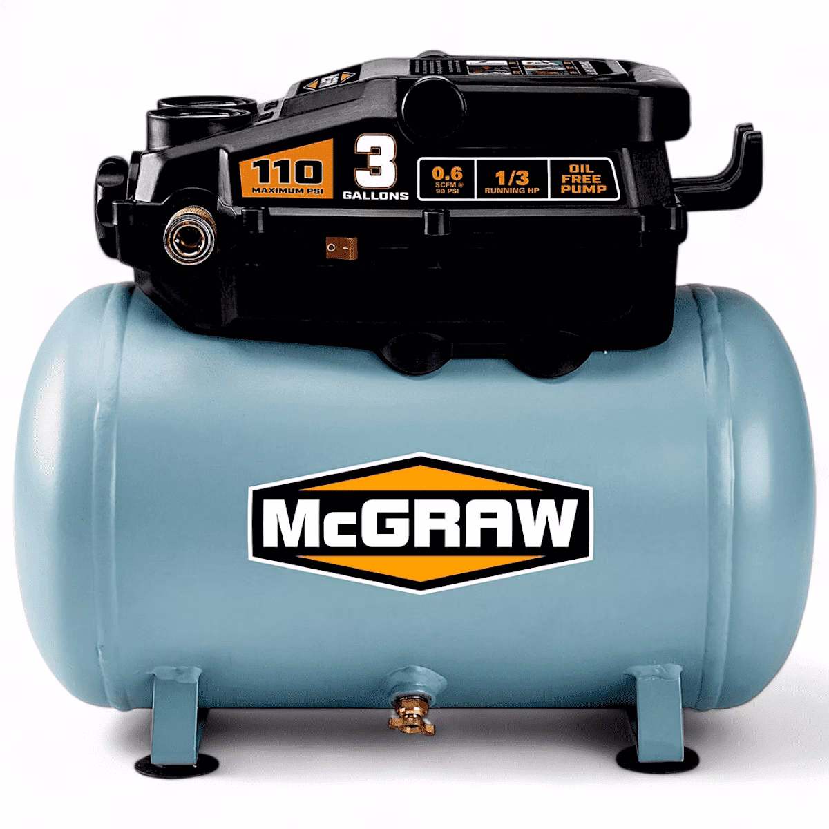 Specification Details Brand: MCGRAW Horsepower: 1/3 AC Volts: 120 Amperage: 3.4 Volume: 3 gallons Sound Rating: 84 dBA Working Pressure: 110 PSI Flow Rate: 0.6 SCFM @ 90 PSI, 0.9 SCFM @ 40 PSI Pump-Up Time: 214 seconds (0-110 PSI), 65 seconds (cut-in to cut-out) Product Weight: 15.2 lb. Shipping Weight: 18.92 lb. - .