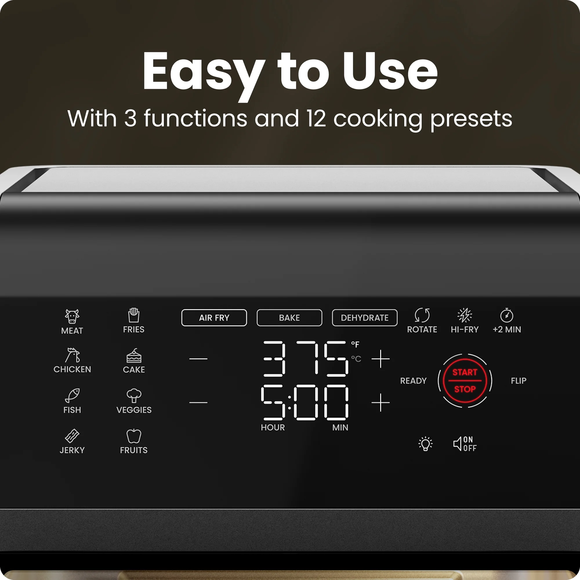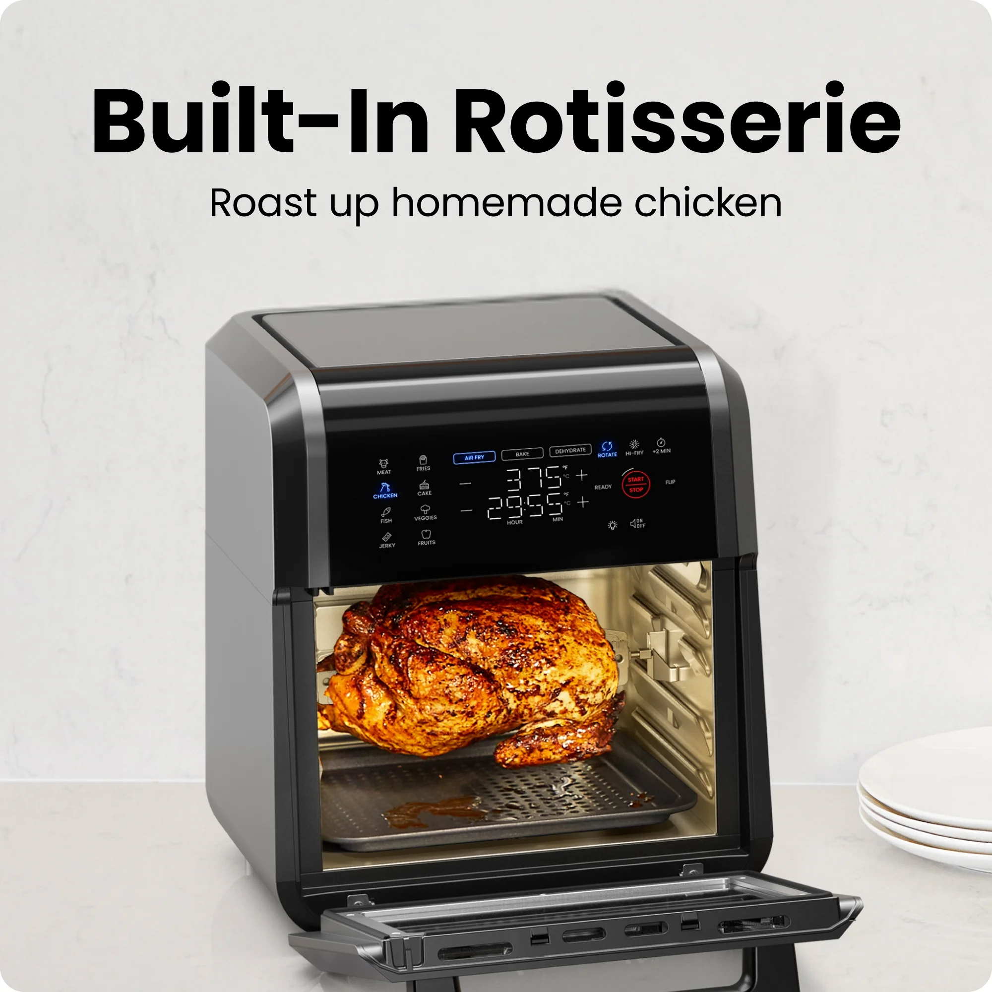 - DO IT ALL IN ONE: This versatile product functions as an air fryer, rotisserie spit, oven, and dehydrator, perfect for nearly any rapid cooking or baking task.?Make healthy fries with less or no oil for that perfectly crispy and tasty, roast a whole chicken, or?dehydrate that leftover produce you��ve been meaning to eat.