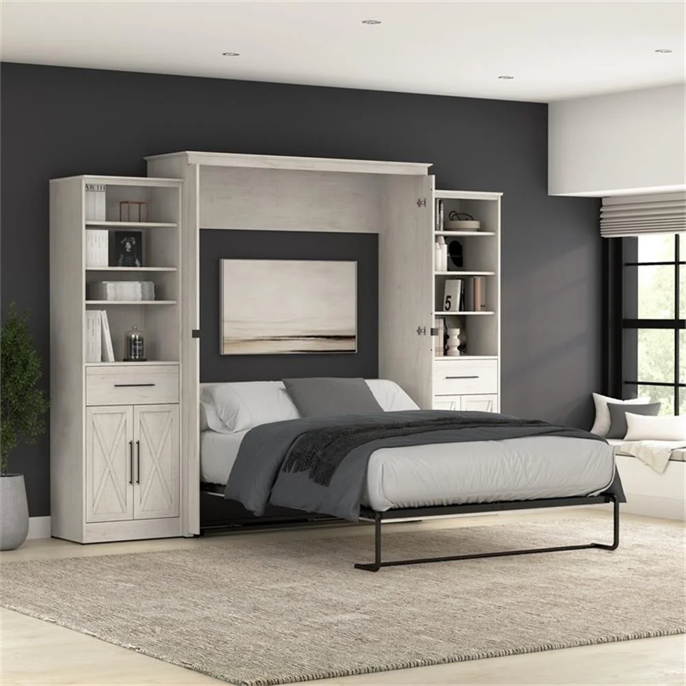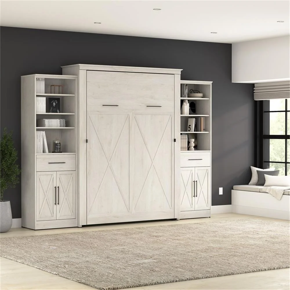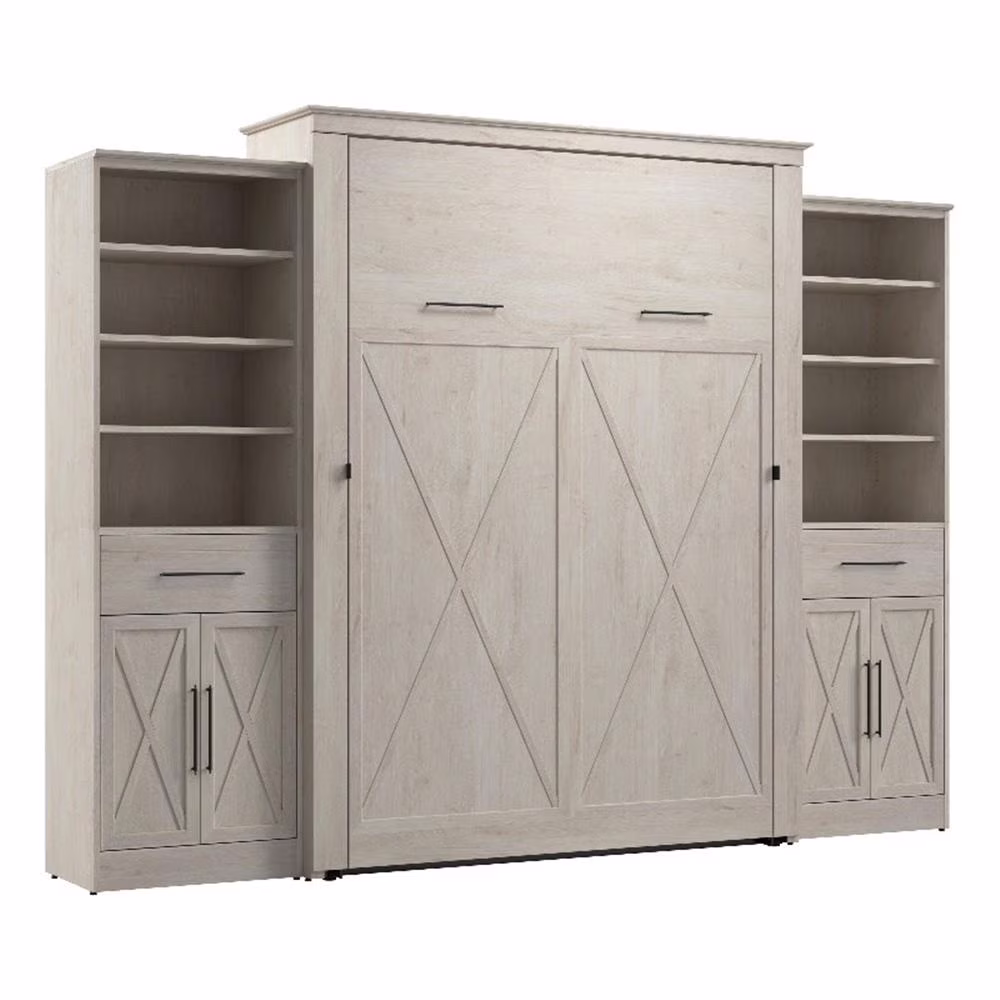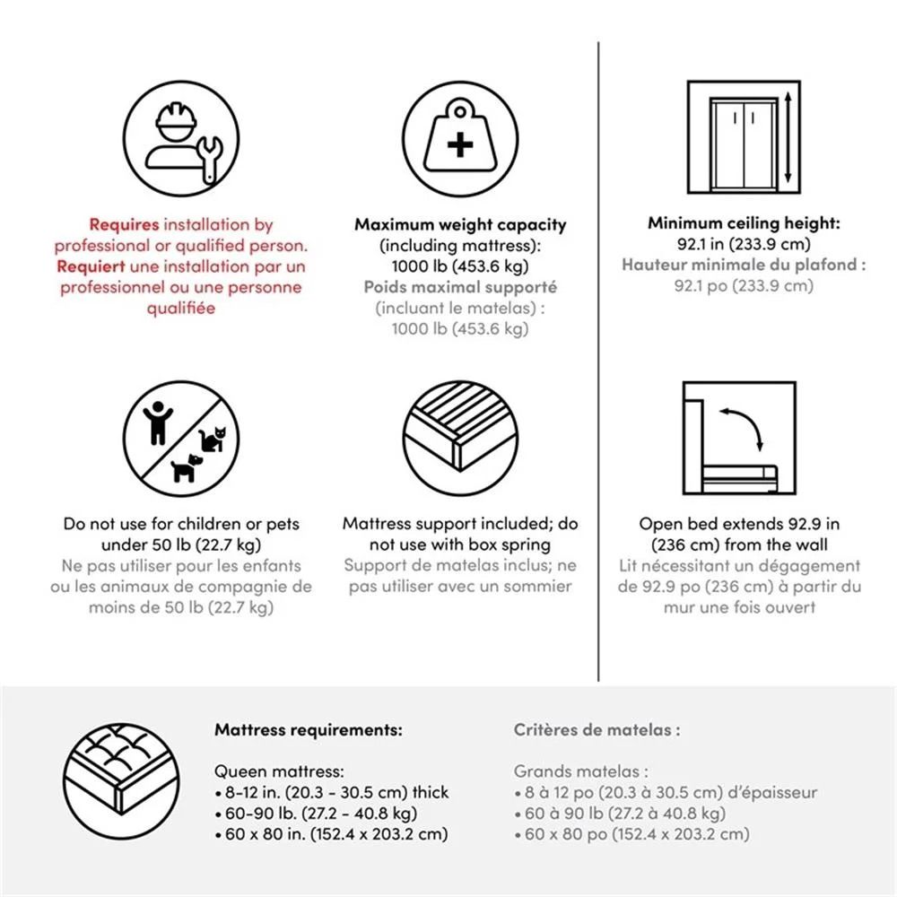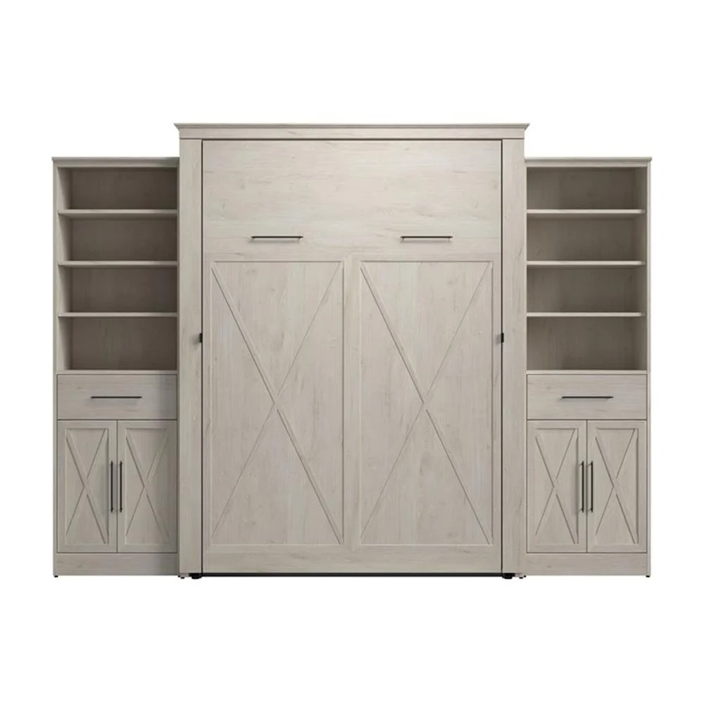 The Pemberly Row Queen Murphy Bed and Closet Organizers with Doors and Drawers (119W) is the ideal space saver for a multipurpose room. Unique X pattern accents and Antique Bronze hardware exude a relaxed farmhouse style. The bed folds up and down within seconds and accommodates most standard Queen mattresses. The dual-mount wall bed mechanism attaches to the floor and wall for maximum stability and durability. Minimum ceiling height of 92. 1 inches. To avoid risk of injury, the Murphy bed must be installed to wall and floor structure by a professional or qualified person. Two people are required for assembly. Installation requires attachment to wood studs or masonry, removal of the baseboard, and drilling into the floor. Necessary hardware is included. Do not use this product for children or pets under 50 pounds (22. 7?kg). The Murphy Bed is Backed by 10 Year Warranty.
