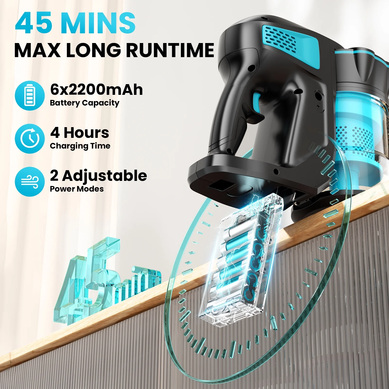 - Standard Mode (12Kpa): Suitable for daily cleaning (45 mins), provide long-term cleaning time, absorb dust, paper dust and hair