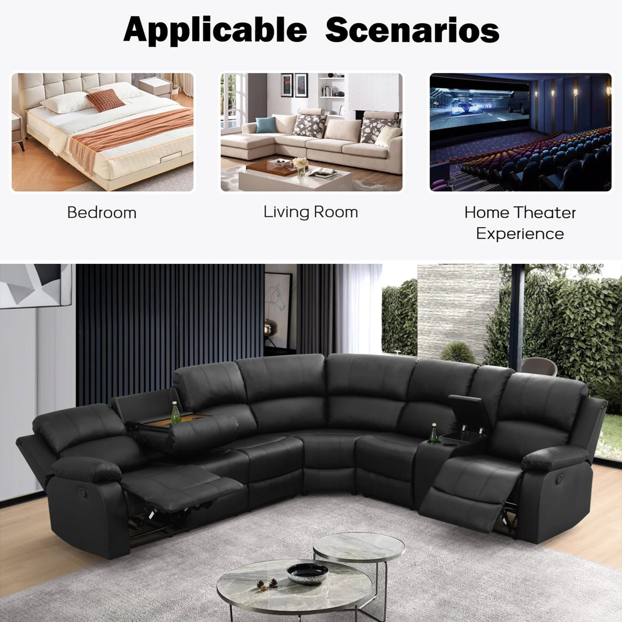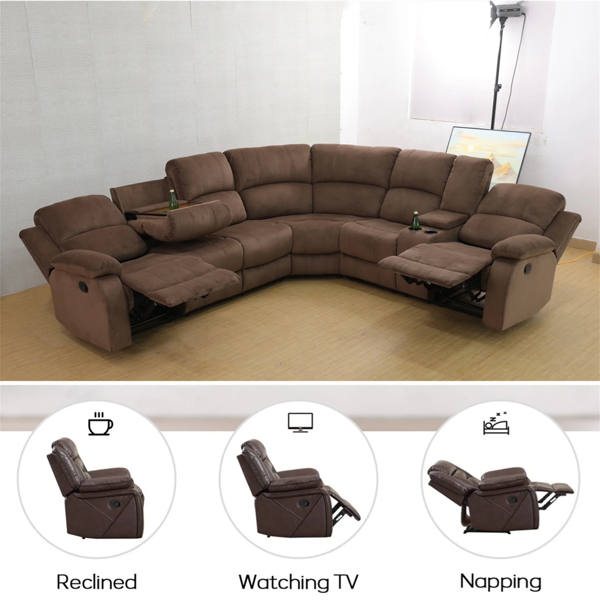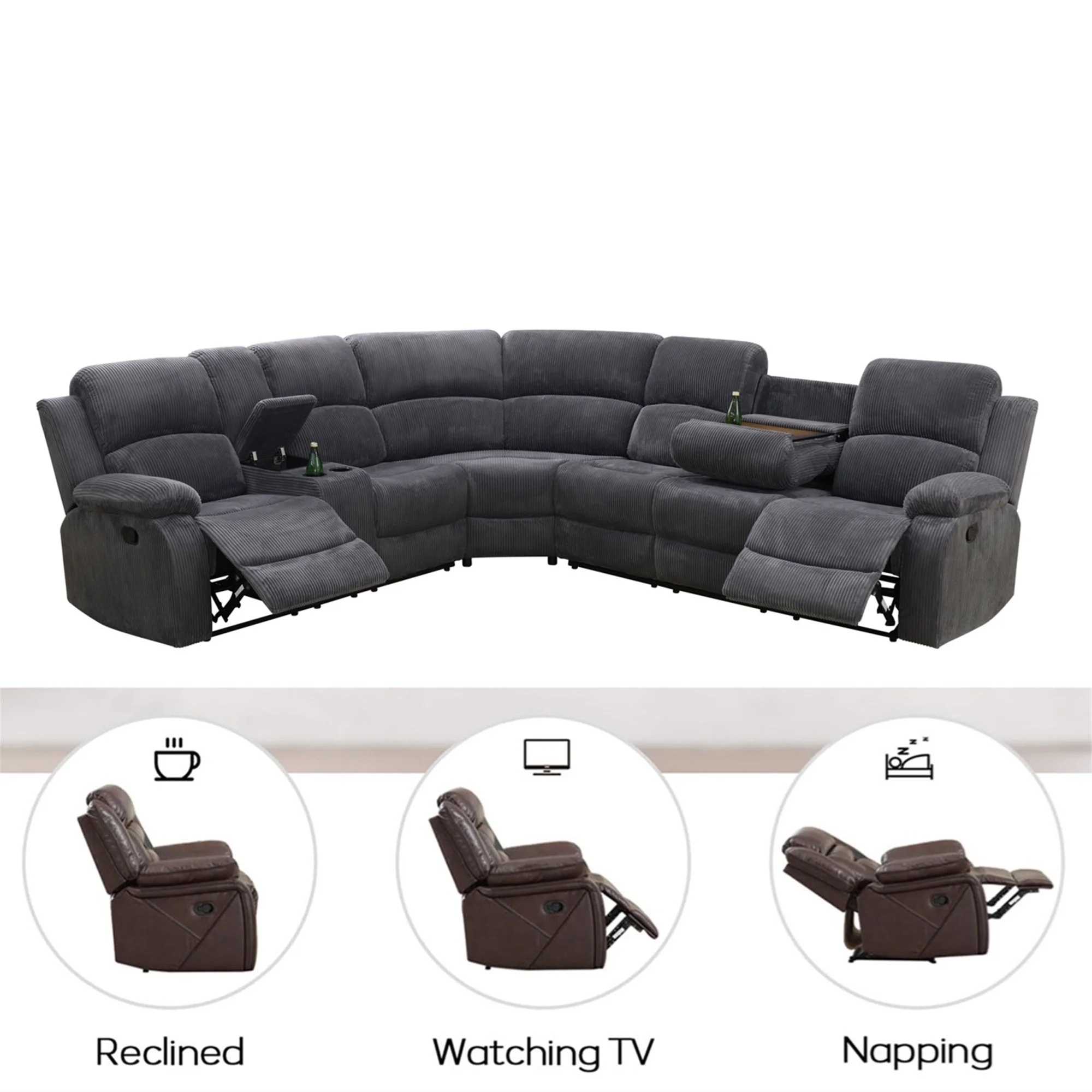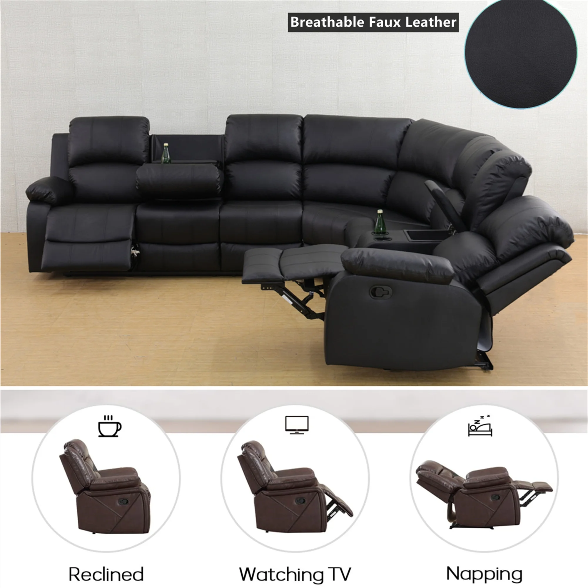 - INTIMATE DESIGN BRINGS YOU MORE - The reclining loveseat has dual cupholders in the middle and a middle storage console for storing sundries such as remotes, books, etc., greatly enhancing recliner space utilization. The 3 seater recliner sofa has a flip down table, which is the backrest of the middle seat, containing dual cup holders to hold coffee, drinks as well as books for enjoying your leisure time.