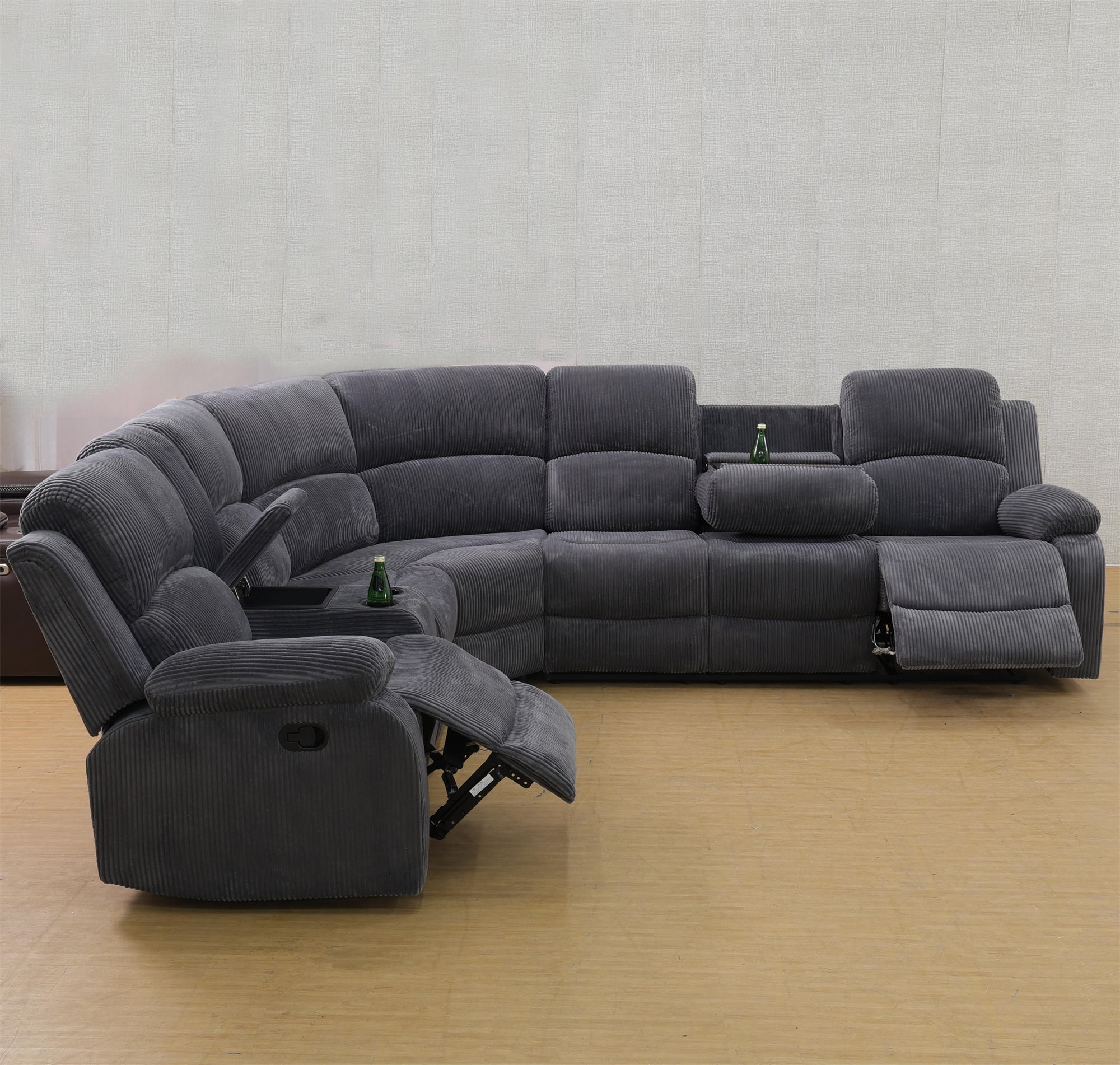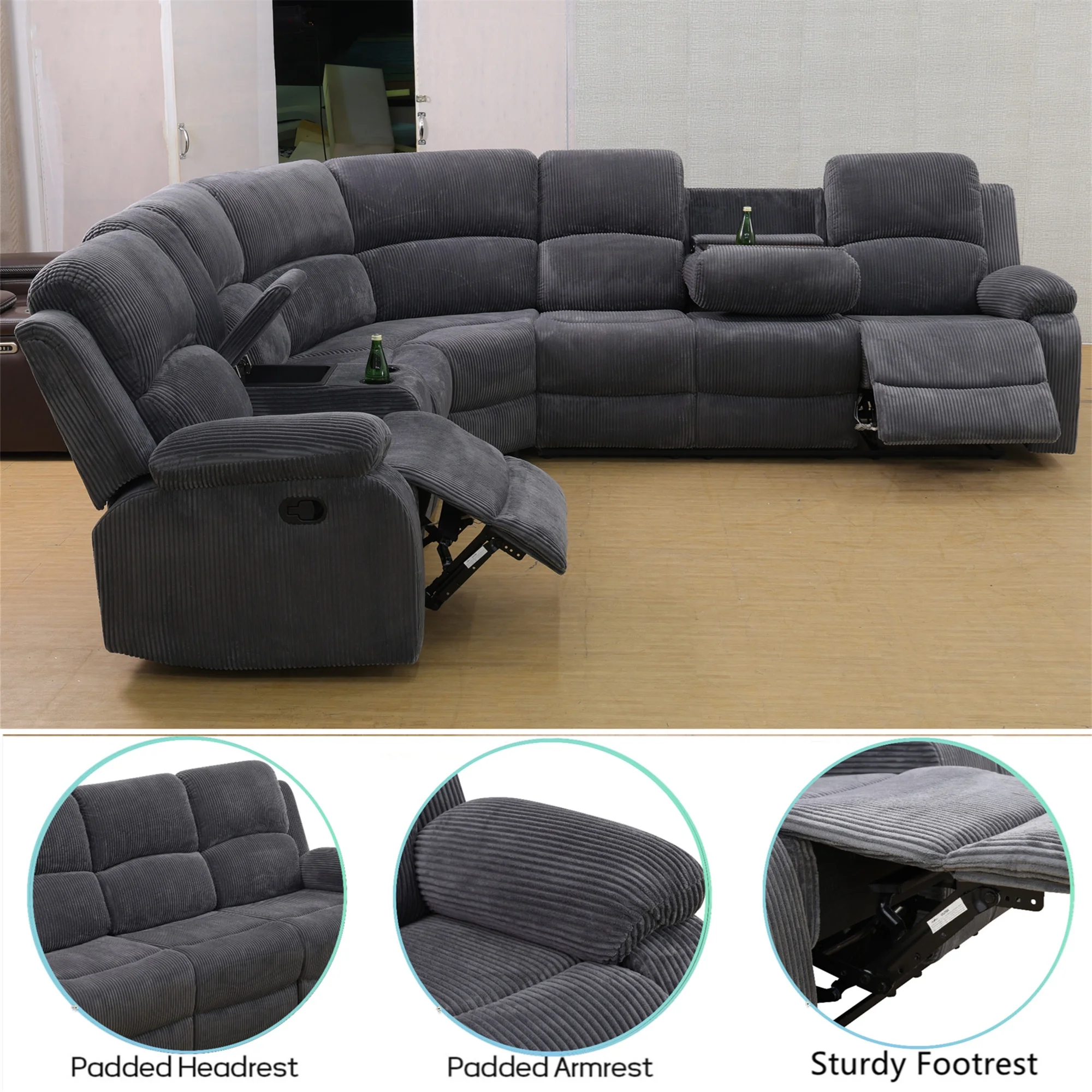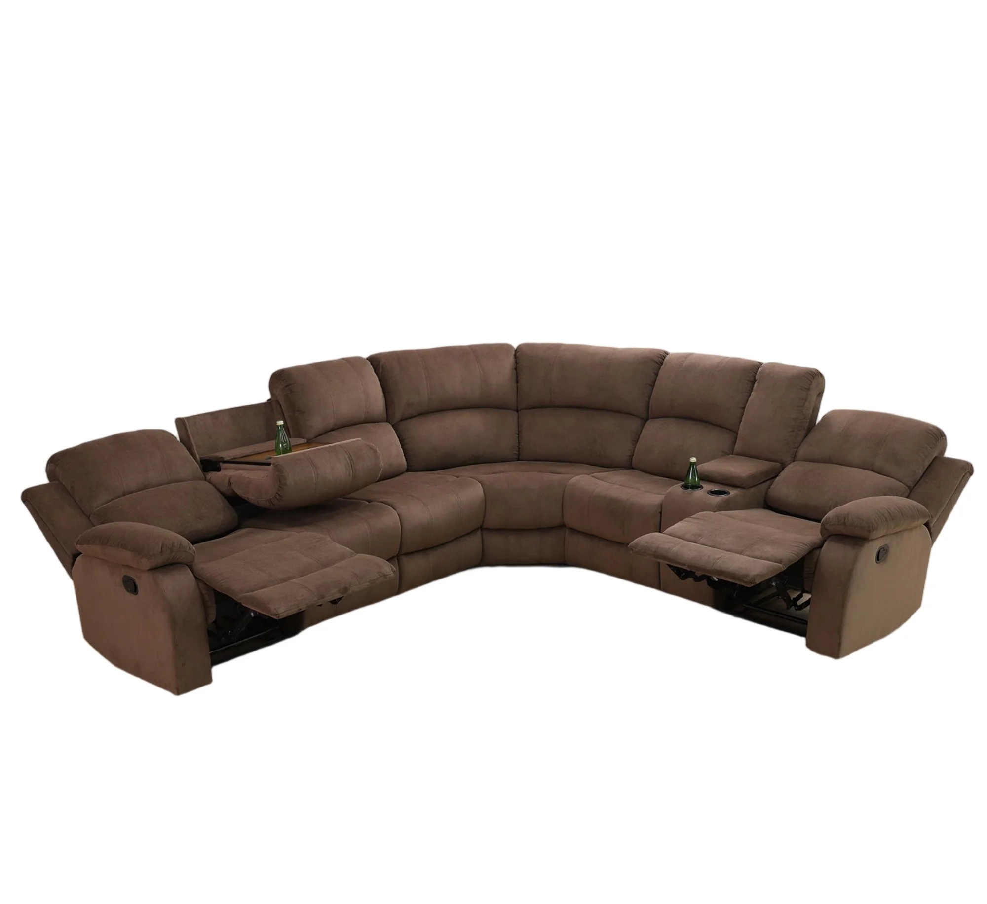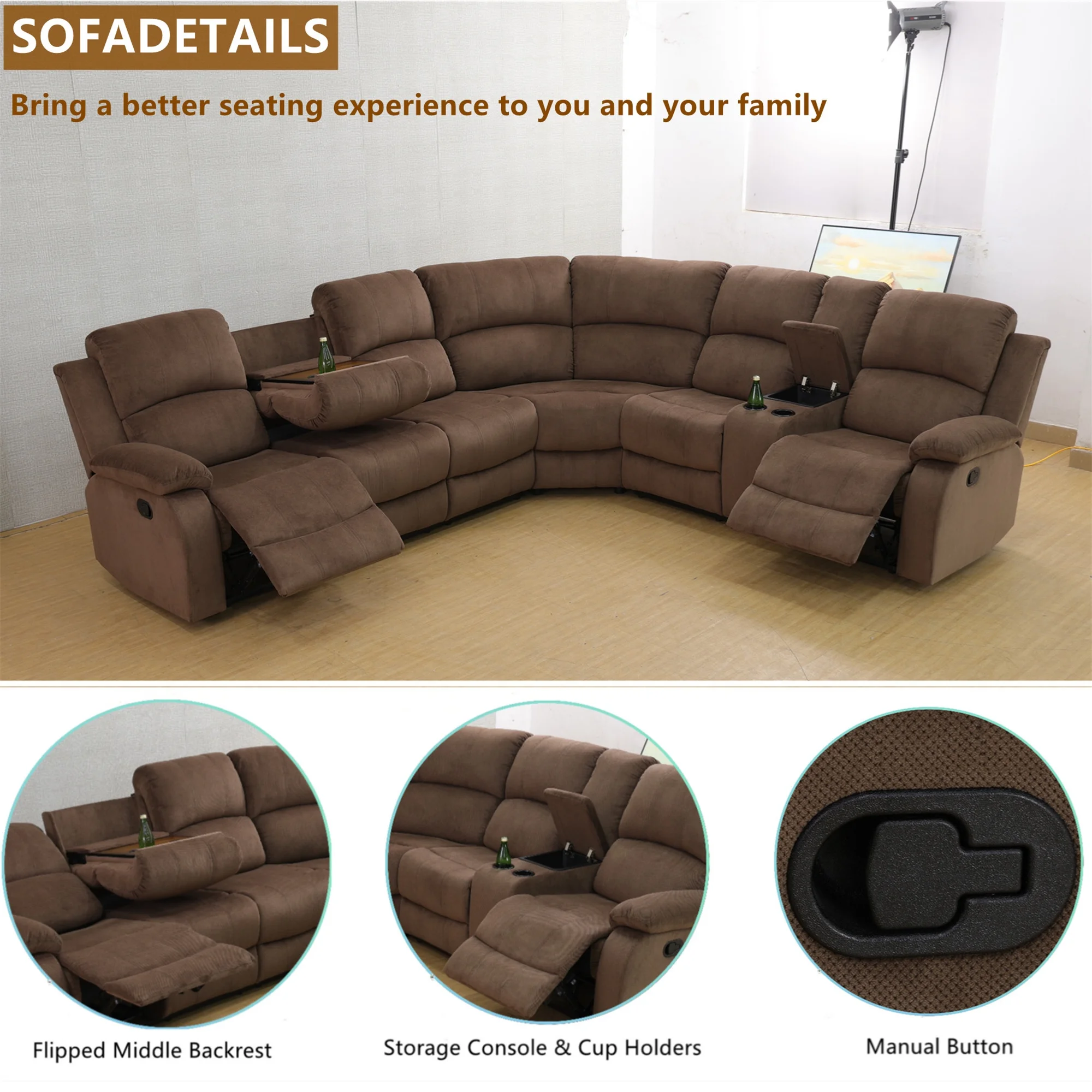 - INTIMATE DESIGN BRINGS YOU MORE - The reclining loveseat has dual cupholders in the middle and a middle storage console for storing sundries such as remotes, books, etc., greatly enhancing recliner space utilization. The 3 seater recliner sofa has a flip down table, which is the backrest of the middle seat, containing dual cup holders to hold coffee, drinks as well as books for enjoying your leisure time.