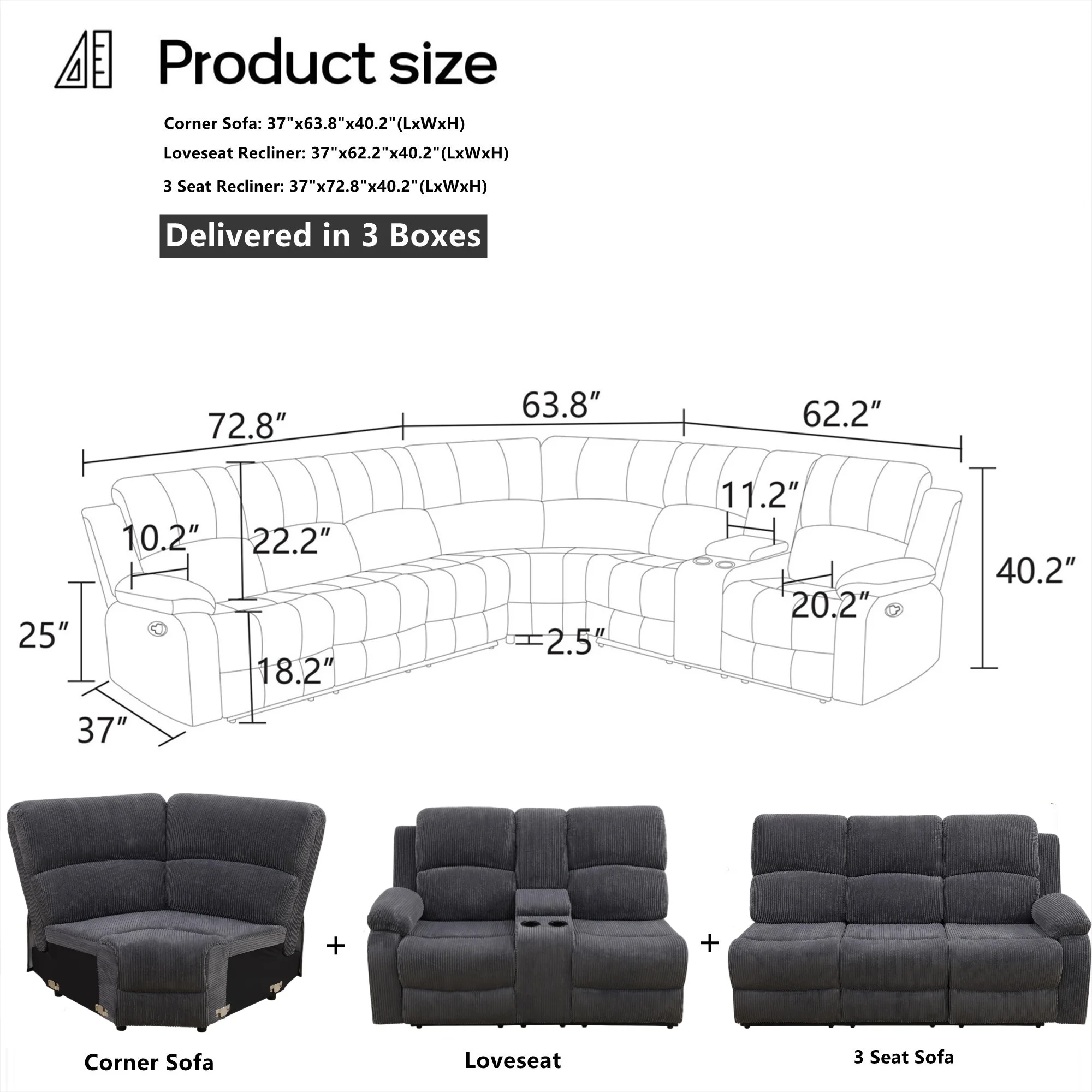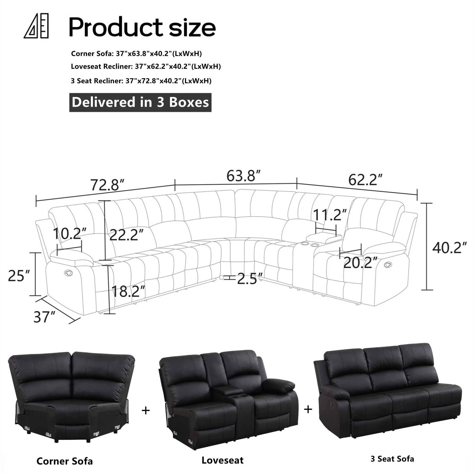 - Sofa: 37"L x 63.8"W x 40.2"H