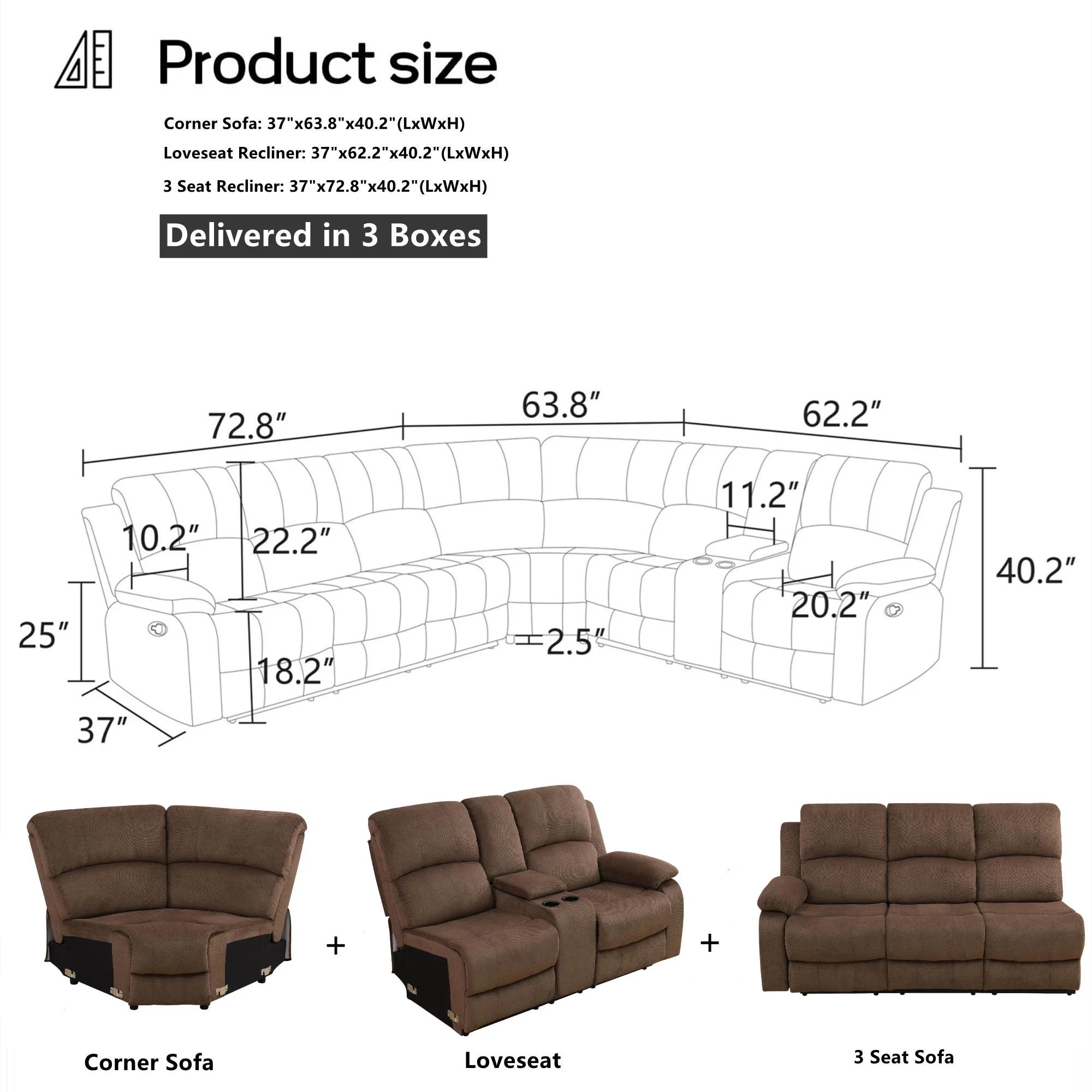 - Loveseat Recliner: 37"L x 62.2"W x 40.2"H