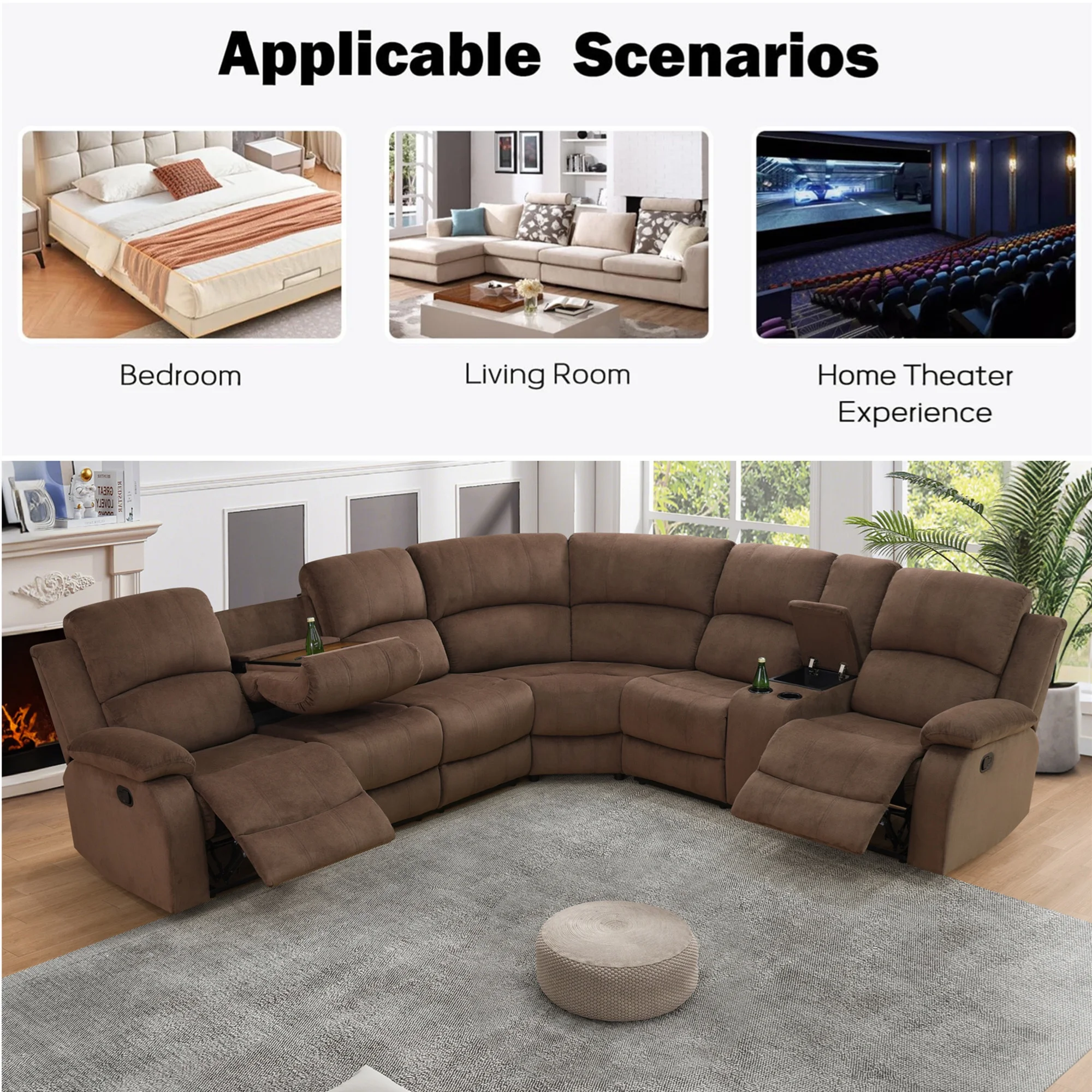 This Aukfa AK-FR01-069 3 piece recliner sofa set includes a flip console 3-seat recliner couch, a loveseat and a single recliner chair. This modern minimalist style sofa set fits effortlessly into all design and decor schemes to make your home look fresh, making it ideal for gatherings with family and friends, movie nights, and enjoyable chats with loved ones. When you want to recline, gently pull the switch on the side of the reclining sofa and the footrest will pop out. Use the strength of your back to lean back, the backrest can be adjusted between 110�� to 160�� allowing you to choose your favorite and most comfortable position to relax. Ergonomic design recliner's thick headrest, high backrest and wide armrests perfectly fit your body curves, and you will find the spacious seating area and extended footrest provide better support, effectively relieve fatigue and promote blood circulation for better sleep quality, make you refreshed and rejuvenated every day. Perfect for movie nights with the family, the loveseat recliner's middle backrest can be folded down to become a table for drinks and food. In addition, the home theater loveseat recliner sofa is equipped with cup holder and storage console, greatly enhancing recliner space utilization. Exquisite workmanship and high quality are our foundation, the love seat recliners are skin-friendly, with soft fabric and high elasticity memory foam, giving you cloud-like comfort and warmth. Each sturdy frame has been rigorously tested 20,000 times and can support up to 350 LB per seat. A perfect gift for your loved ones, our RV recliners couch sets come 90% pre-assembled and can be assembled with ease. To ensure that each part is well protected during shipping, we pack them in 3 boxes that may not arrive at the same time. We value every customer and any questions or concerns will be answered within 24 hours.