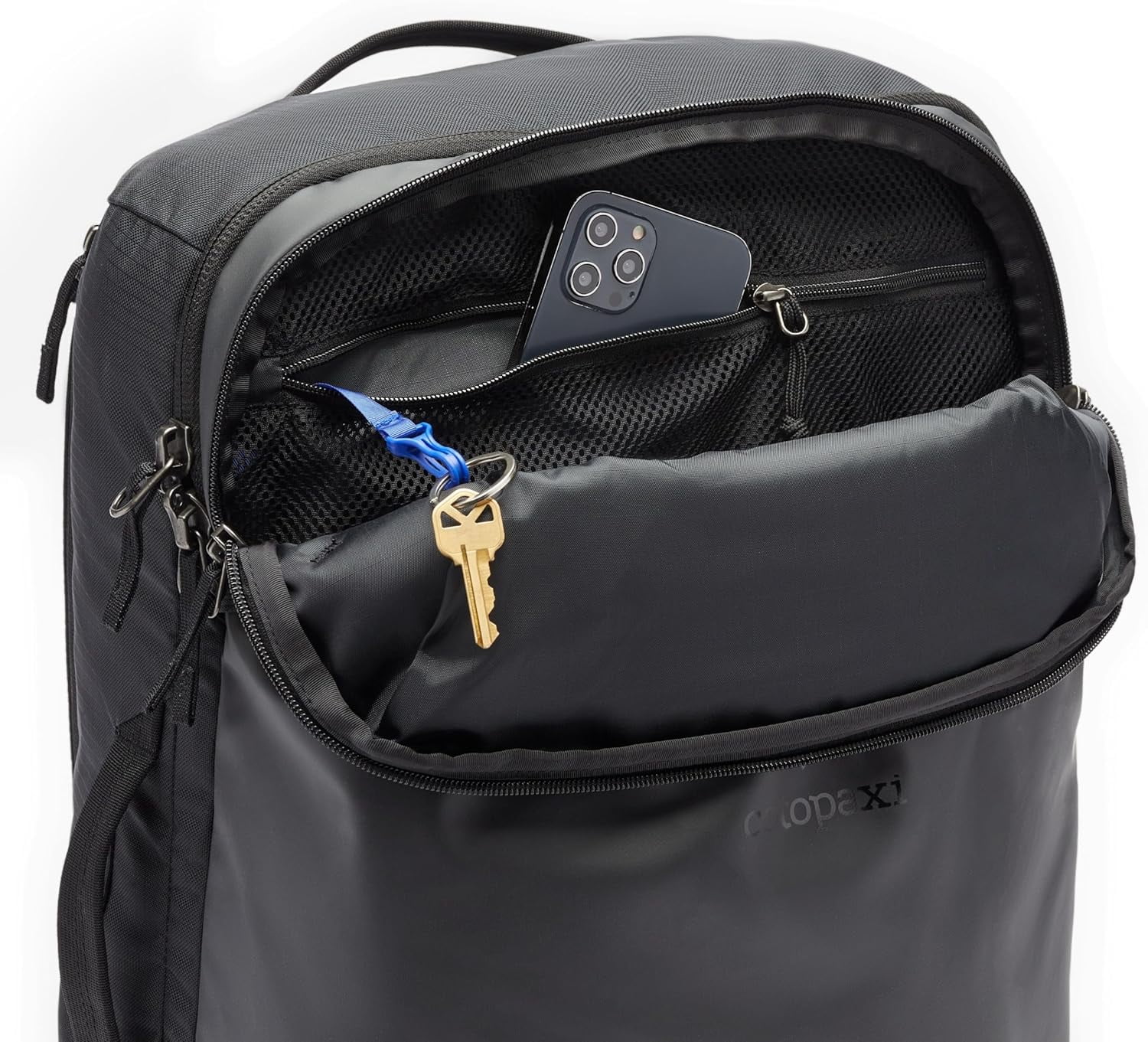 - Stretch mesh water bottle pocket (up to 1L), Front zip accessory pocket with internal organization & key clip