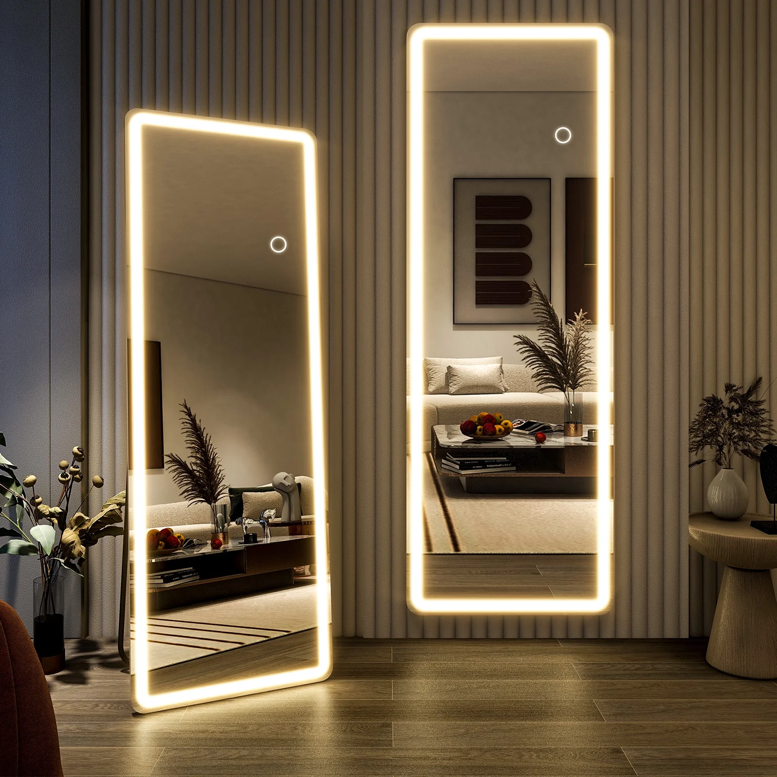 Modern LED Design: This floor mirror features a sleek rectangular frame with rounded corners and built-in LED lights, adding a stylish touch to any room.